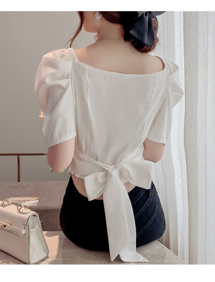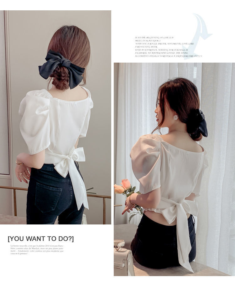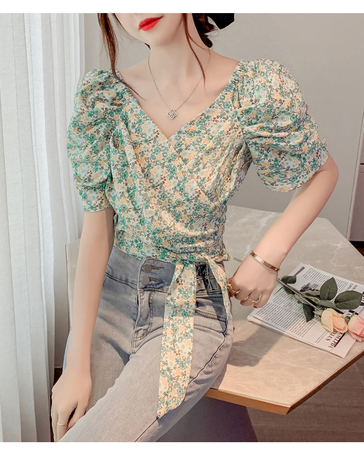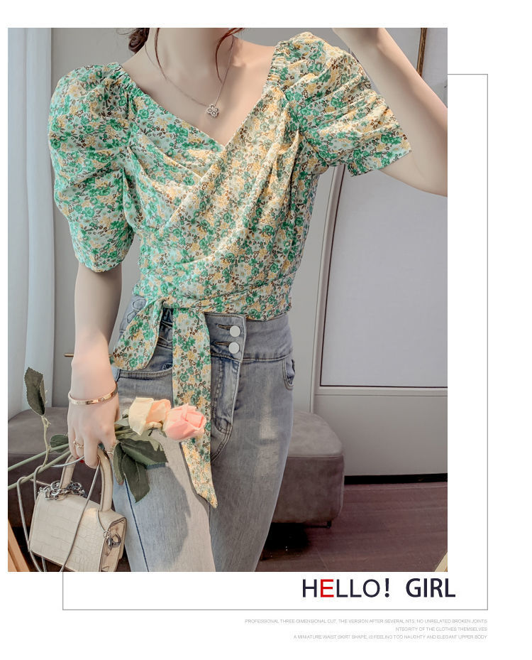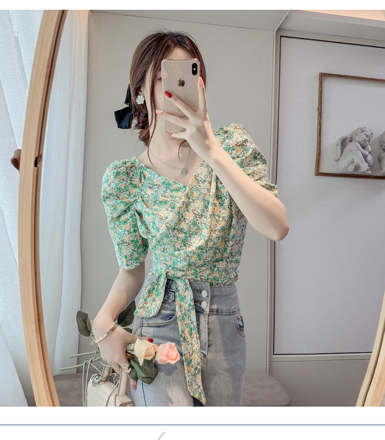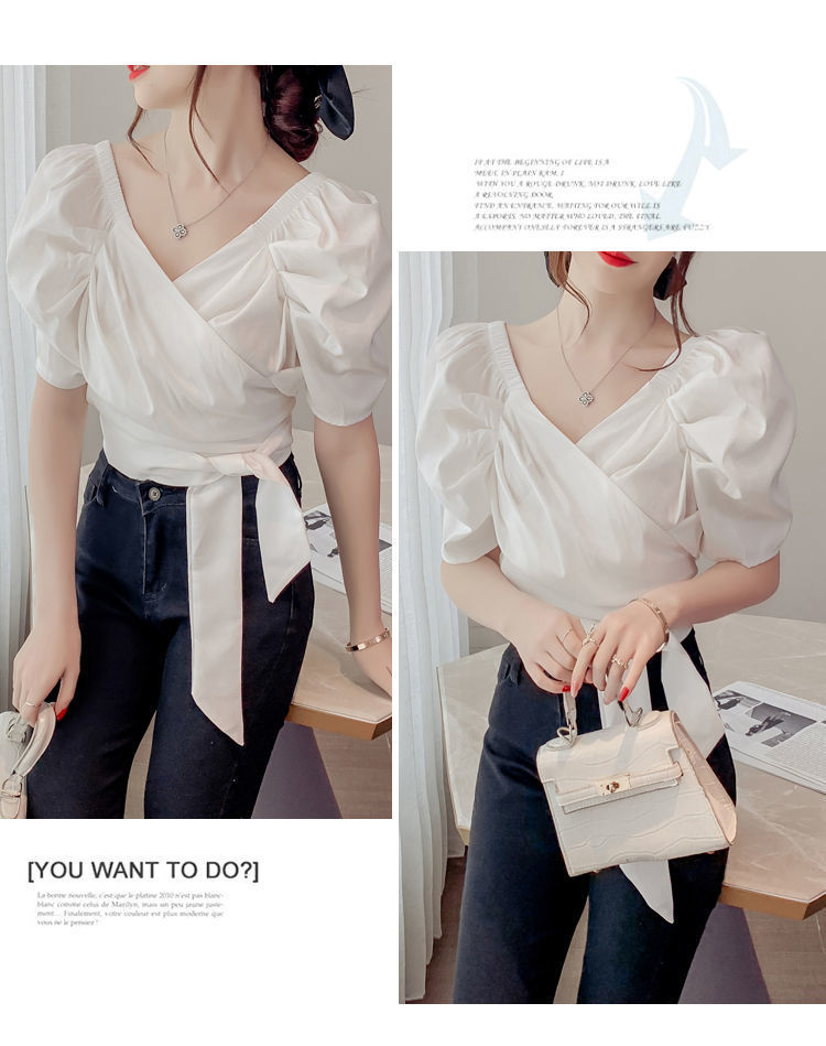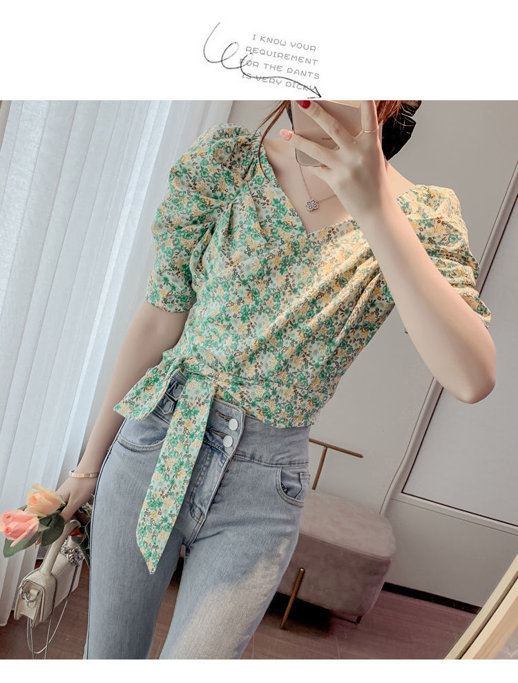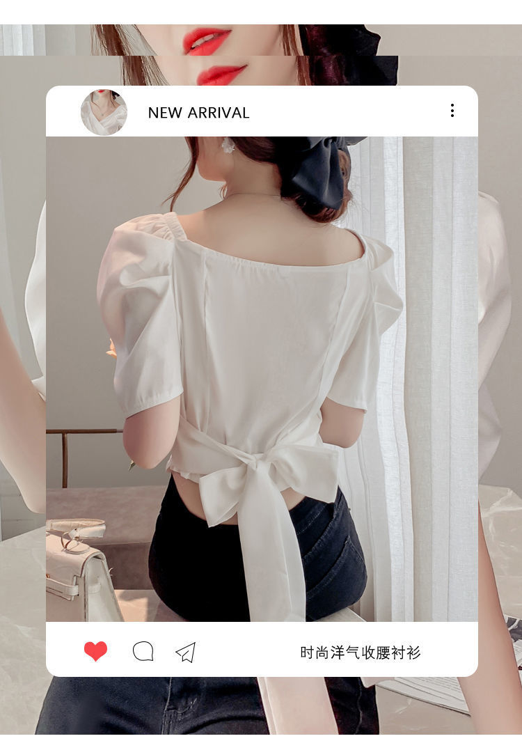 Y 새로운 도착 예쁜 작은 셔츠 반팔 여름 여성 쉬폰 셔츠 프랑스 짧은 스트랩 타이트 허리 나비 칙 작은스토어 가기