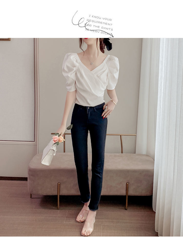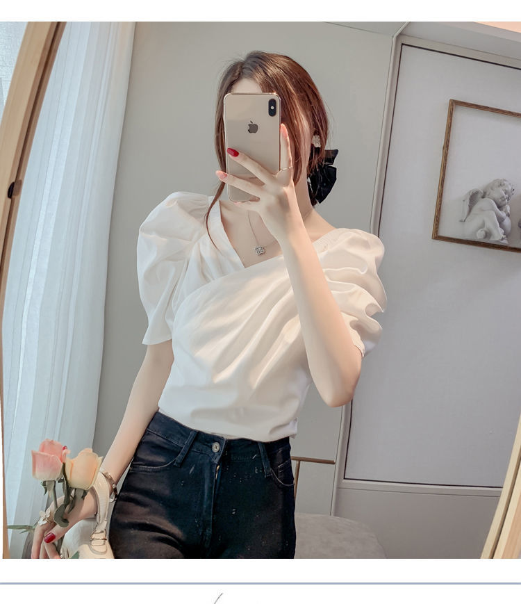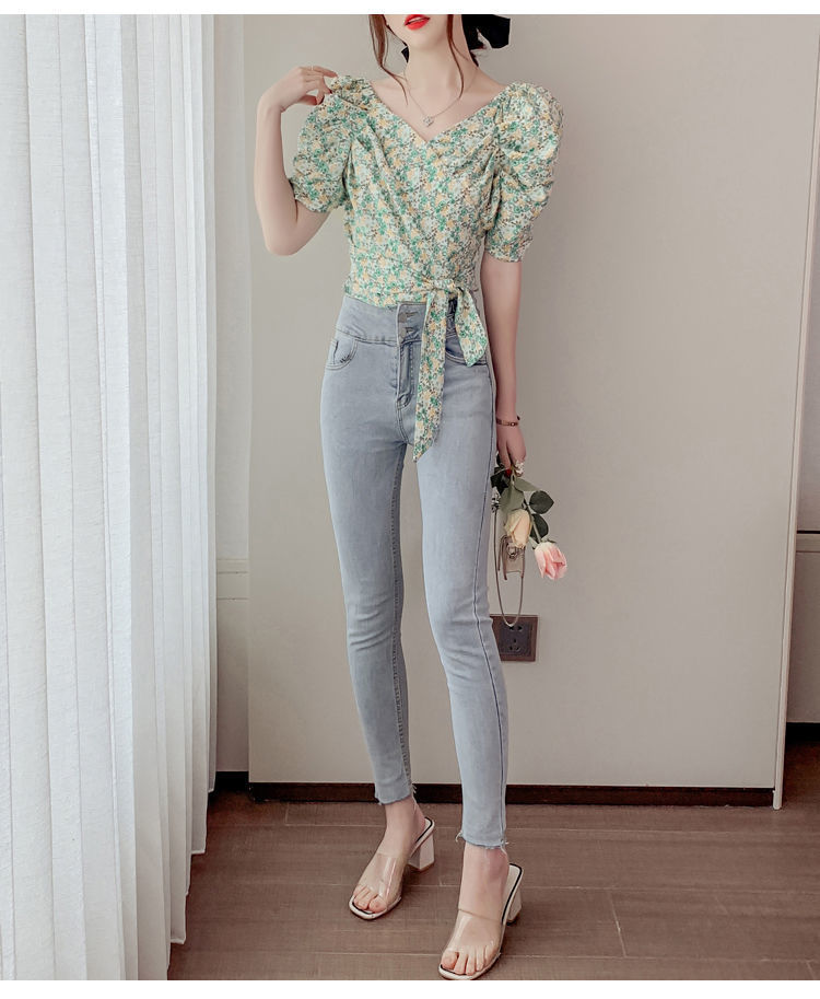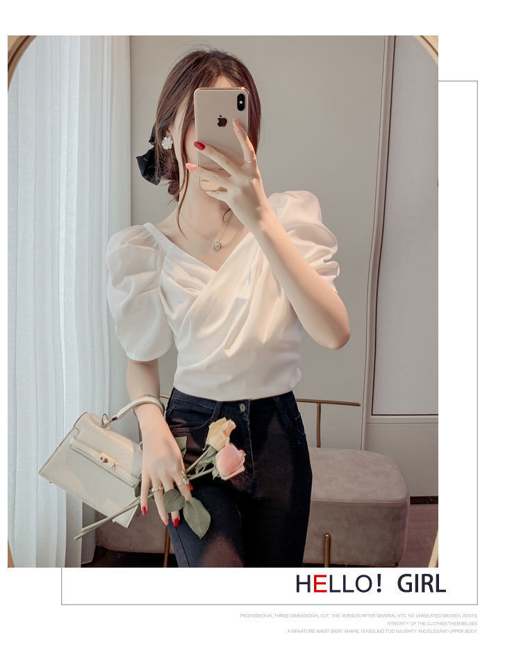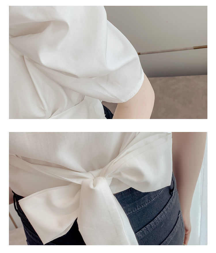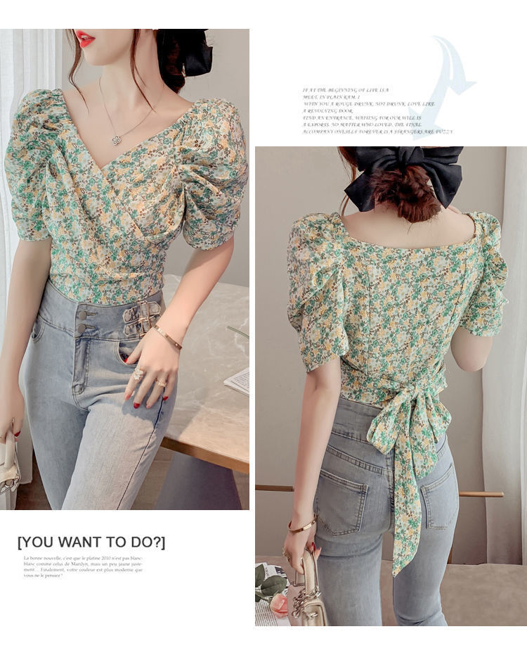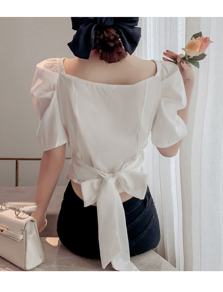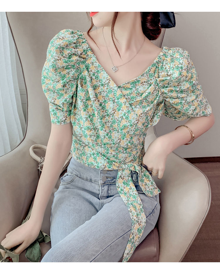 Y 새로운 도착 예쁜 작은 셔츠 반팔 여름 여성 쉬폰 셔츠 프랑스 짧은 스트랩 타이트 허리 나비 칙 작은스토어 가기
