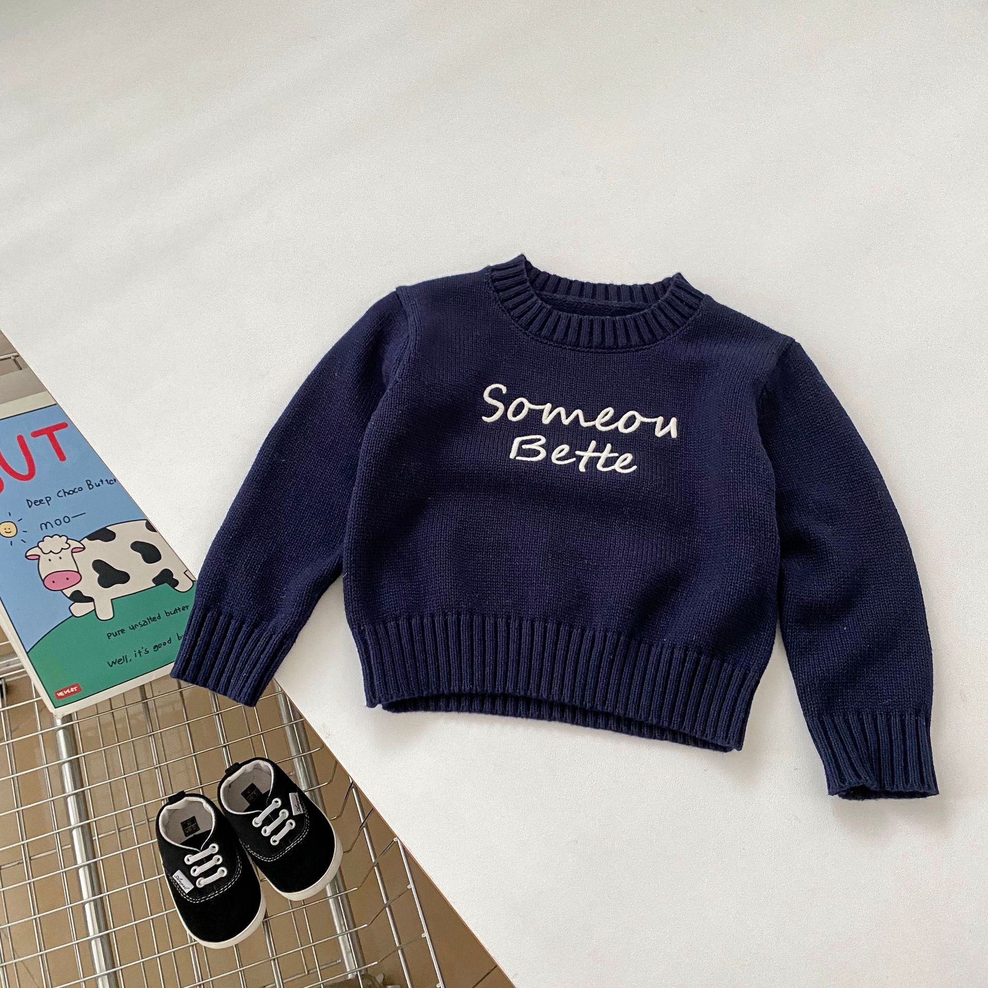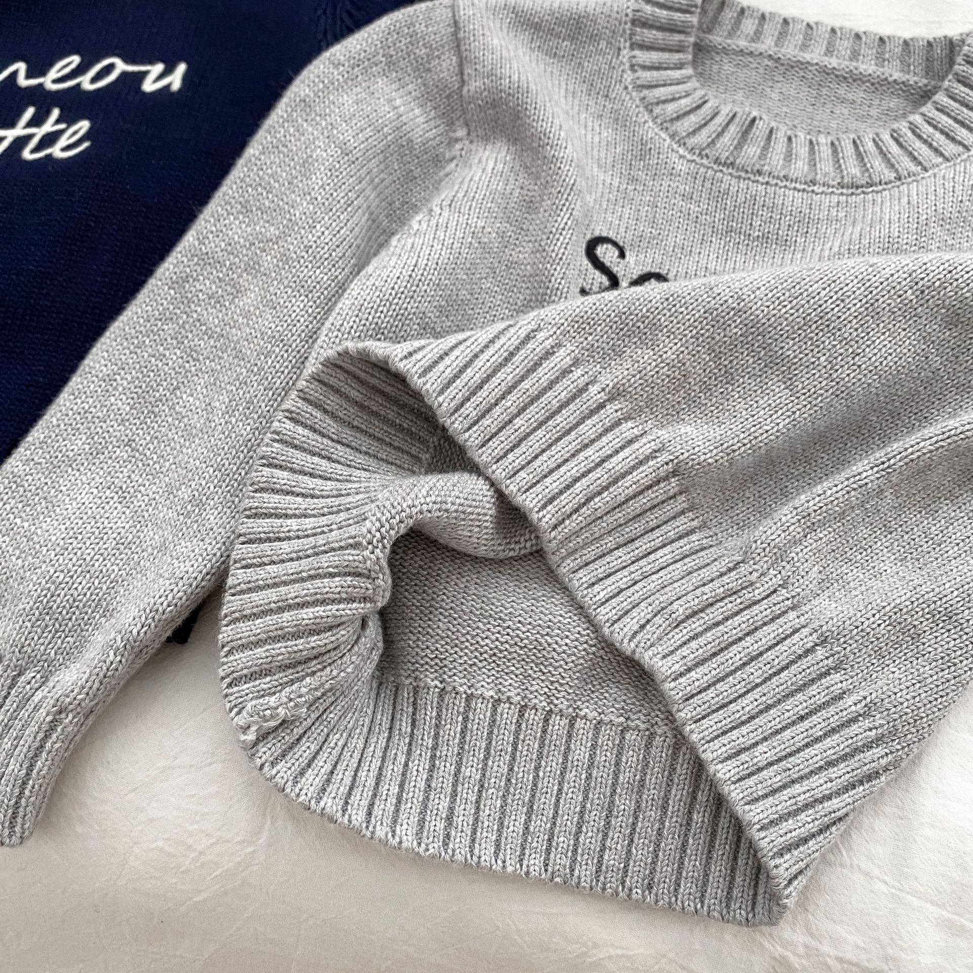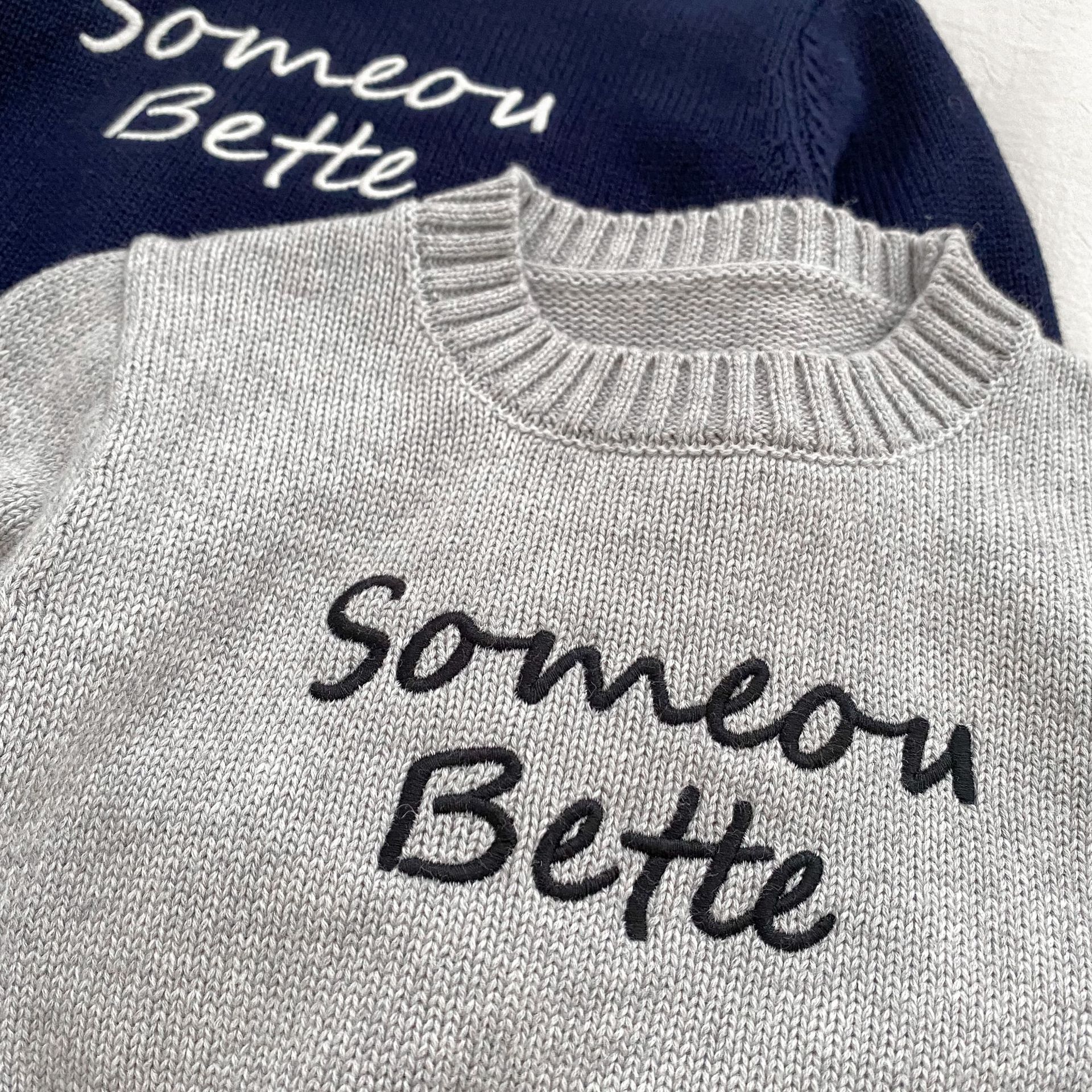 2024 새로운 어린이 캐주얼 올 매치 레터 니트 탑 크루 넥 스웨터 풀오버 청바지 투피스 세트스토어 가기