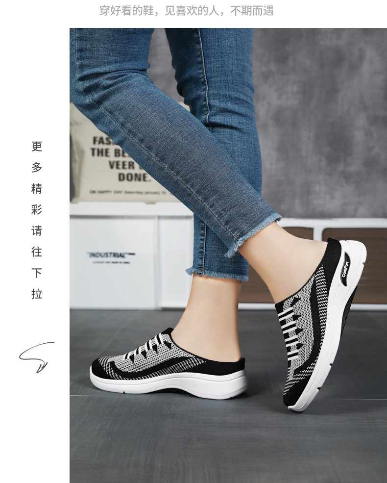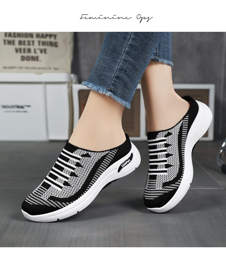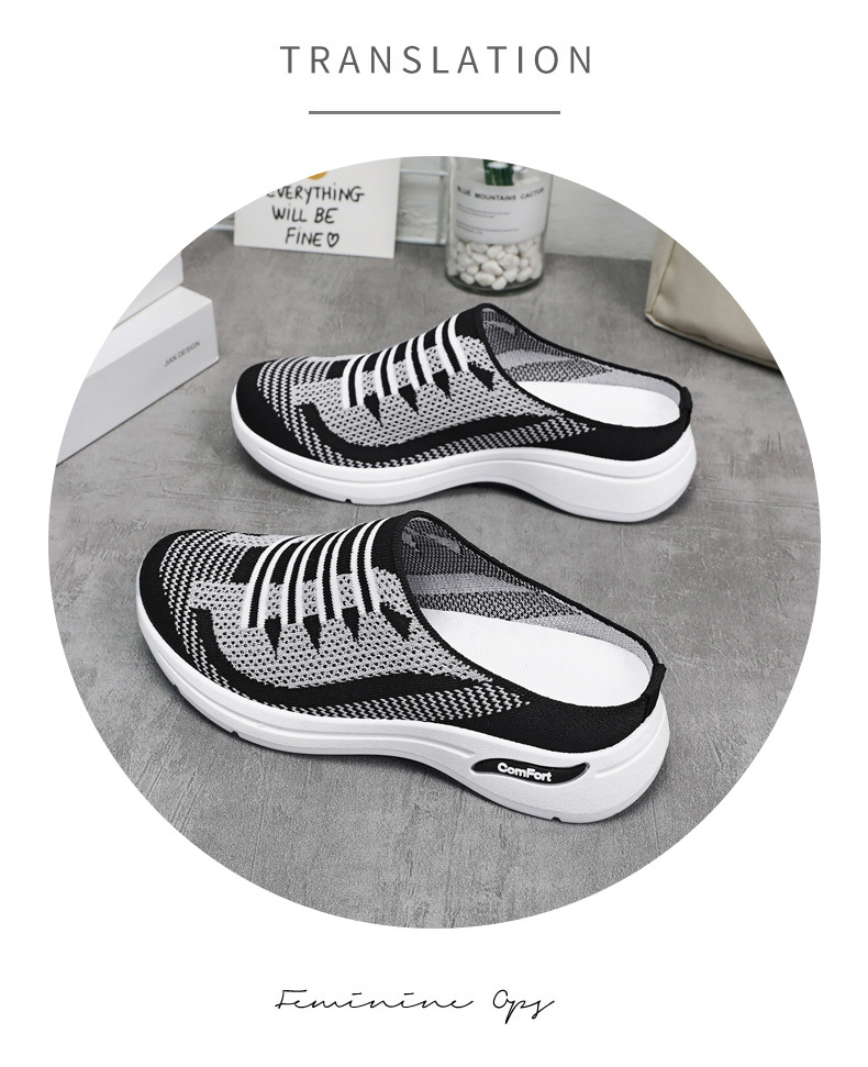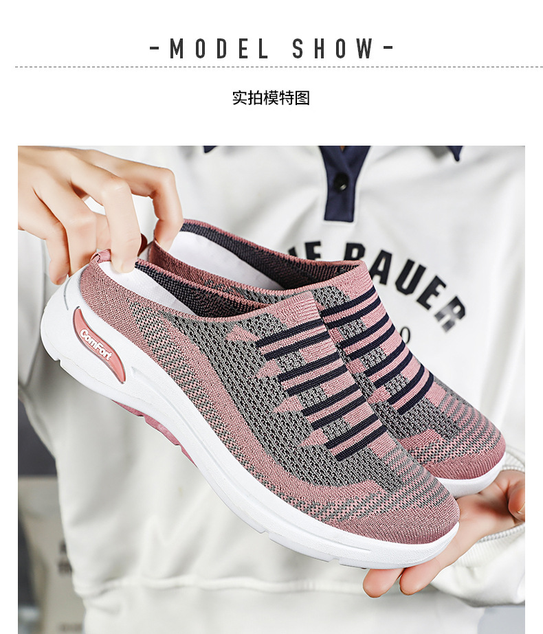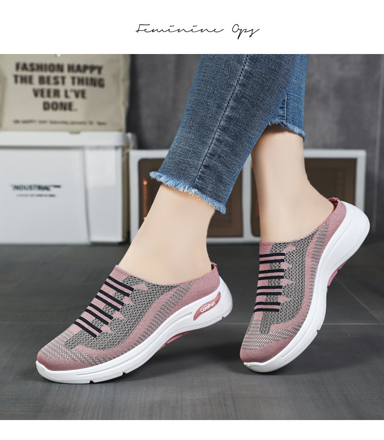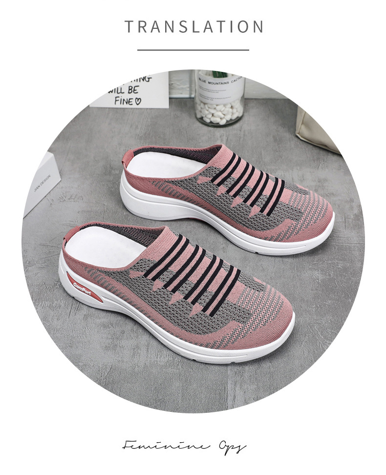 여성용 여름 패션 슬리퍼, 앞코가 막힌 반슬리퍼, 통기성 좋은 플라이 니트 소재, 가볍고 편안한 캐주얼 슈즈, 트렌디한 디자인.