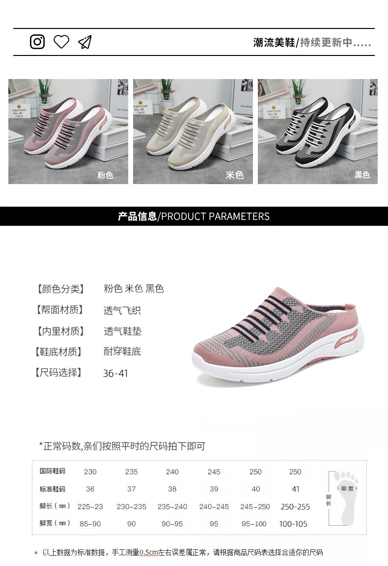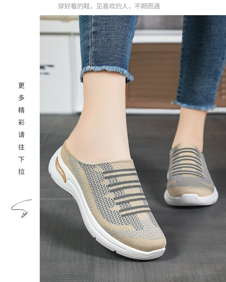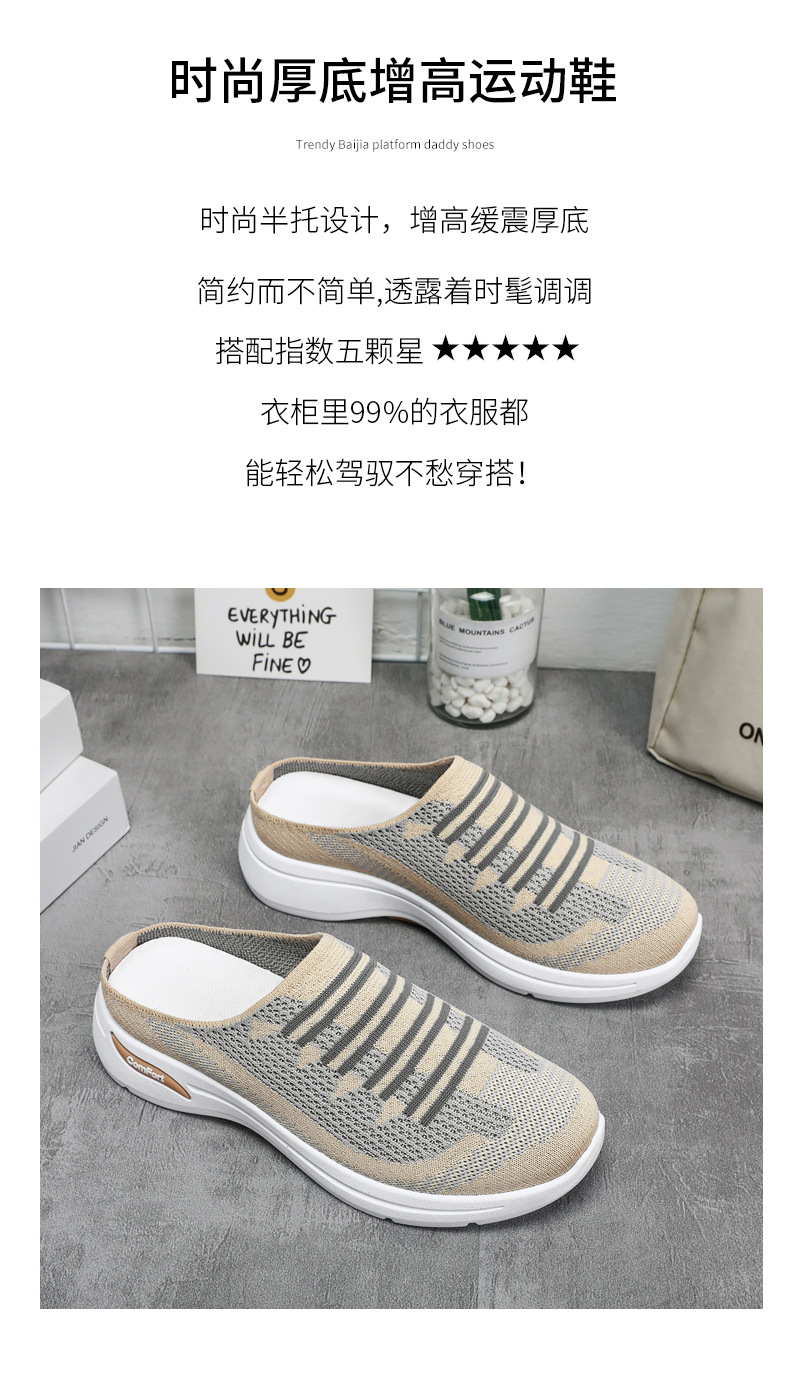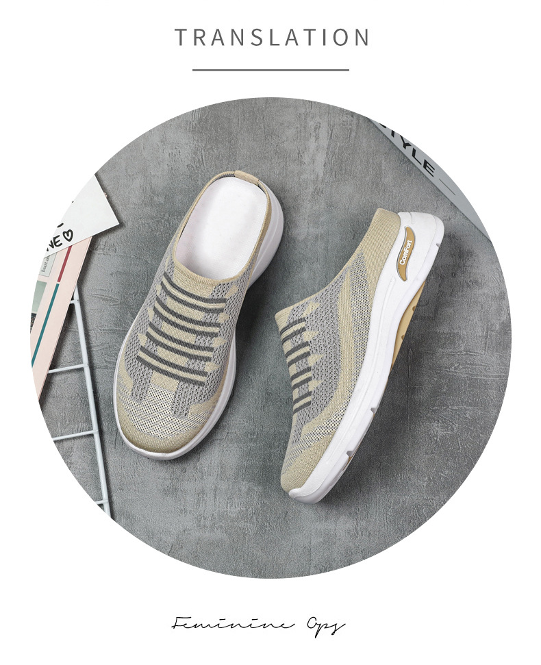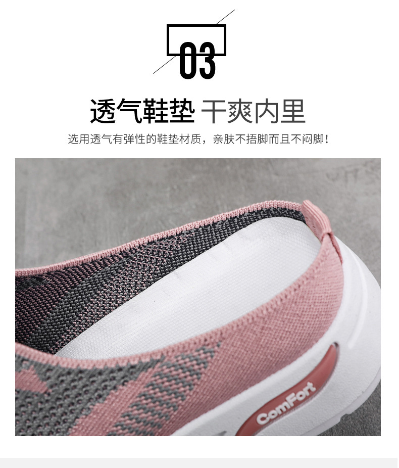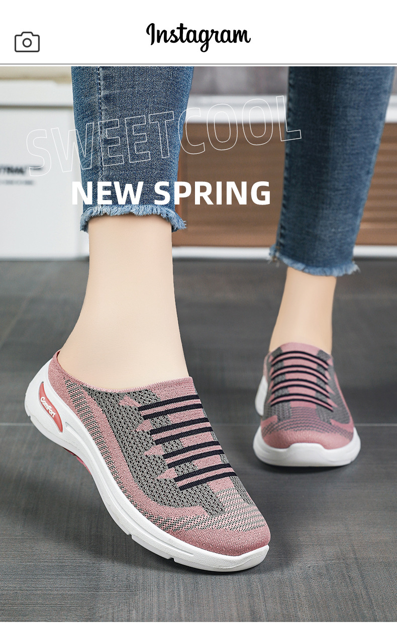여성용 여름 패션 슬리퍼, 앞코가 막힌 반슬리퍼, 통기성 좋은 플라이 니트 소재, 가볍고 편안한 캐주얼 슈즈, 트렌디한 디자인.
