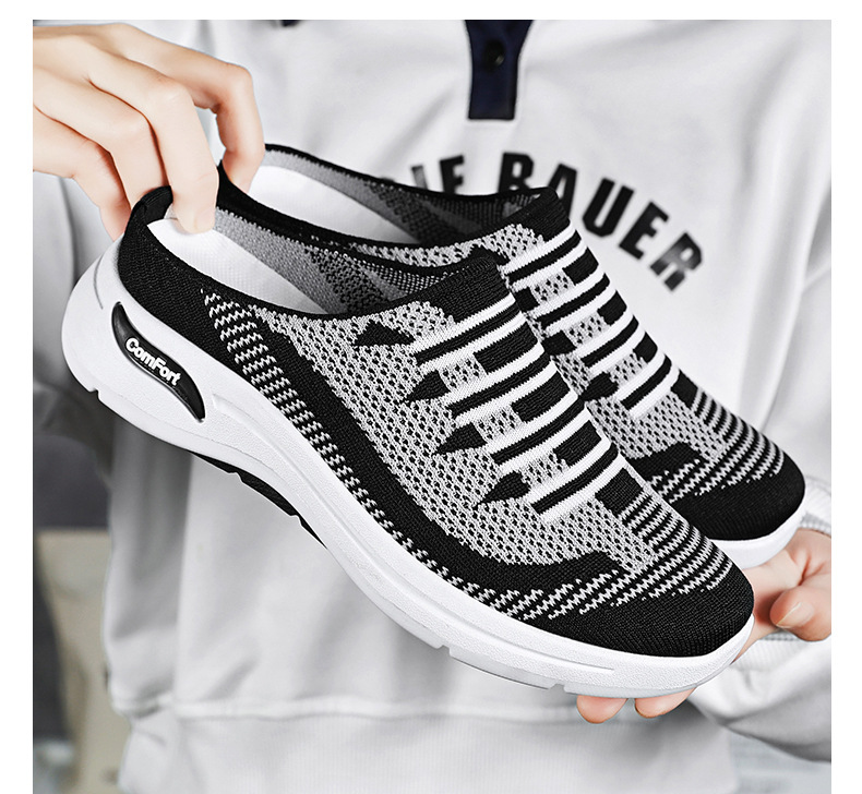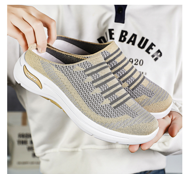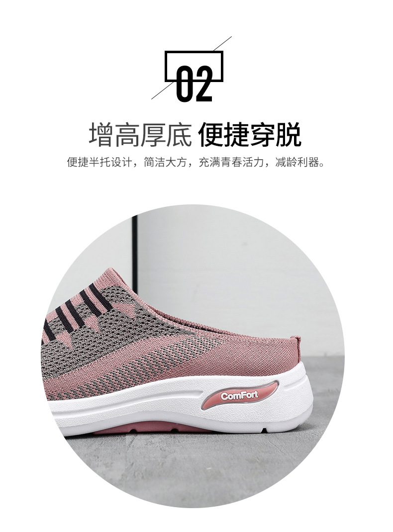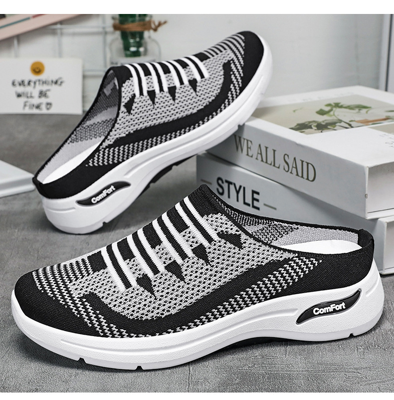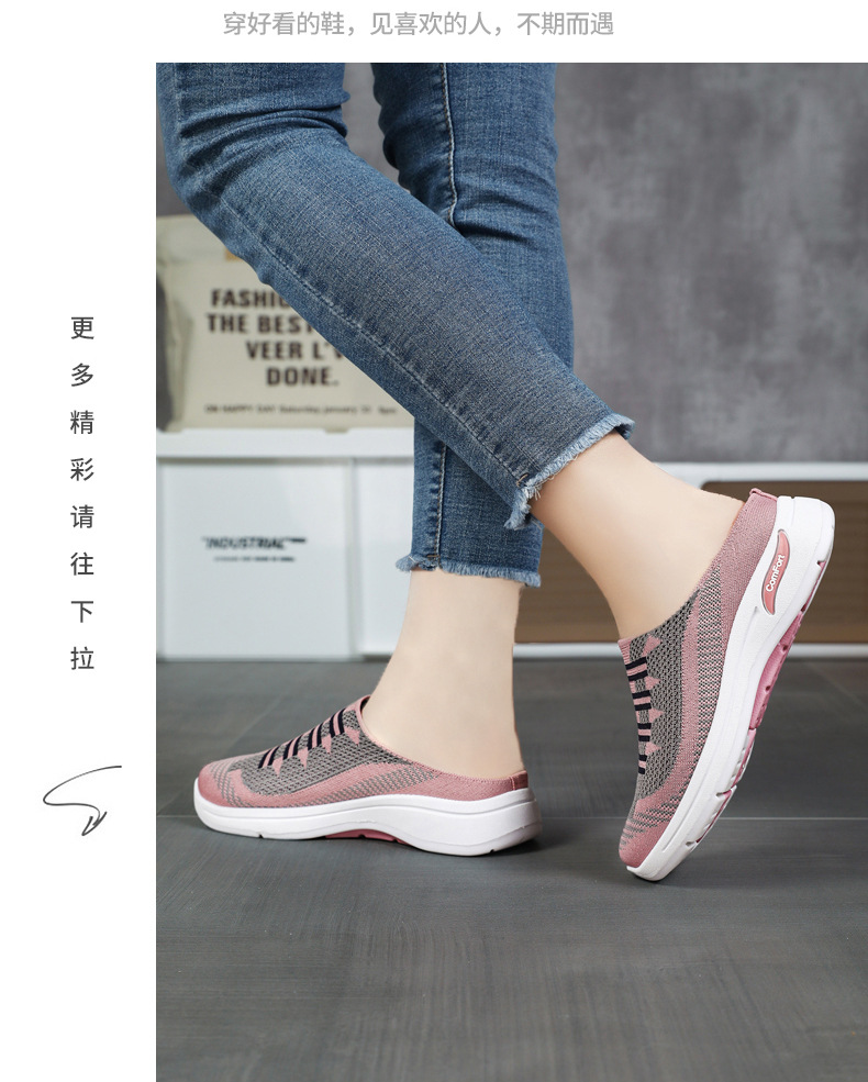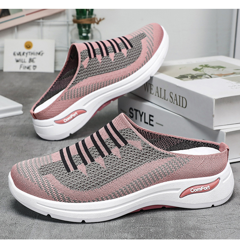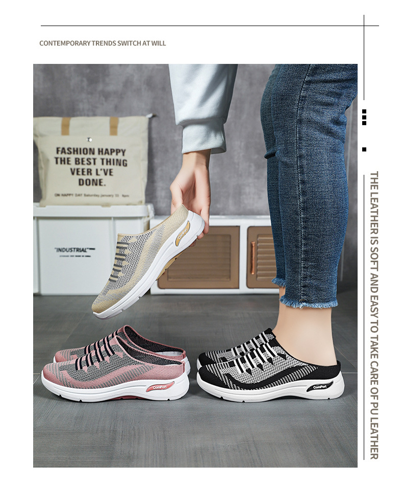 여성용 여름 패션 슬리퍼, 앞코가 막힌 반슬리퍼, 통기성 좋은 플라이 니트 소재, 가볍고 편안한 캐주얼 슈즈, 트렌디한 디자인.