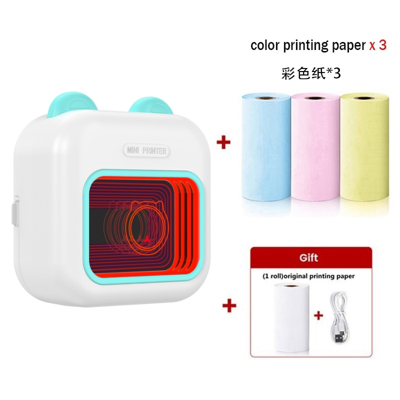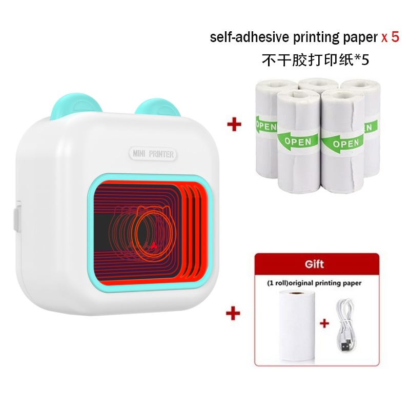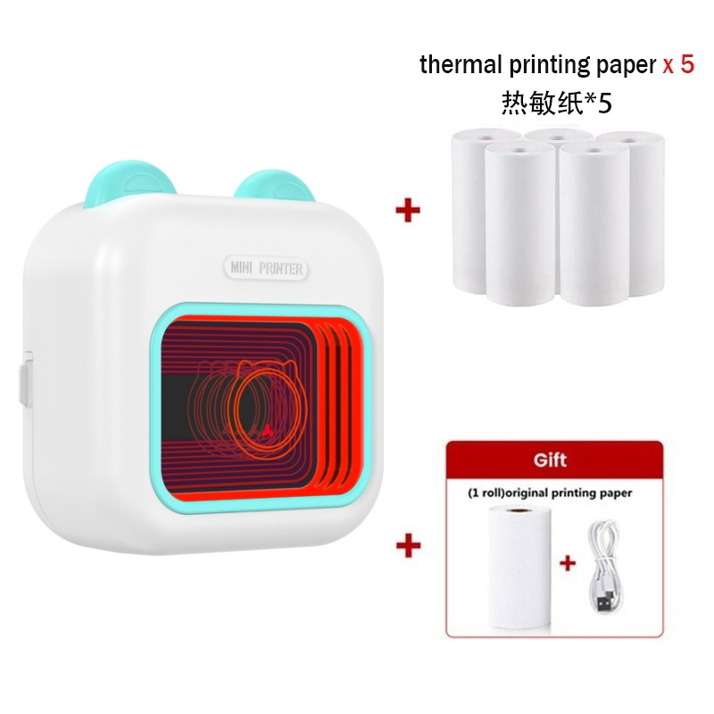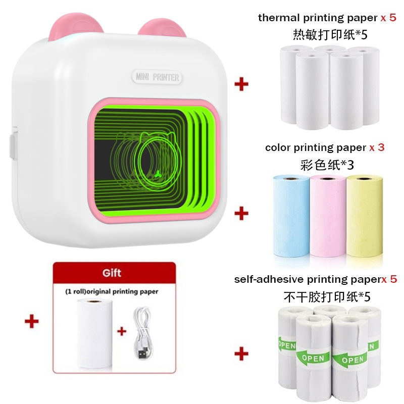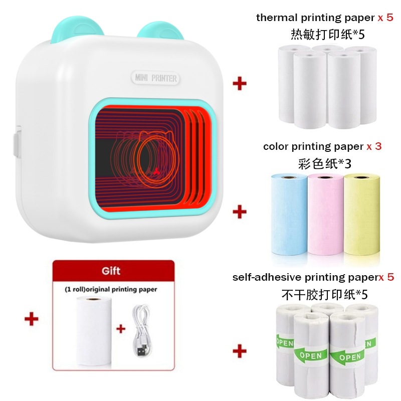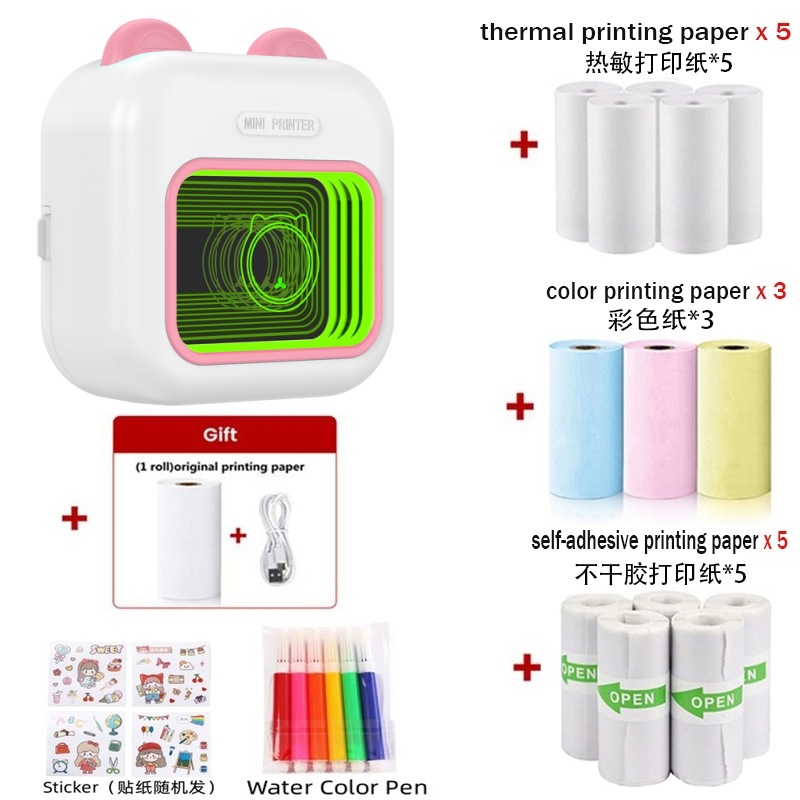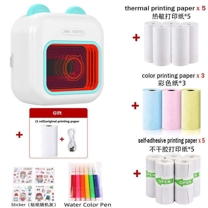 打印机1台+【自带1卷热敏纸+5卷热敏纸+5卷不干胶+3卷彩色纸+6支水彩笔+贴纸+布袋】为一整套。