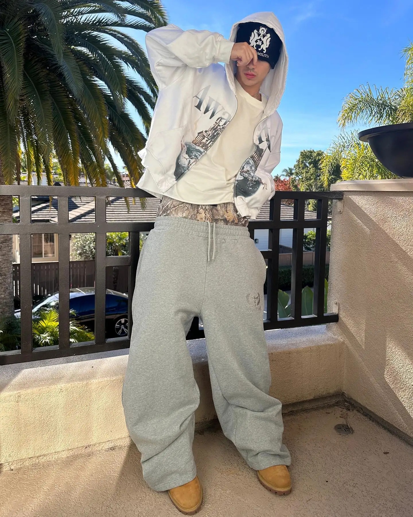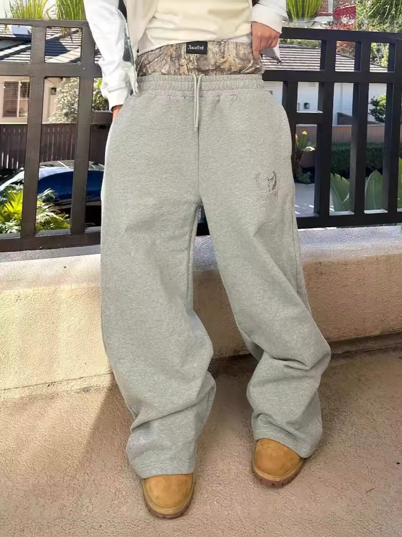 국경 간 AliExpress 거리 패션 패턴 자수 더블 허리 레이스 업 캐주얼 스트레이트 바지 남성 스포츠 캐주얼 바지스토어 가기