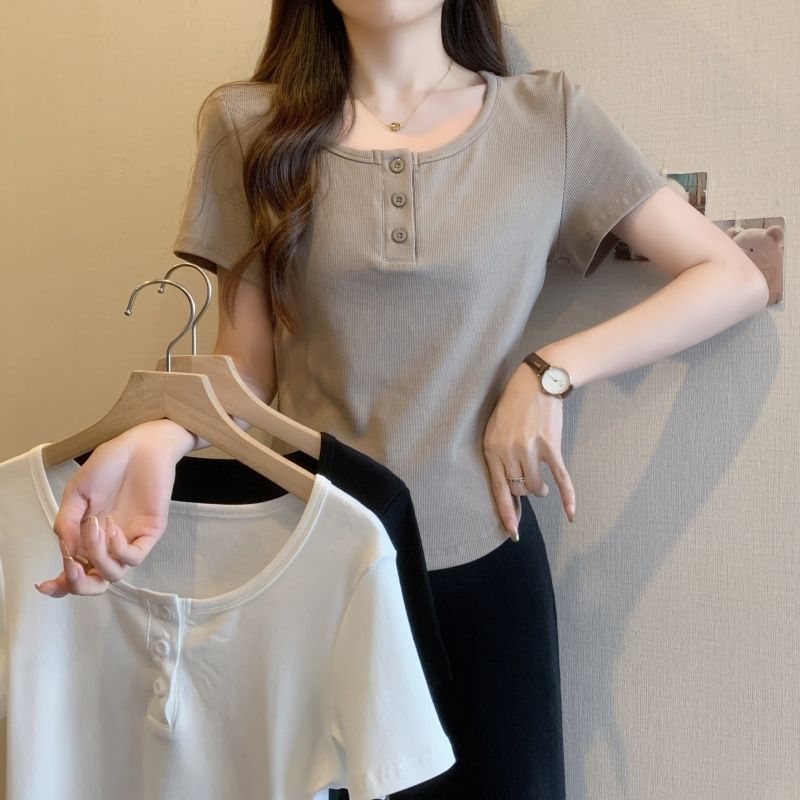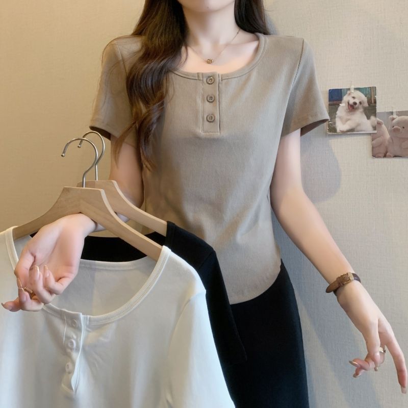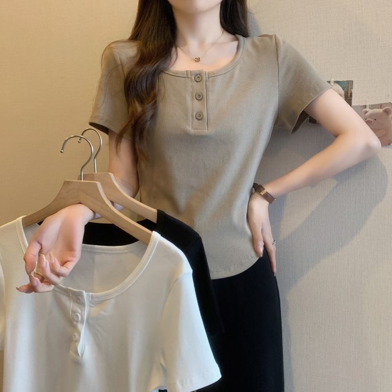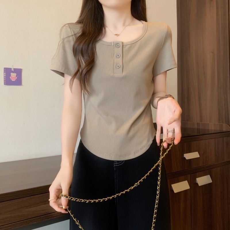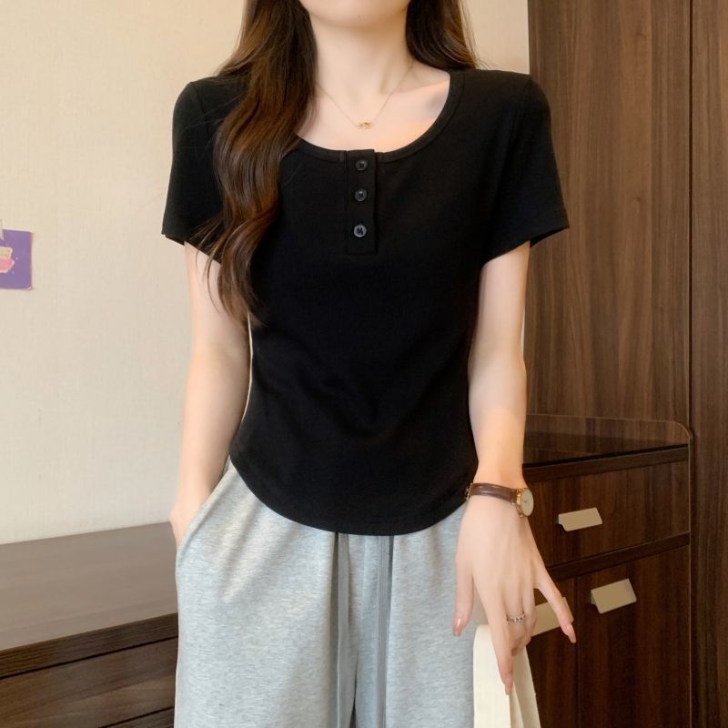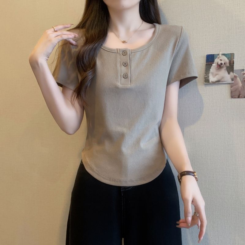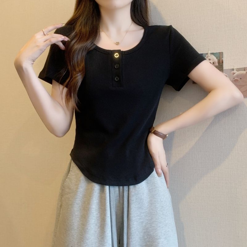 면 2024 여름 플러스 사이즈 MM 새로운 반팔 티셔츠 여성용 슬리밍 숄더 디자인 쇼트 탑스토어 가기