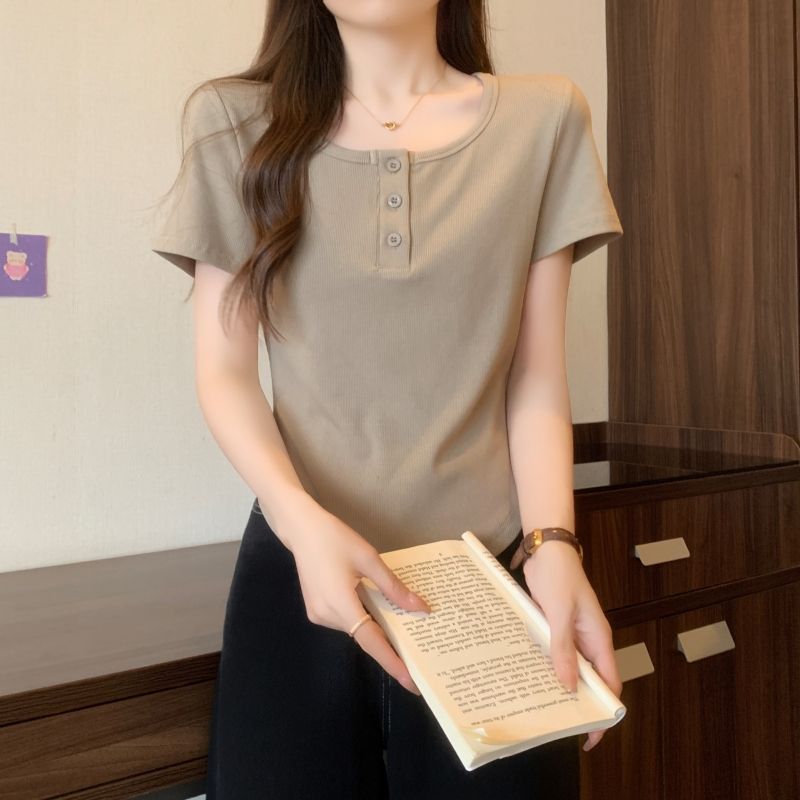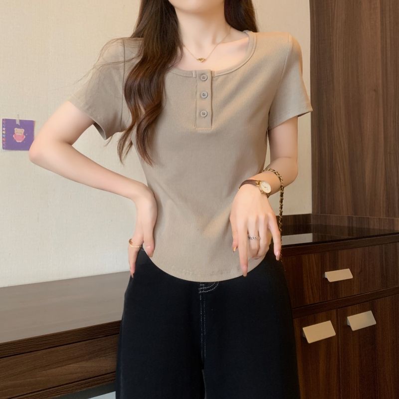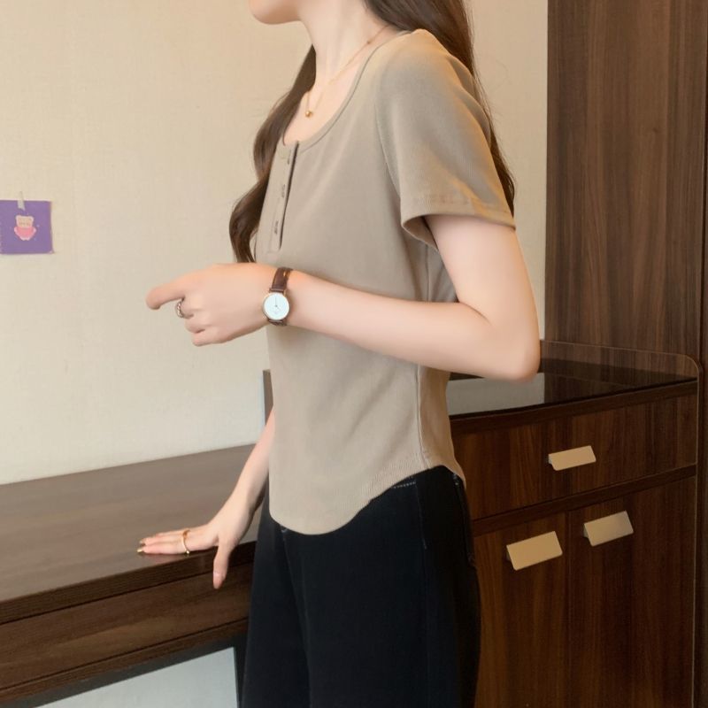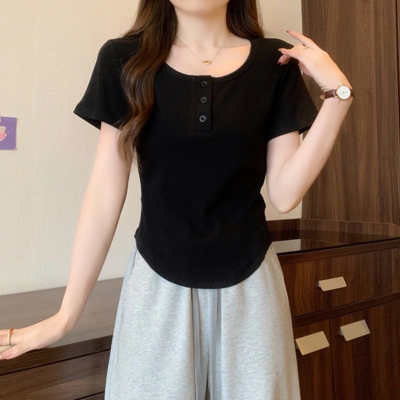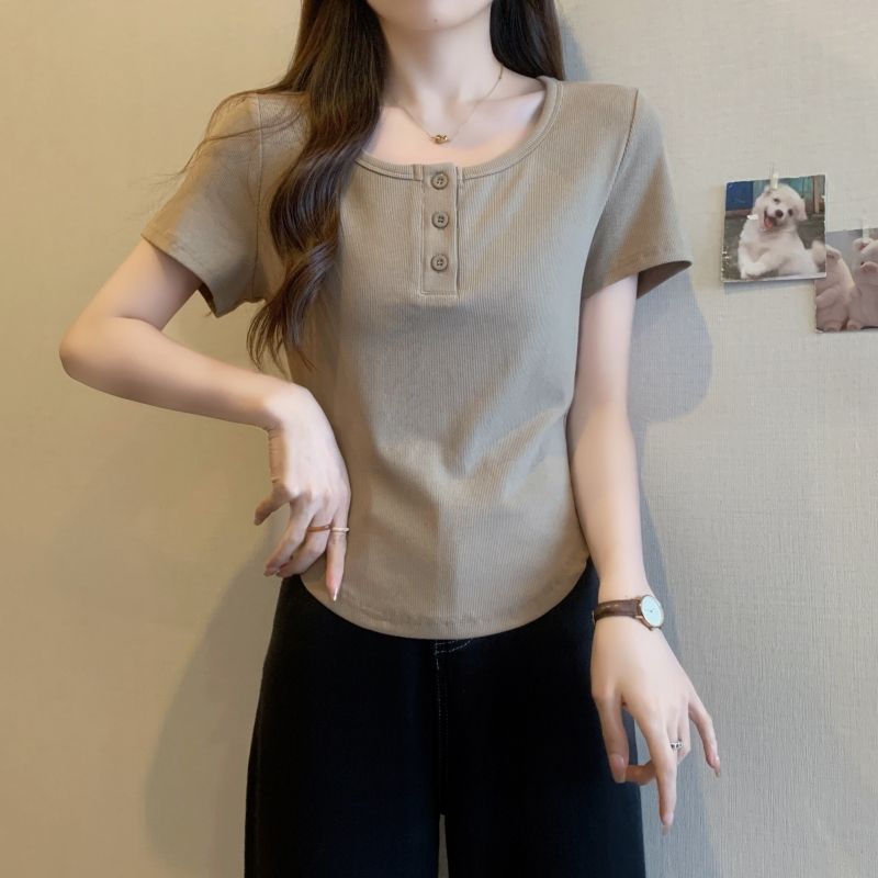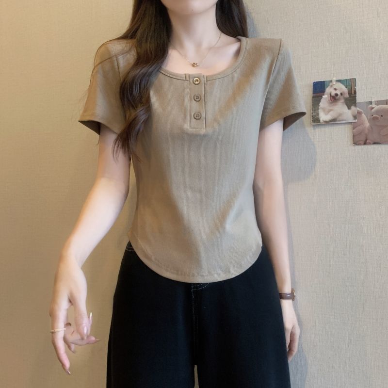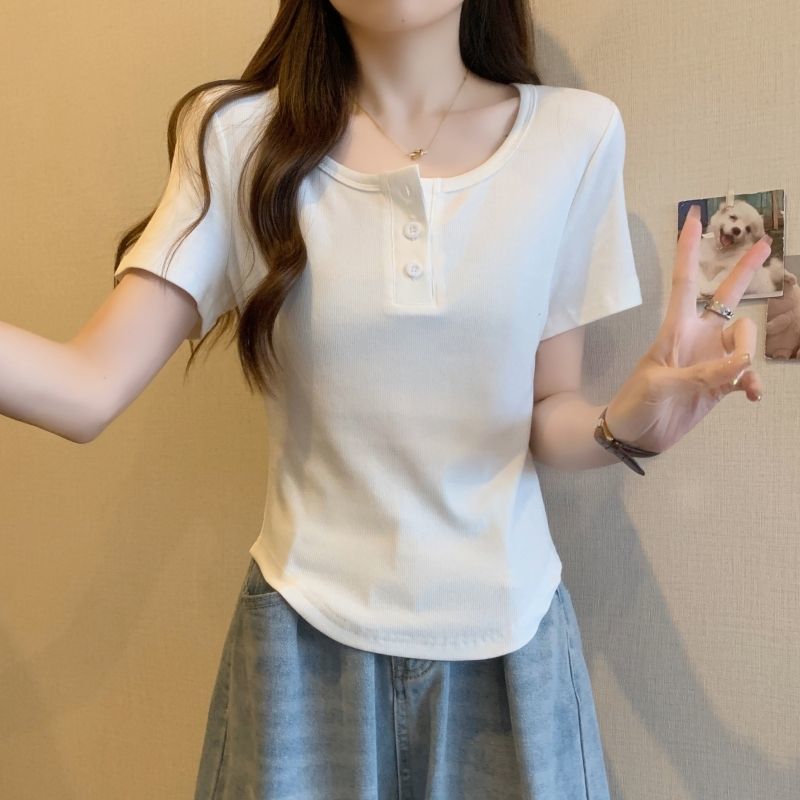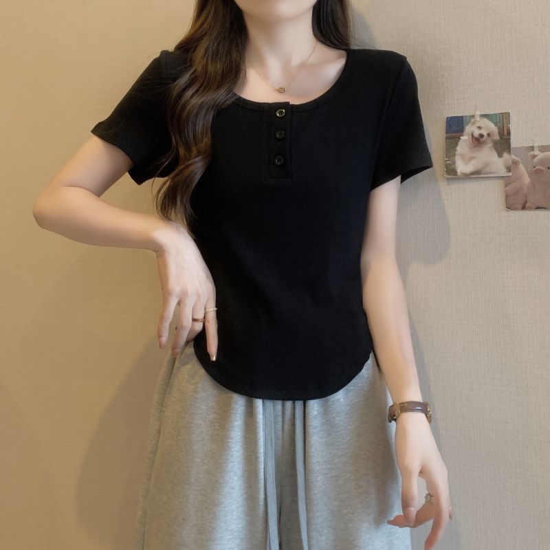 면 2024 여름 플러스 사이즈 MM 새로운 반팔 티셔츠 여성용 슬리밍 숄더 디자인 쇼트 탑스토어 가기