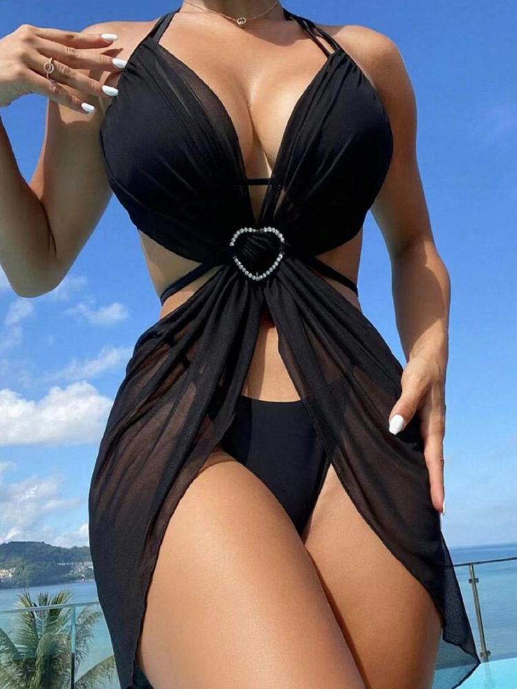 2025 새로운 유럽과 미국의 국경 간 비키니 3 피스 수영복 여성 아마존 솔리드 컬러 중공 홀터넥 메쉬 수영복스토어 가기