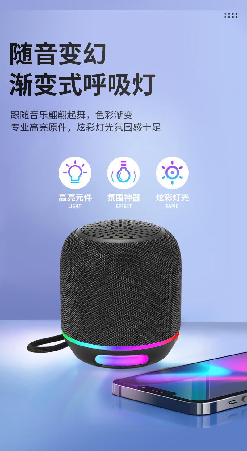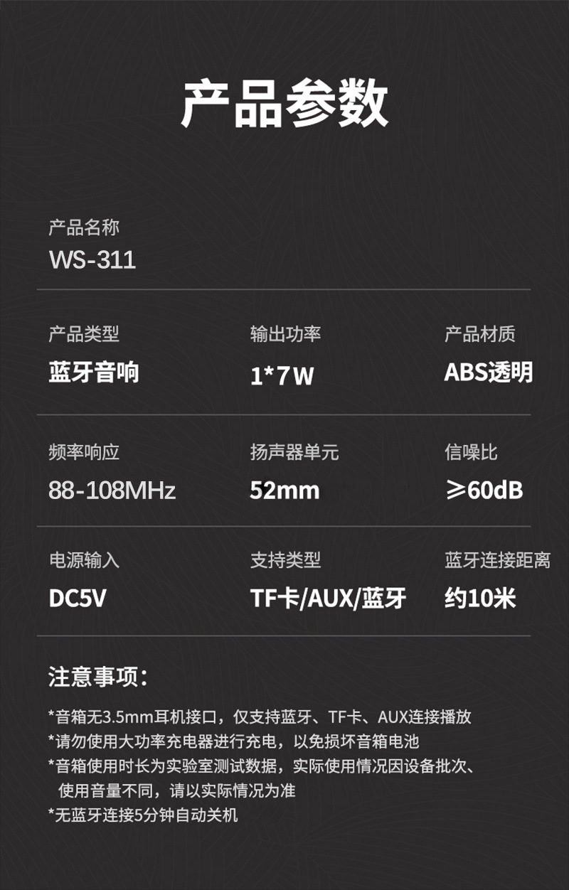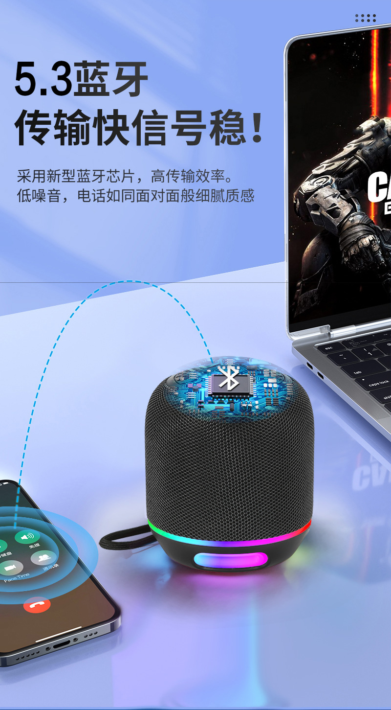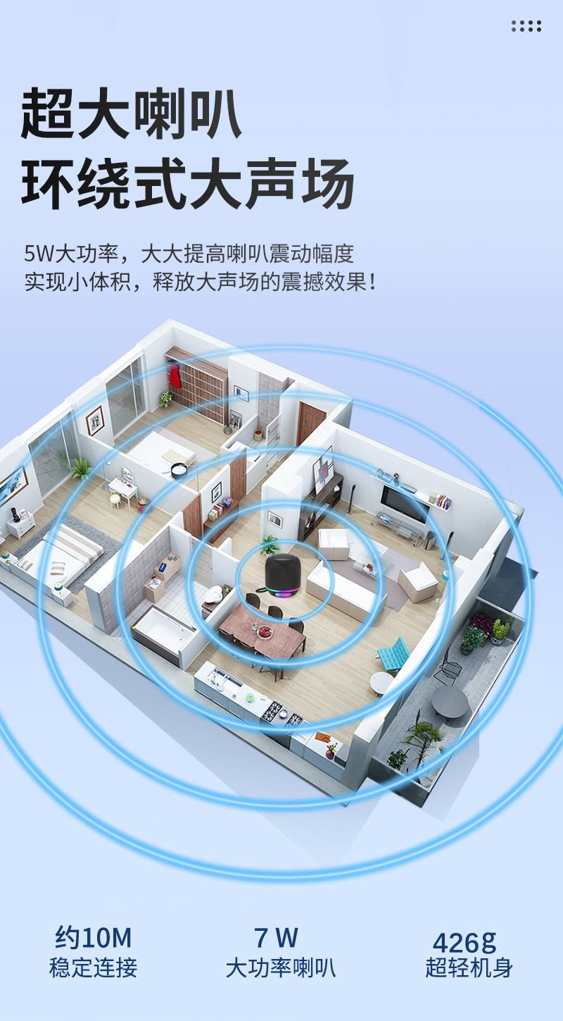 功能(FUTION):蓝牙播放,读U盘,TF卡,FM收音,自拍,TWS,5档RGB彩灯