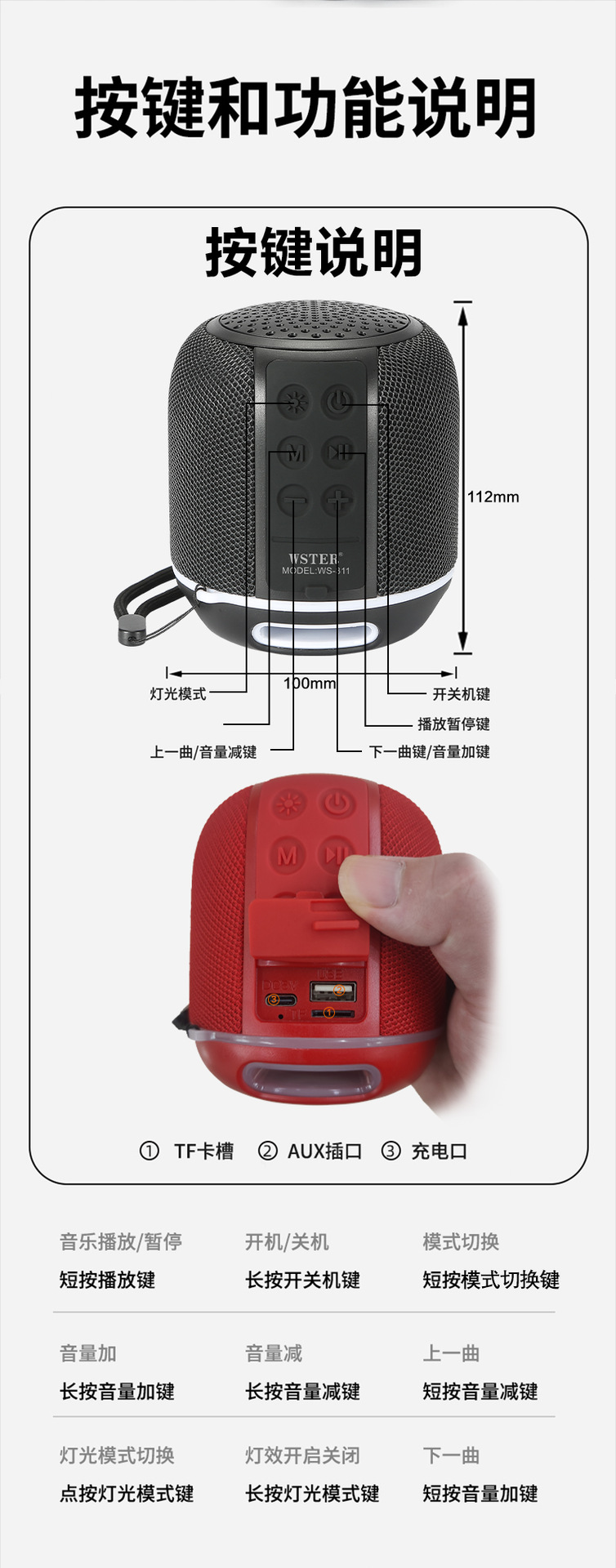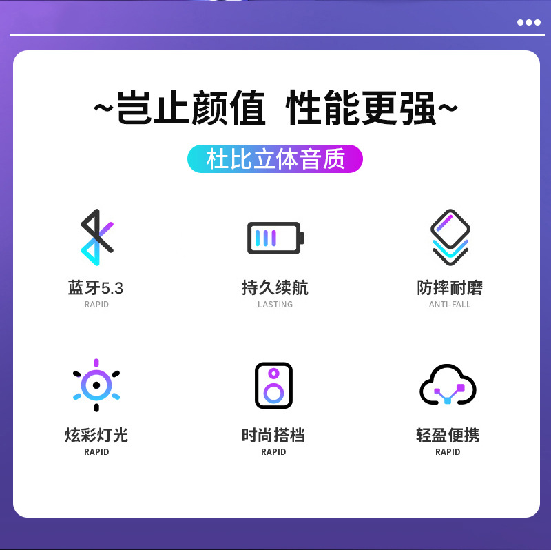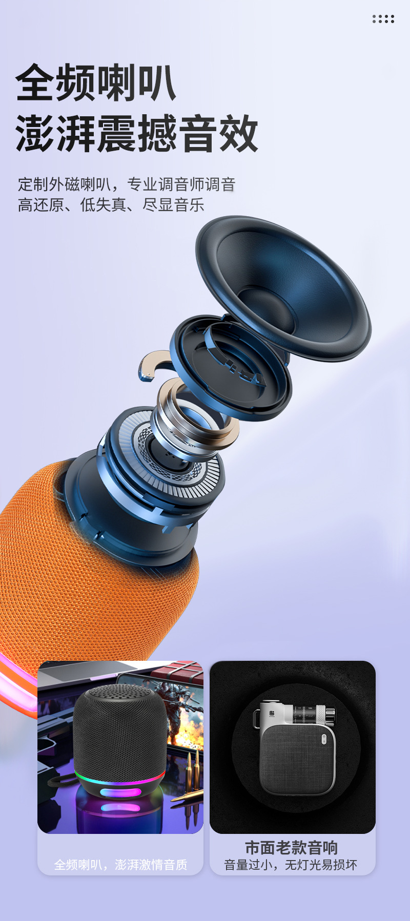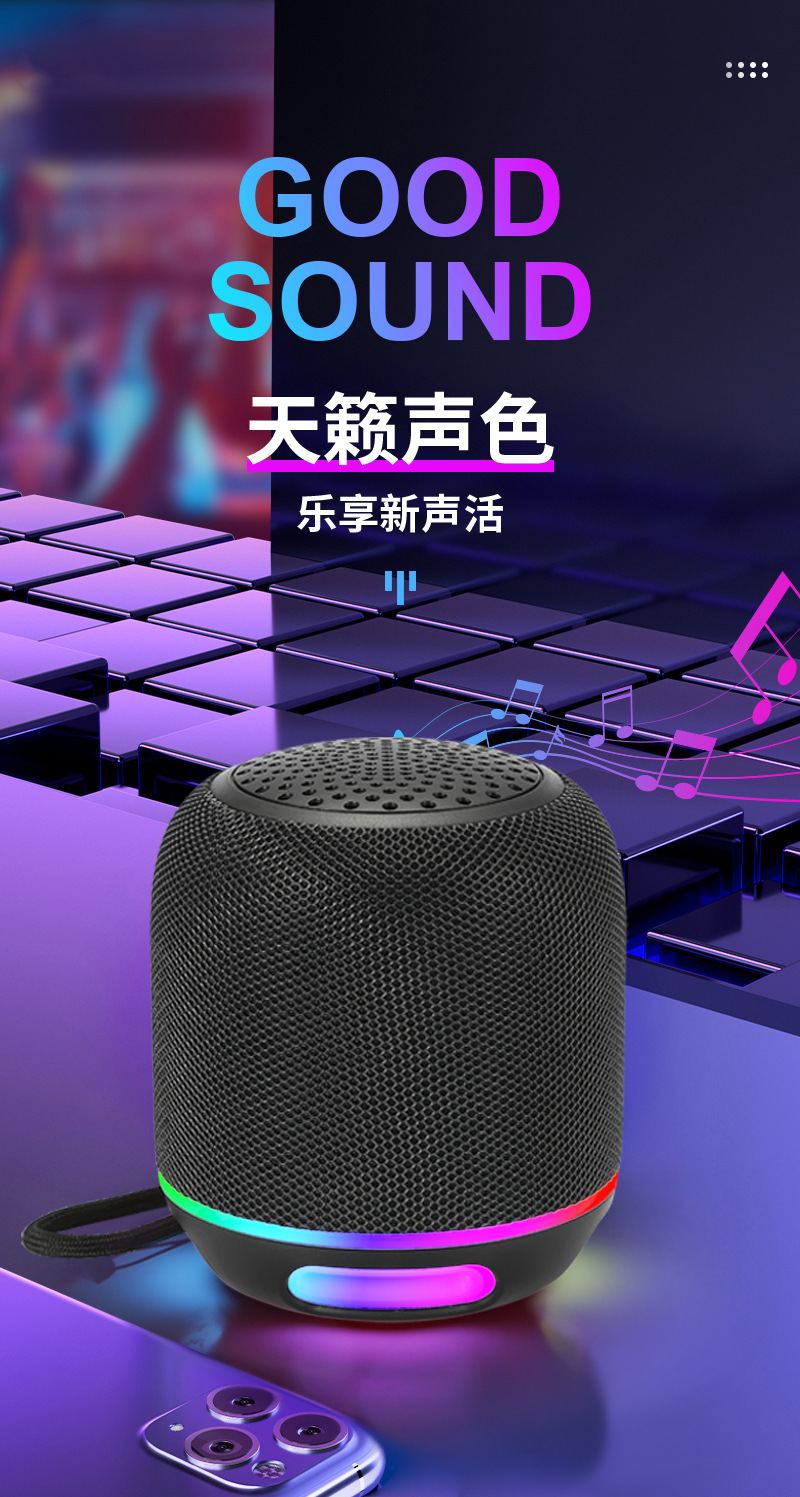 功能(FUTION):蓝牙播放,读U盘,TF卡,FM收音,自拍,TWS,5档RGB彩灯