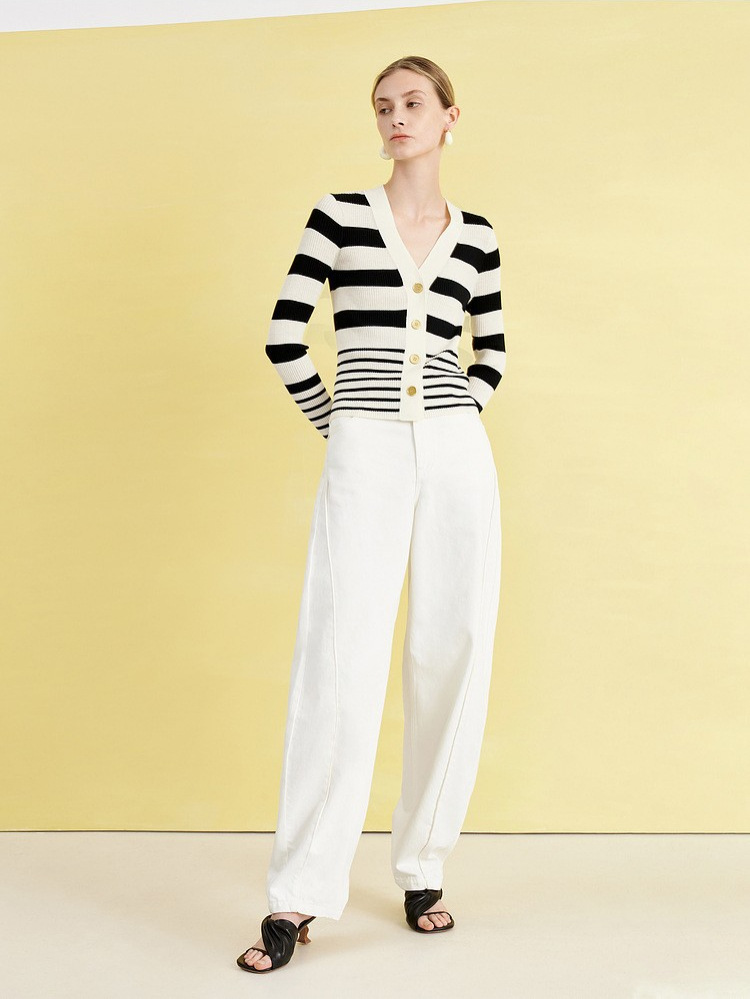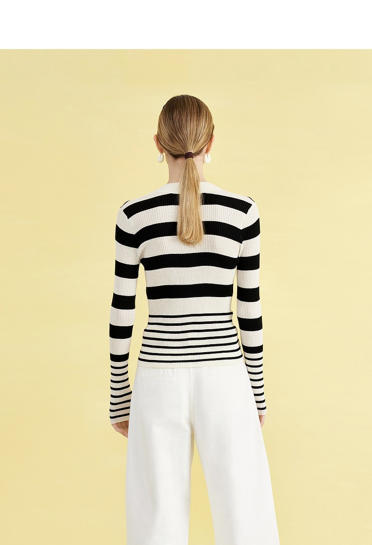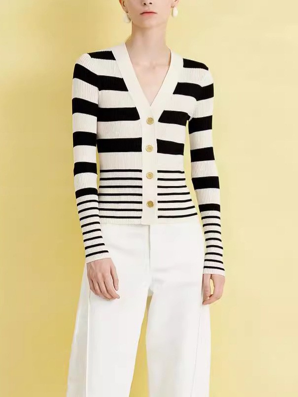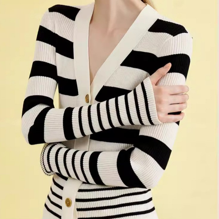 ED 신상 브이넥 레트로 배색 스트라이프 니트 가디건 여성용 2024 숏 니트 상의 우아한 스타일