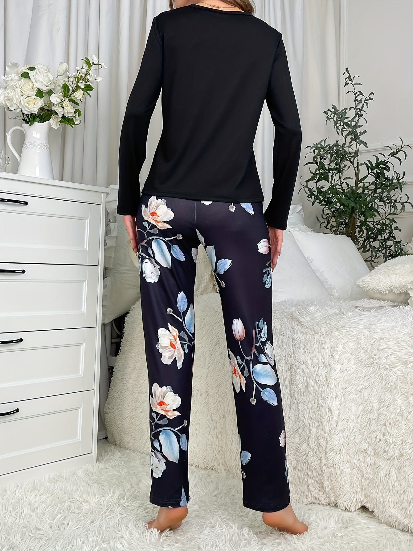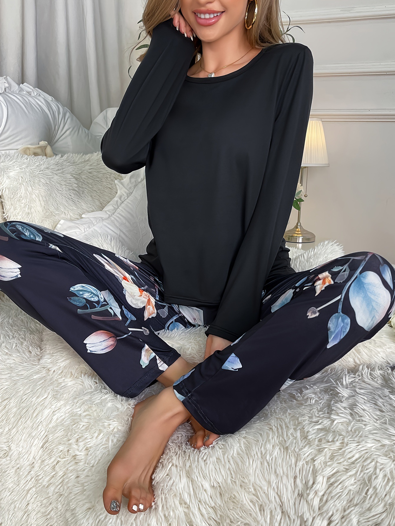 국경 간 가을/겨울 잠옷 세트 대외 무역 여성 유럽과 미국의 홈 의류 블랙 긴 소매 탑 프린트 바지 투피스 세트스토어 가기