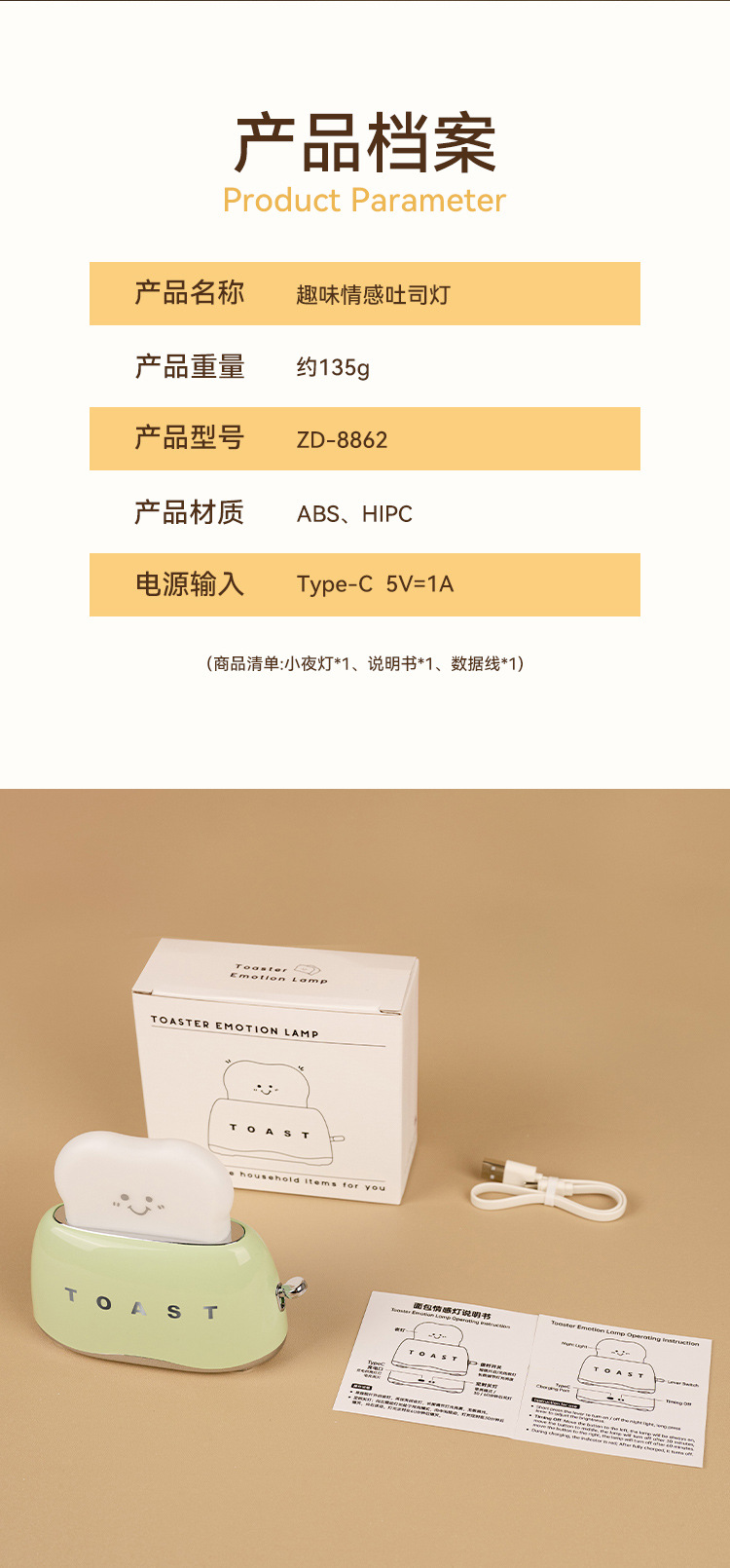 产品清单:小夜灯*1、说明书*1、数据线*1