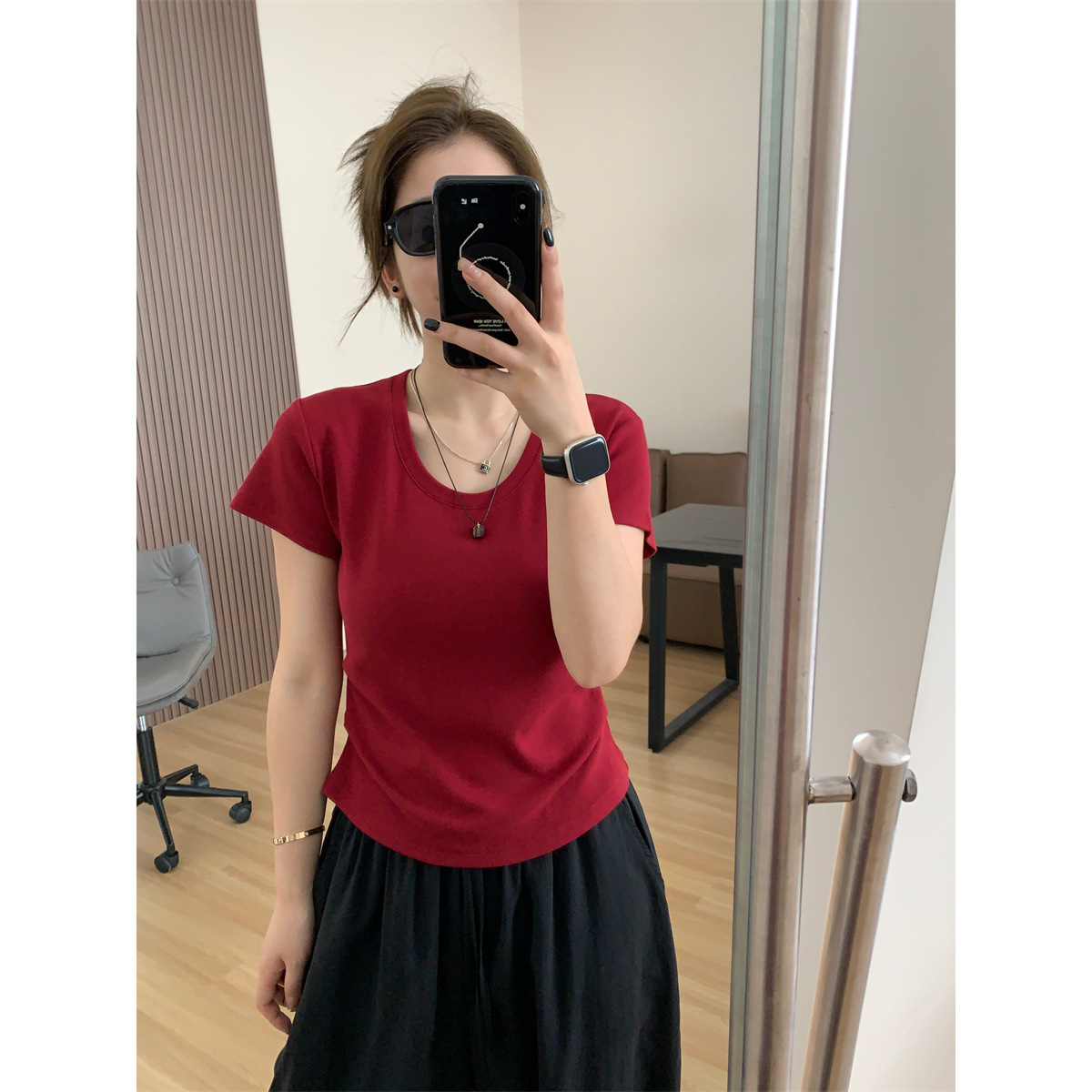 멋지게 U-넥 핀치 주름 반팔 여성용 여름 스레드 코튼 대형 탄성 캐주얼 올 매치 숄더 티셔츠 탑