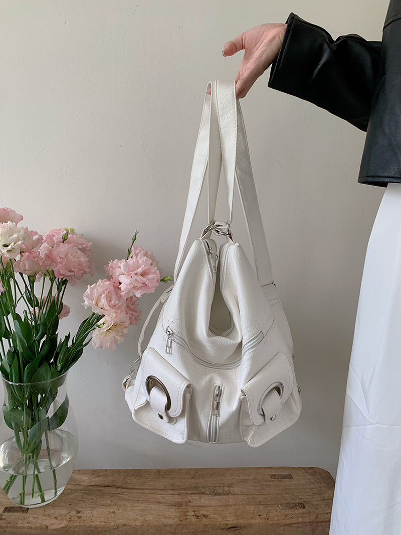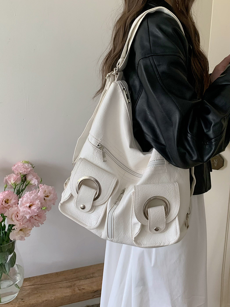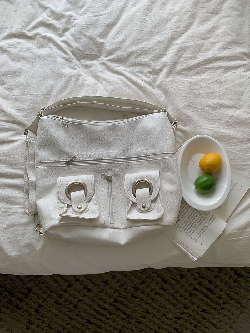 包包前面有一个拉链袋可放下手机 两个磁扣小袋可放耳机或口红