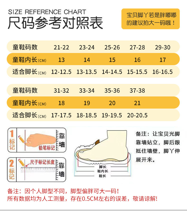 • 21/22 [내부 길이 13cm] 는 약 12cm 의 발 길이에 적합합니다.
