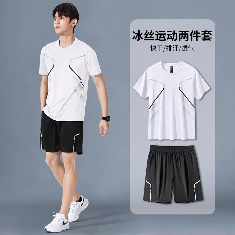 운동복 세트 남자 달리기 반팔 아이스 실크 여름 빠른 건조 옷 농구 옷 깃털 피트니스 옷 반바지 여름