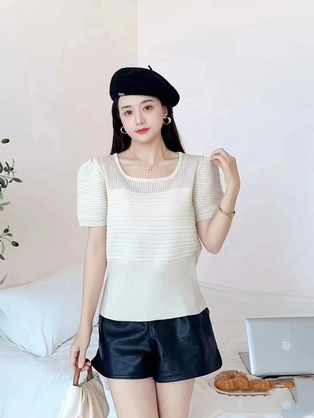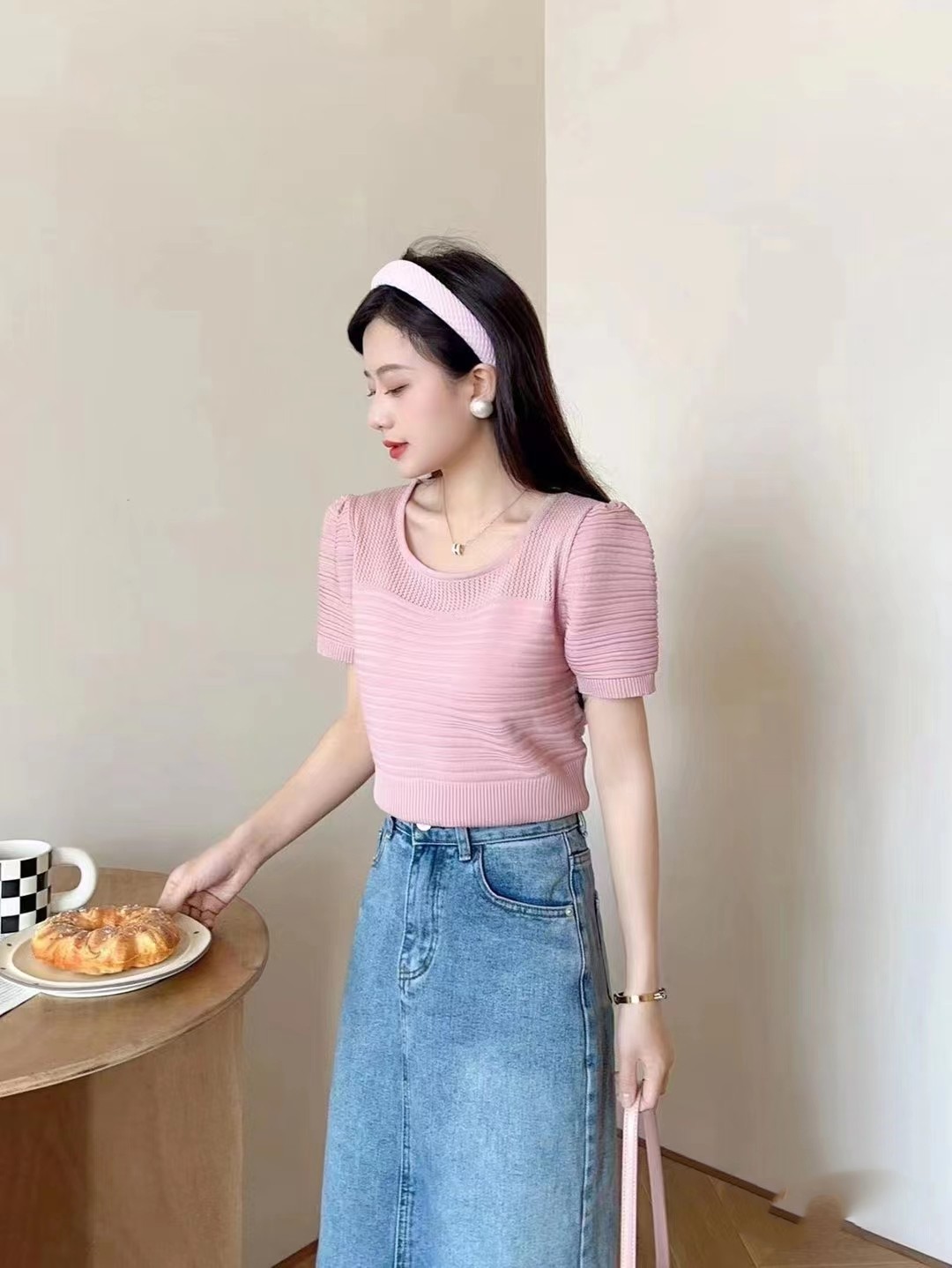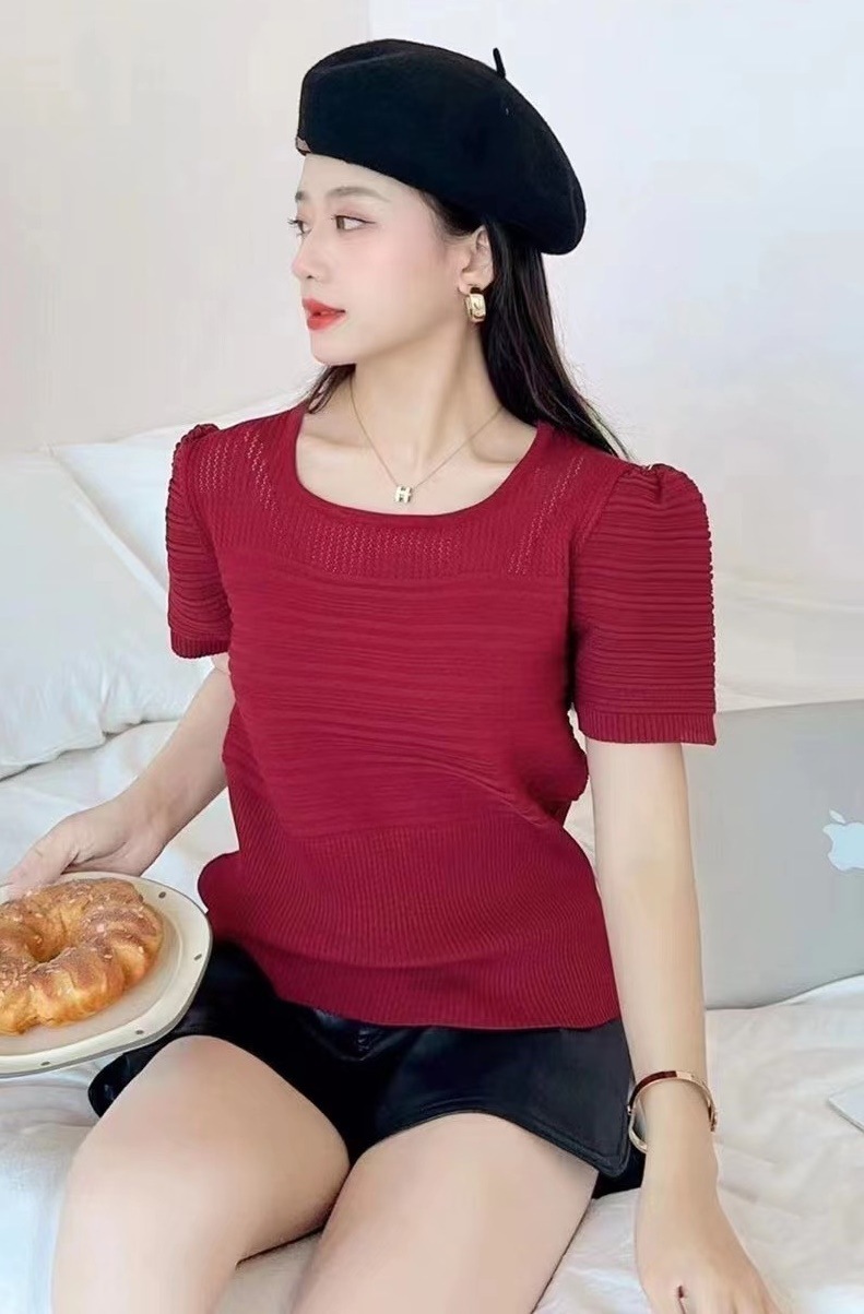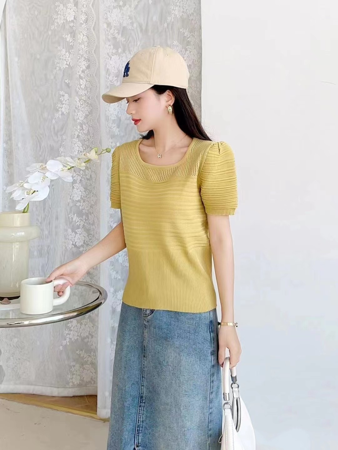 여름 신상품, 부드러운 한국 스타일, 스퀘어넥, 퍼프 슬리브 디자인, 활용도 높은 슬림핏 숏 니트, 여성용 반팔스토어 가기