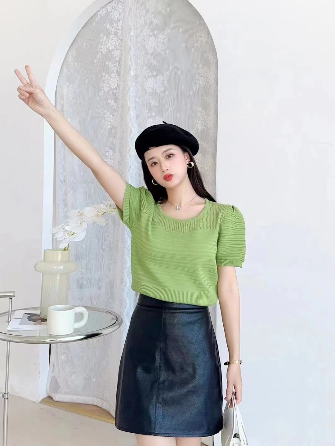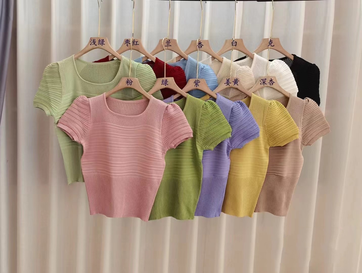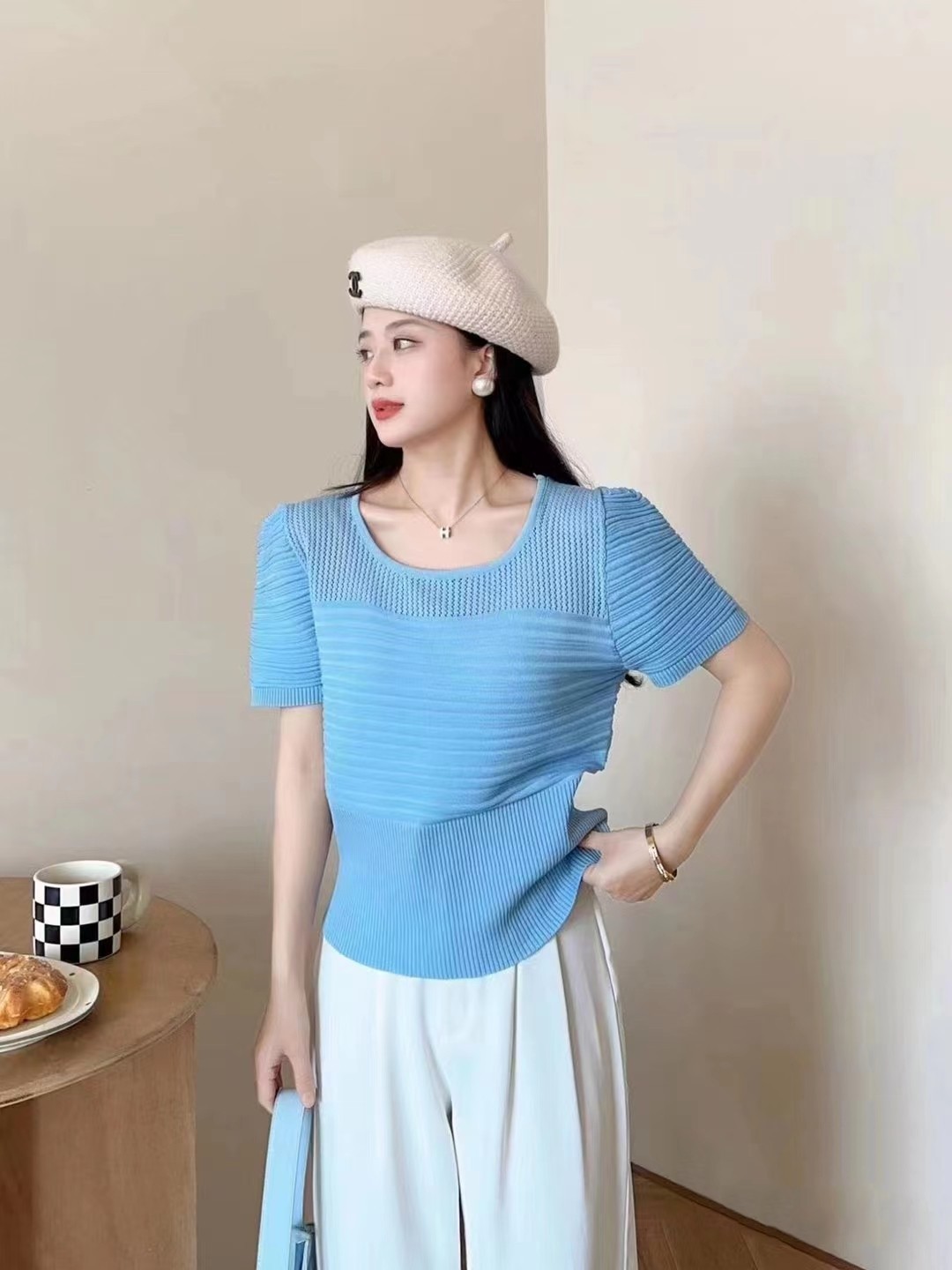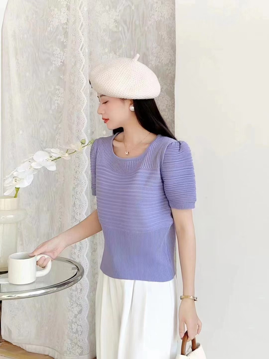 여름 신상품, 부드러운 한국 스타일, 스퀘어넥, 퍼프 슬리브 디자인, 활용도 높은 슬림핏 숏 니트, 여성용 반팔스토어 가기