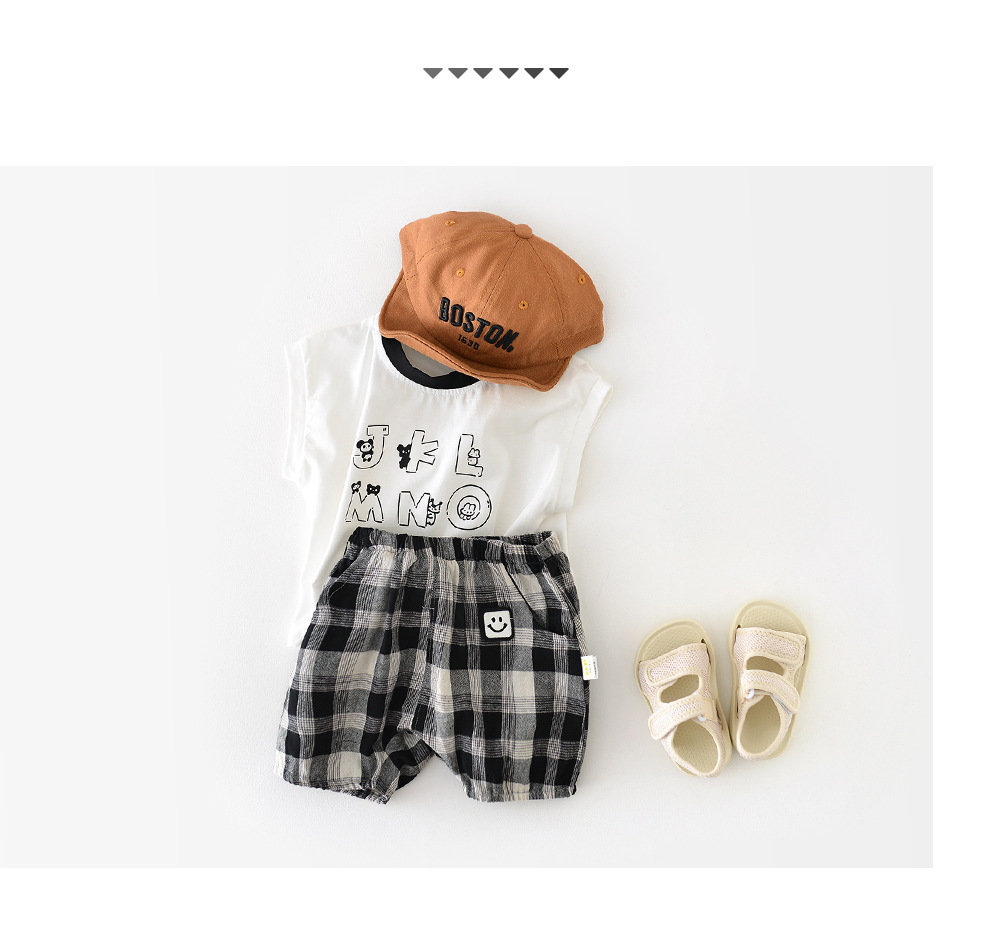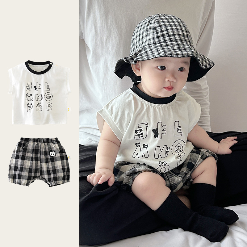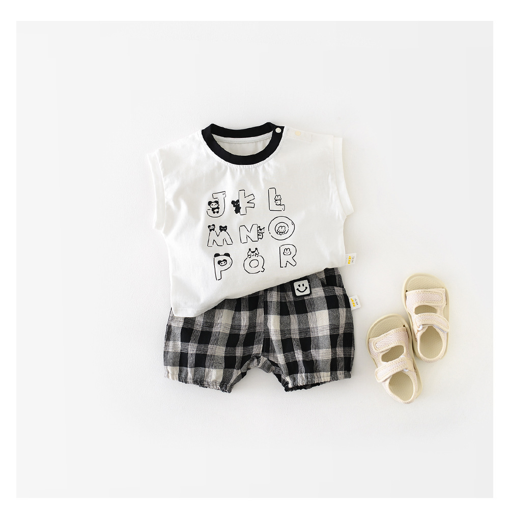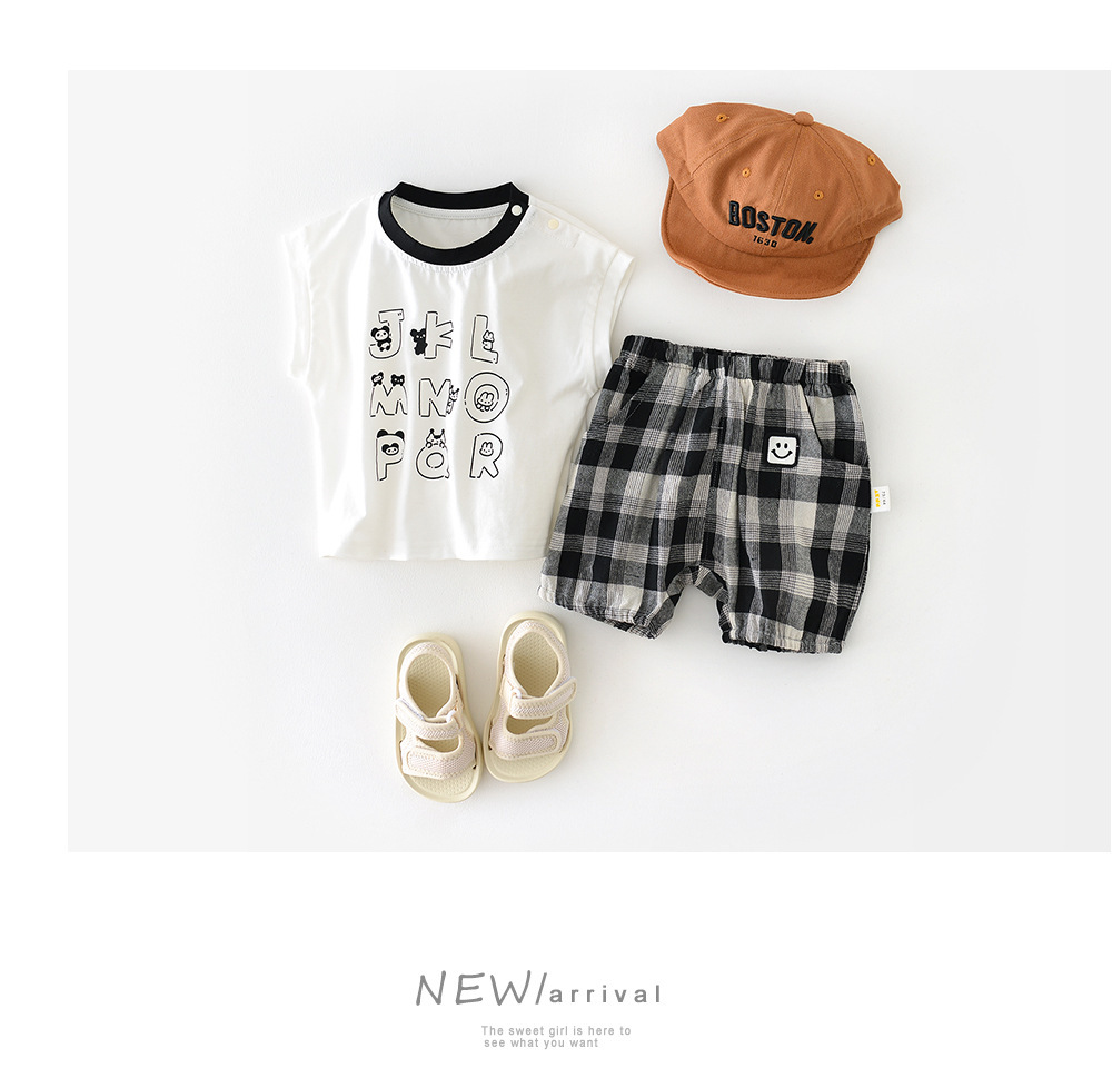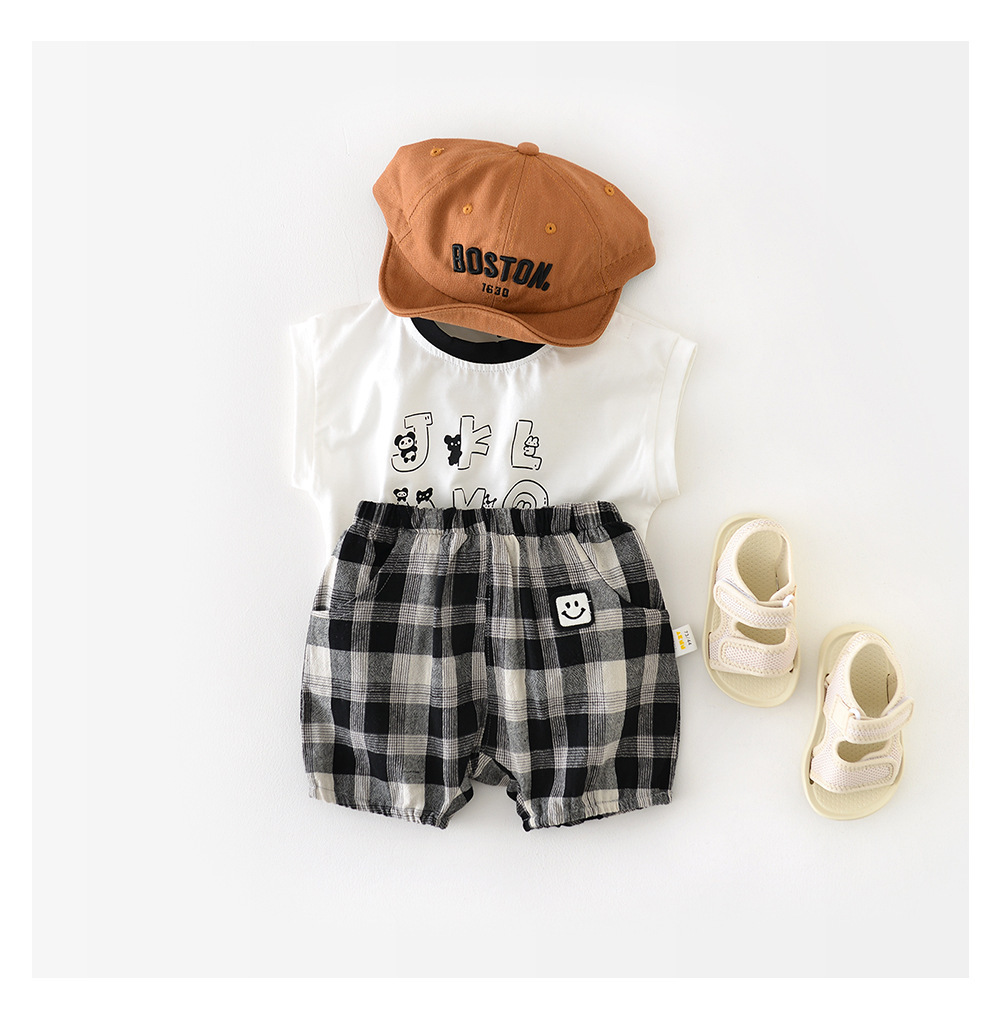 남아용 여름 티셔츠 투피스 세트, 멋진 남아 및 여아 의류, 레터 체크 무늬 반바지 세트, 면 아동용 반팔스토어 가기