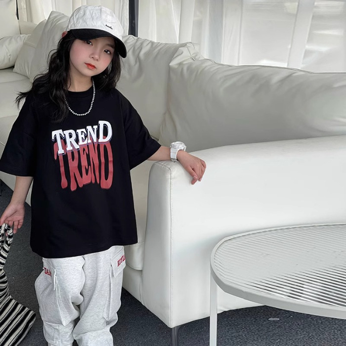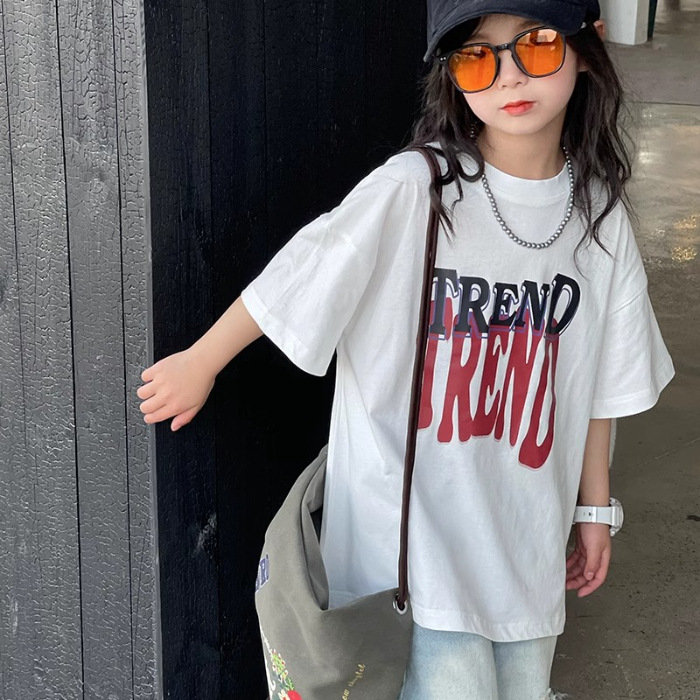 여자 반팔 여름 2024 새로운 어린이 캐주얼 한국식 루즈 롱 티셔츠 핸즈섬 트렌디 탑