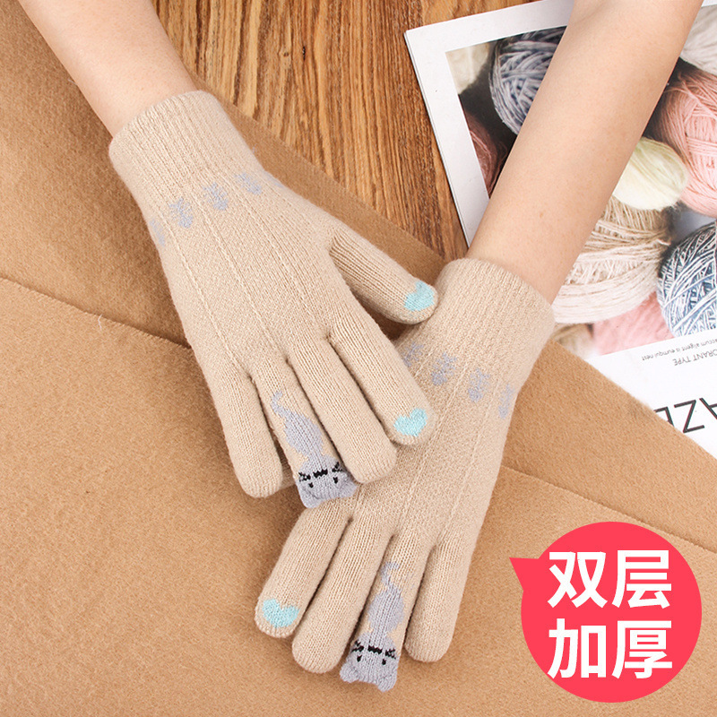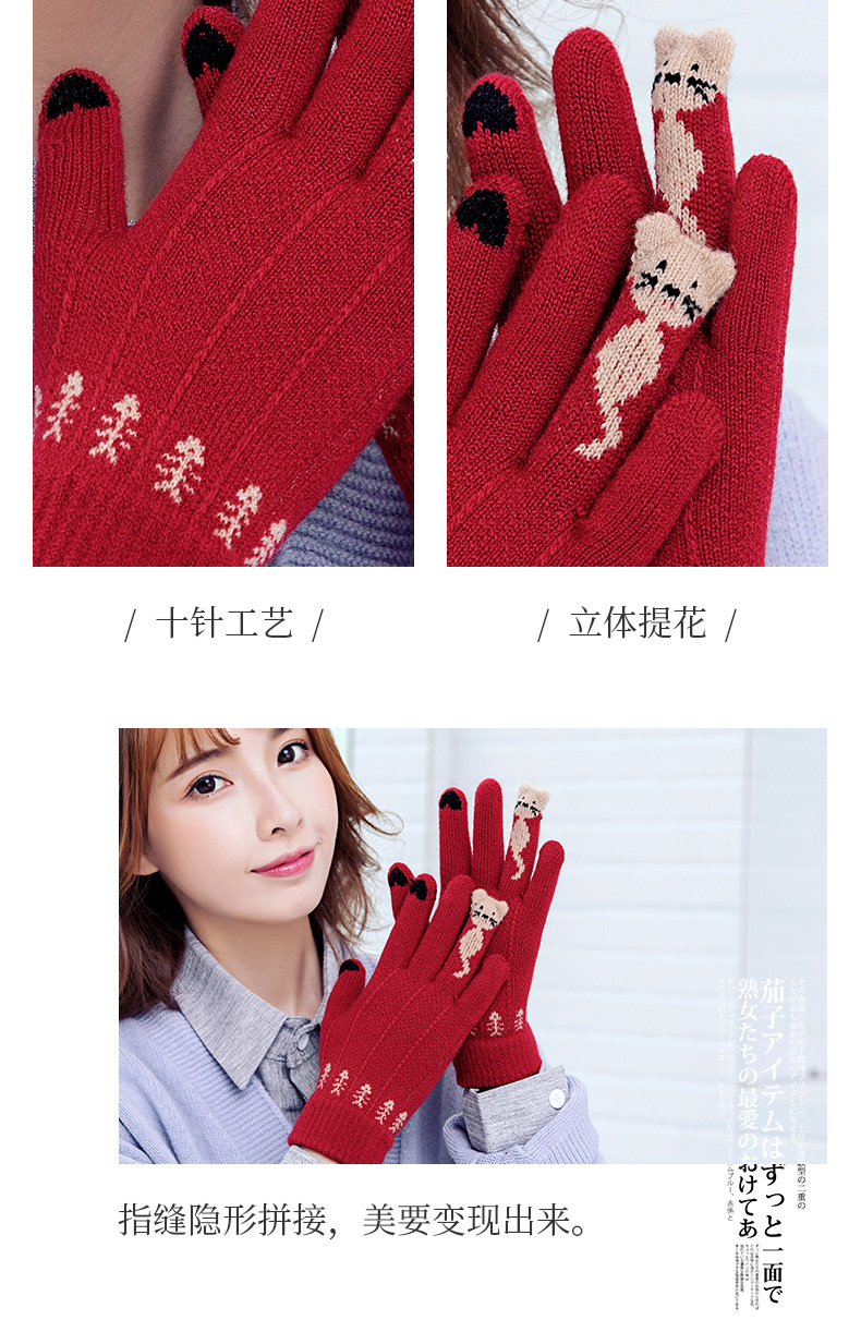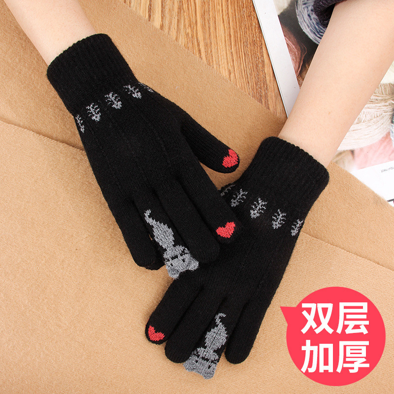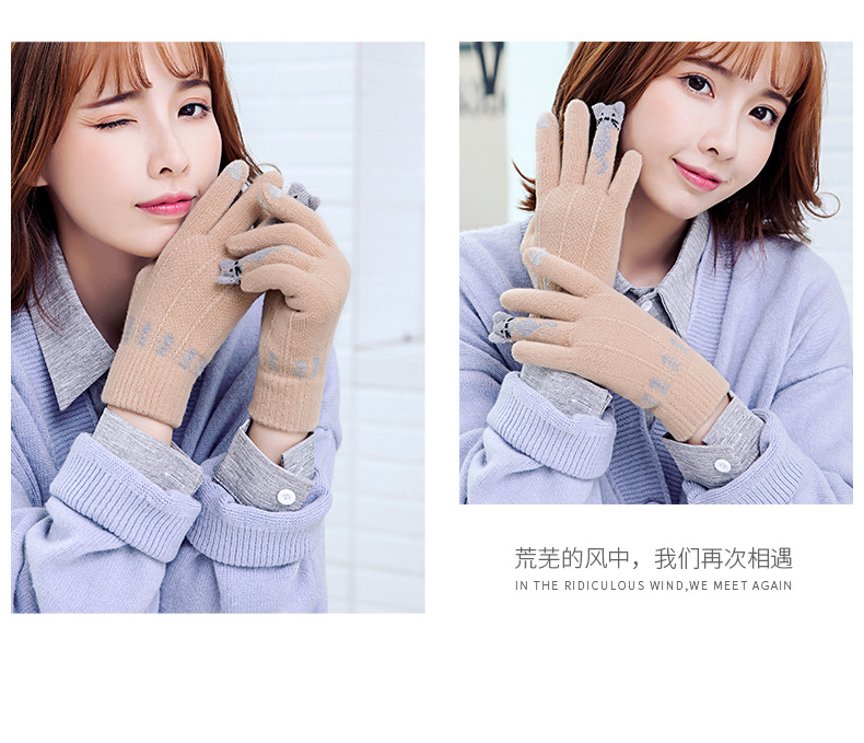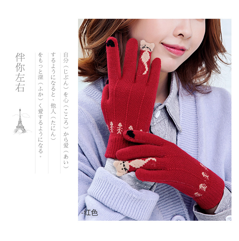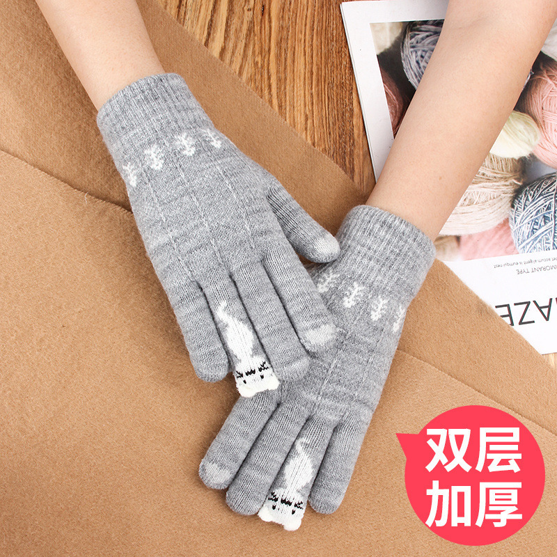 양모 장갑 겨울 귀여운 고양이 만화 터치 스크린 따뜻한 니트 5 손가락 두꺼운 야외 방한 사이클링 장갑