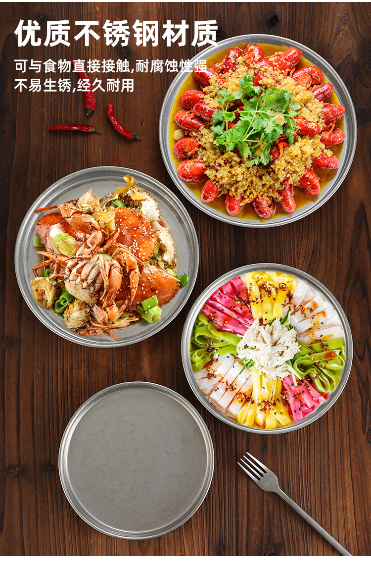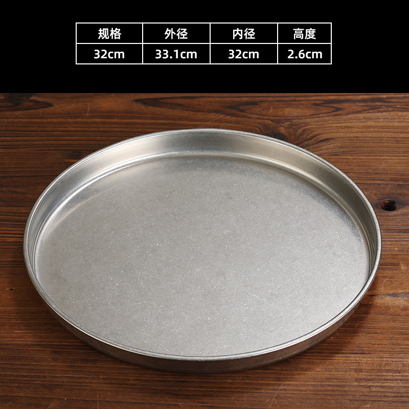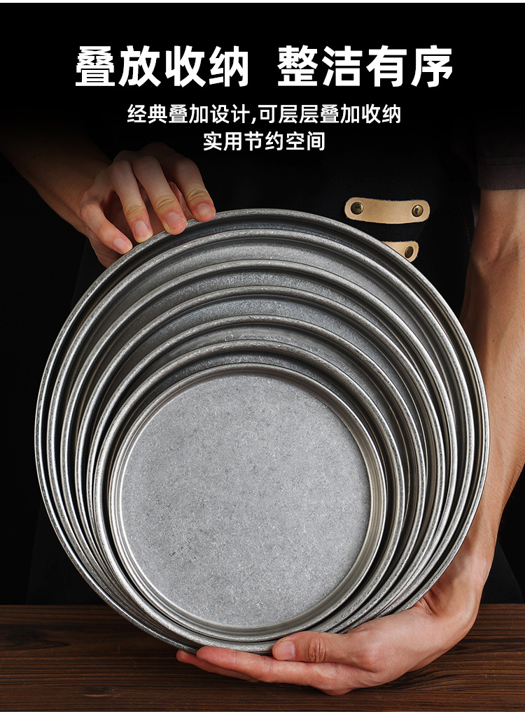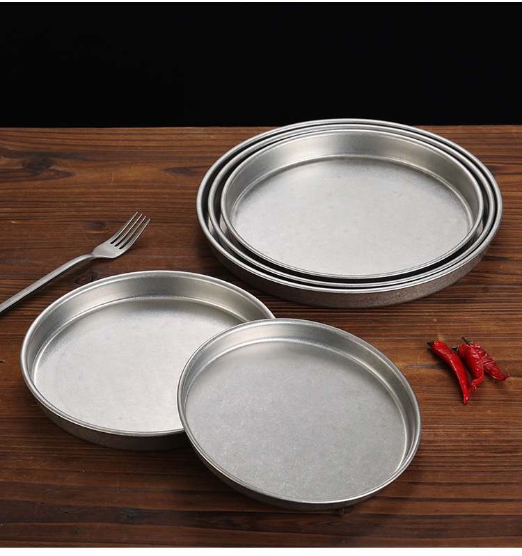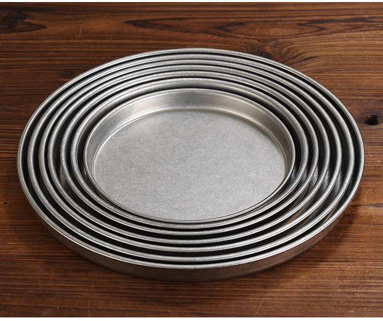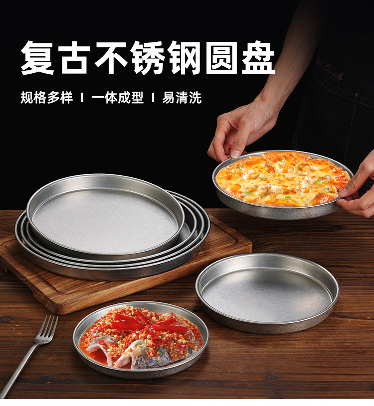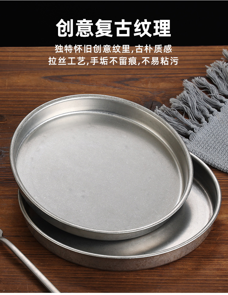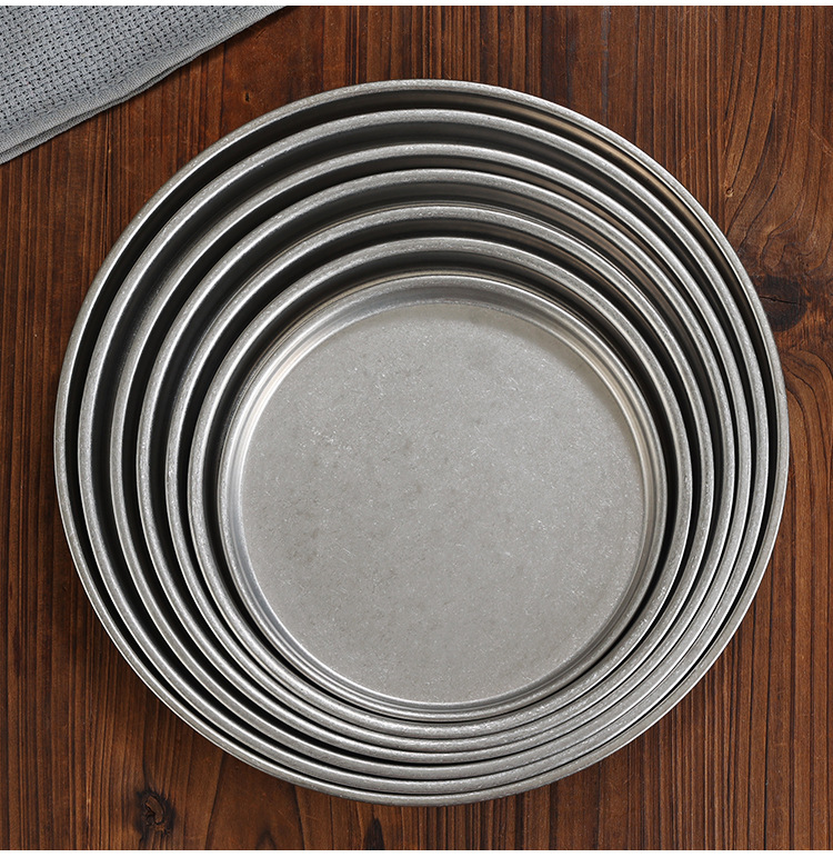 빈티지 스테인레스 스틸 디스크 대형 트레이 플랫 하단 얕은 플레이트 딥 플레이트 베이킹 플레이트 핫 팟 접시 접시 케이크 플레이트 카페 과일 플레이트스토어 가기