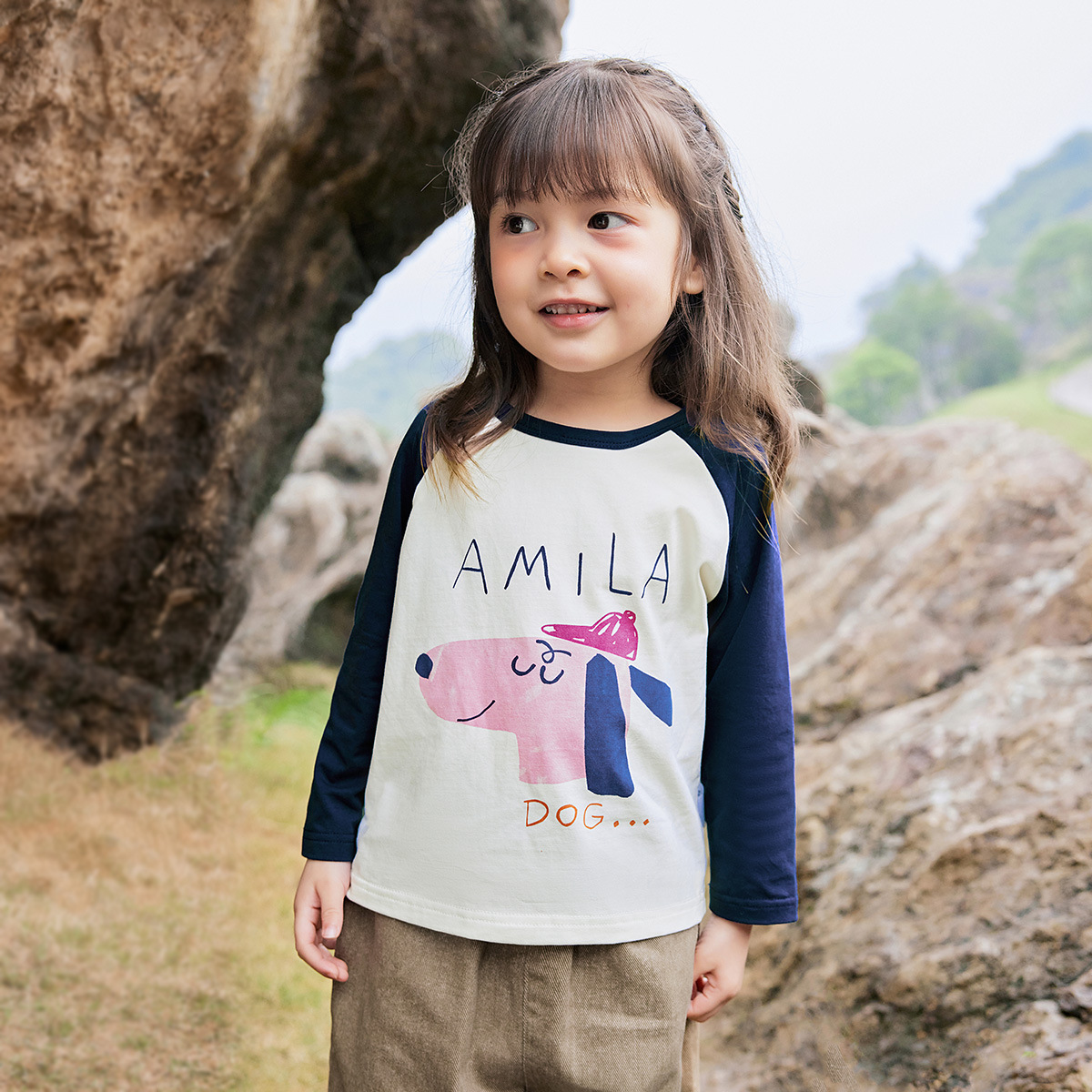 Amila 아동복 2025 가을 새 스타일 소녀와 아기 어린애 같은 귀여운 스티치 대비 색상 바닥 셔츠 만화 티셔츠스토어 가기