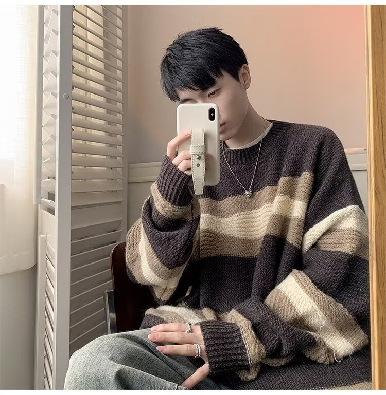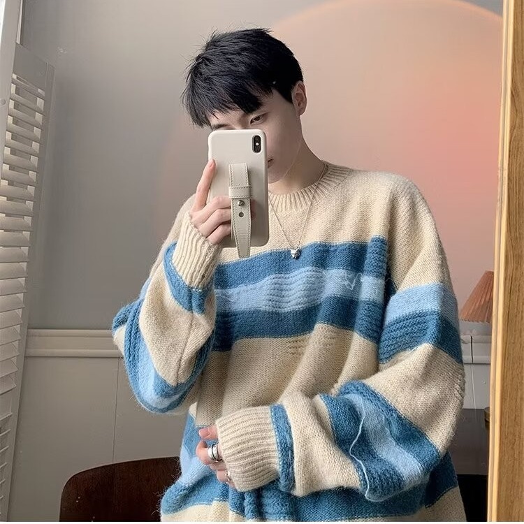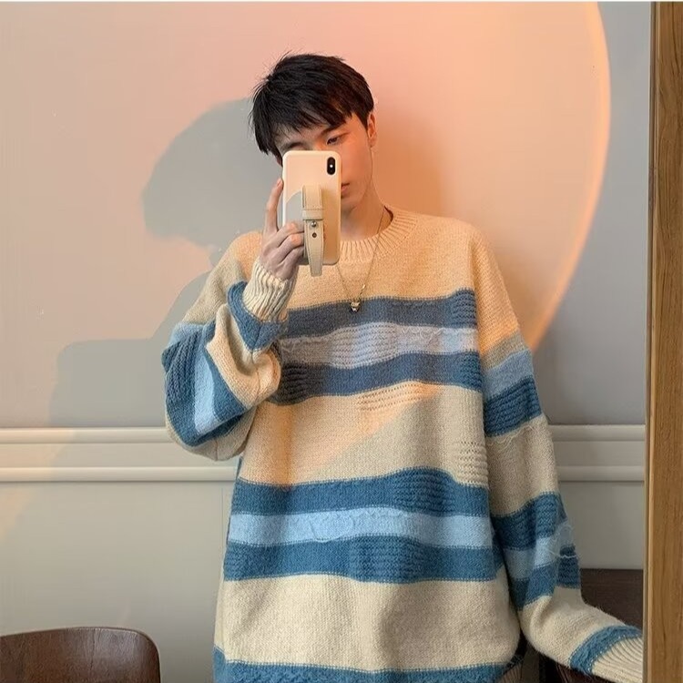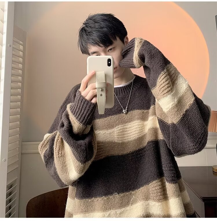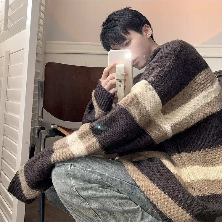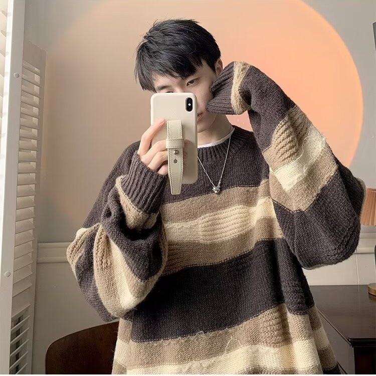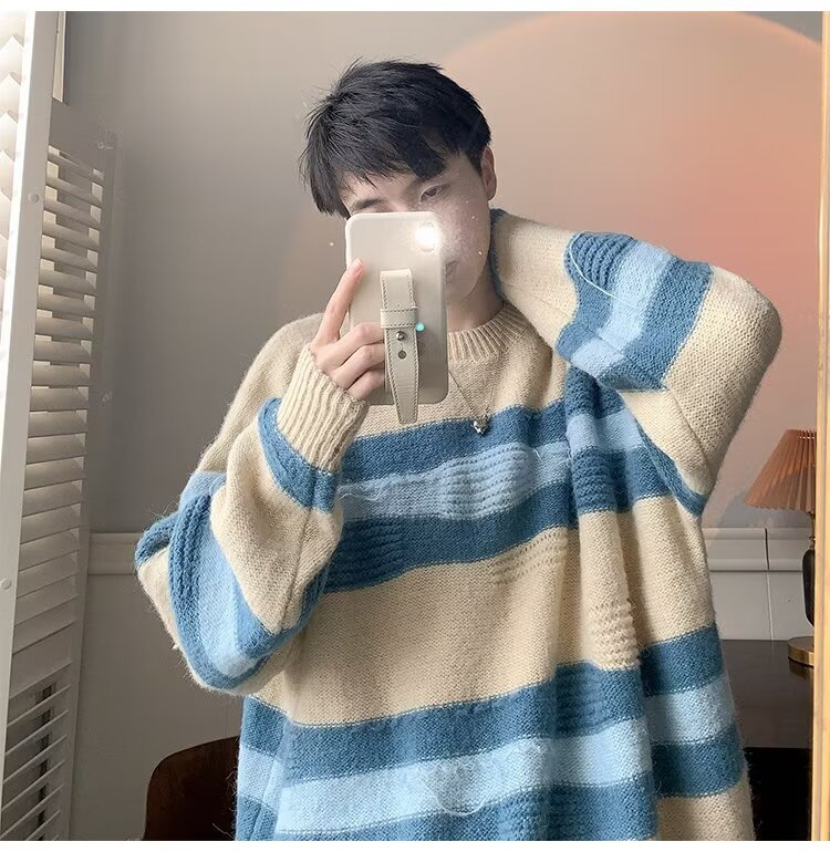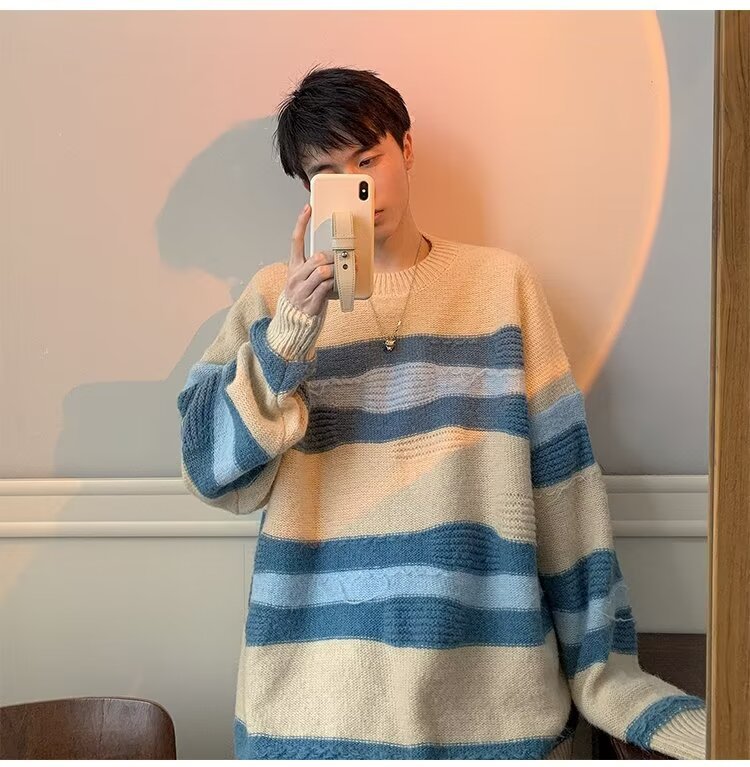 대비 색 줄무늬 스웨터 남성 겨울 유행 브랜드 느슨한 두꺼운 디자인 라운드 넥 스웨터 게으른 스타일 커플 재킷스토어 가기