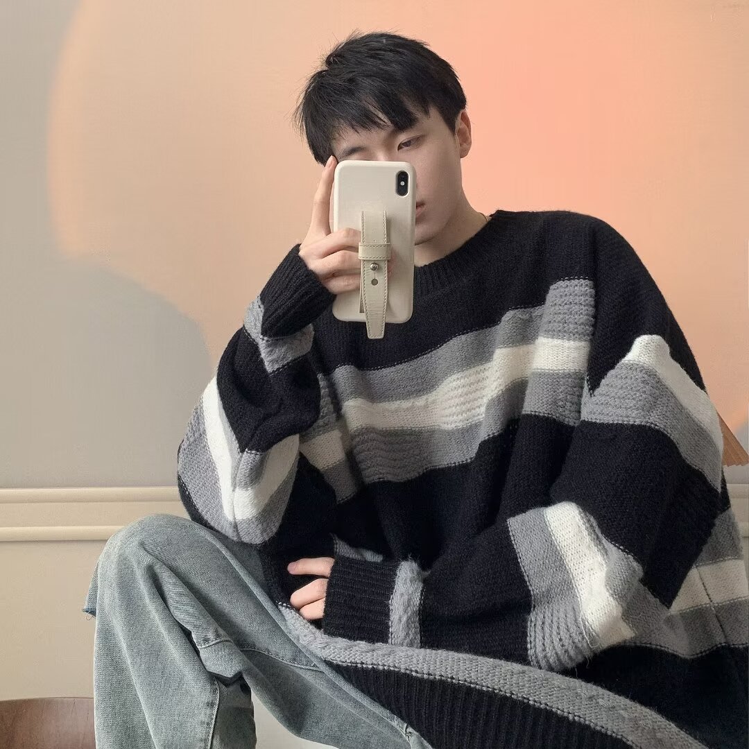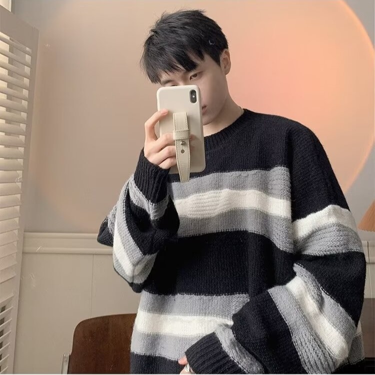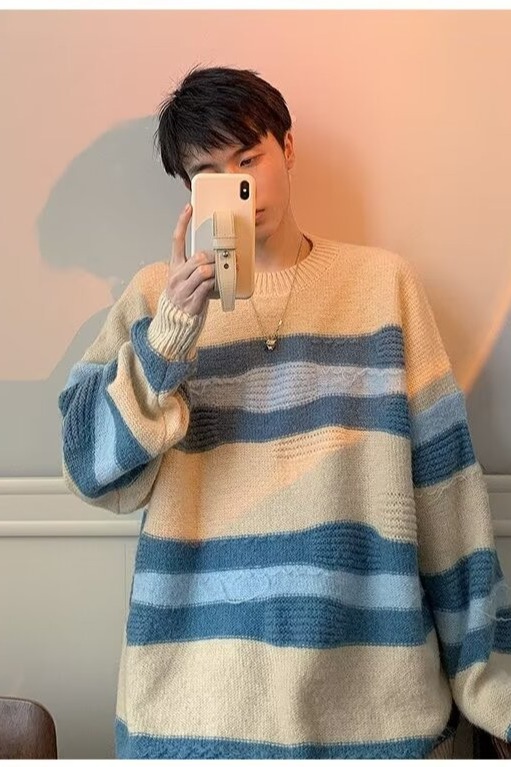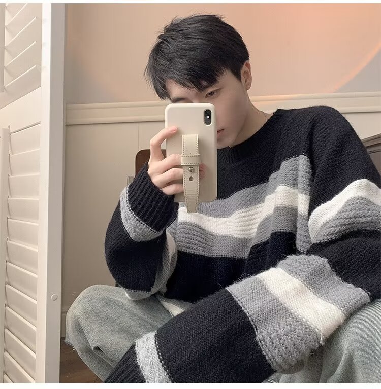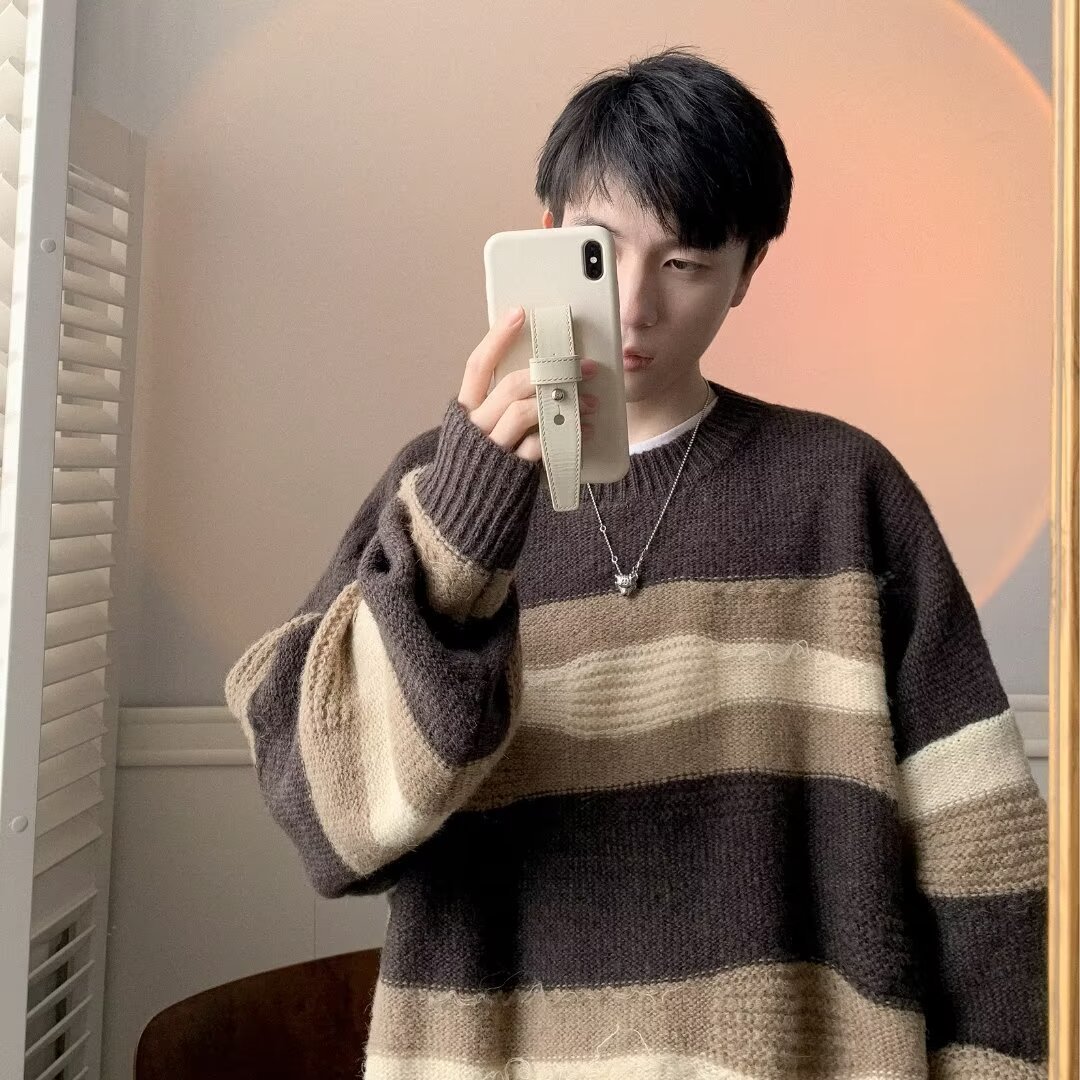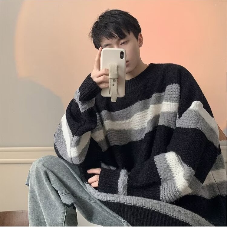 대비 색 줄무늬 스웨터 남성 겨울 유행 브랜드 느슨한 두꺼운 디자인 라운드 넥 스웨터 게으른 스타일 커플 재킷스토어 가기
