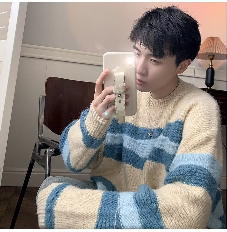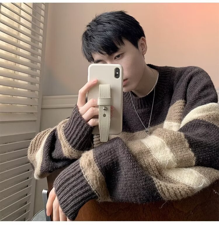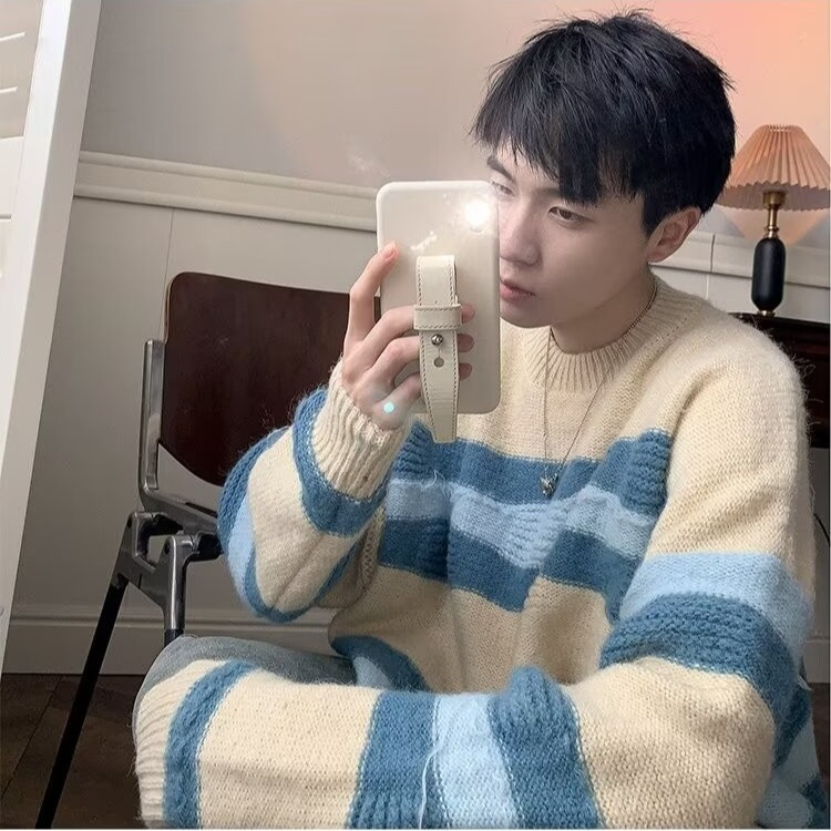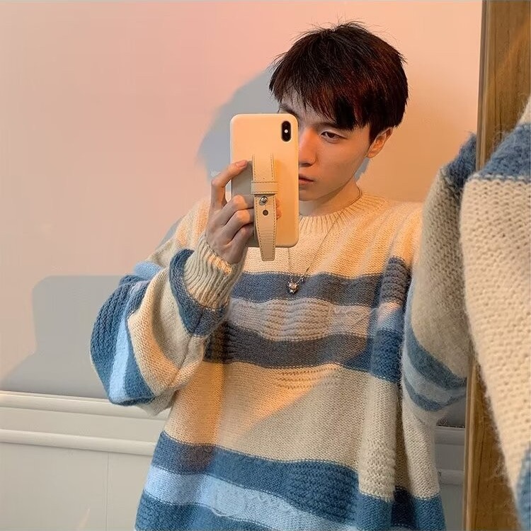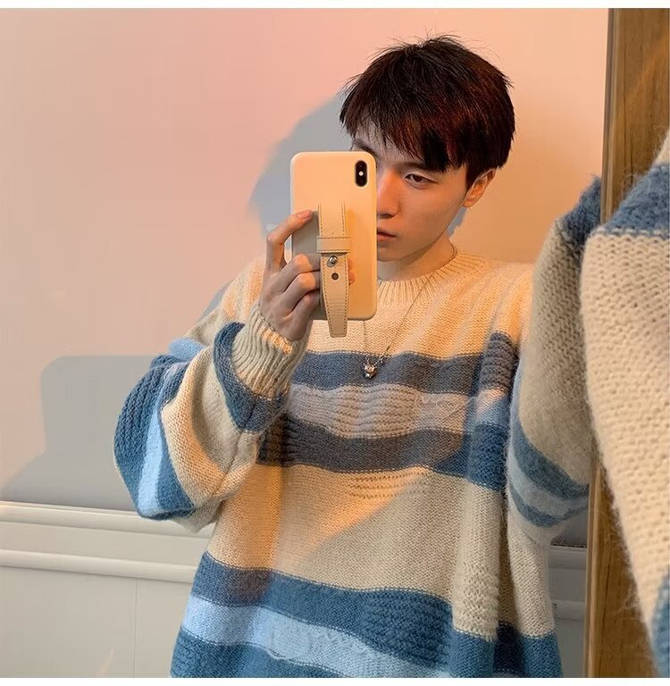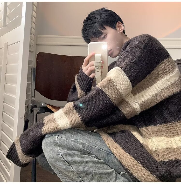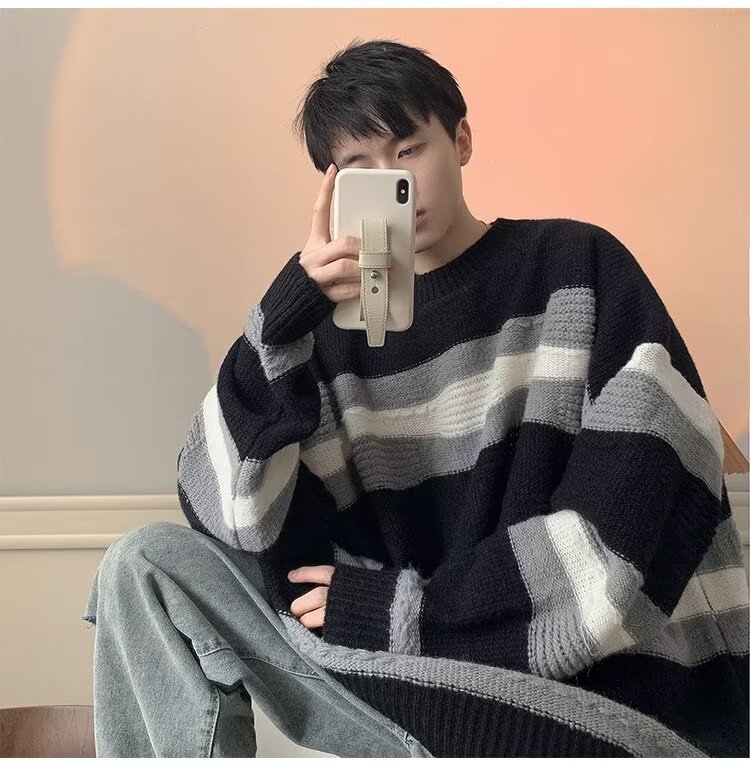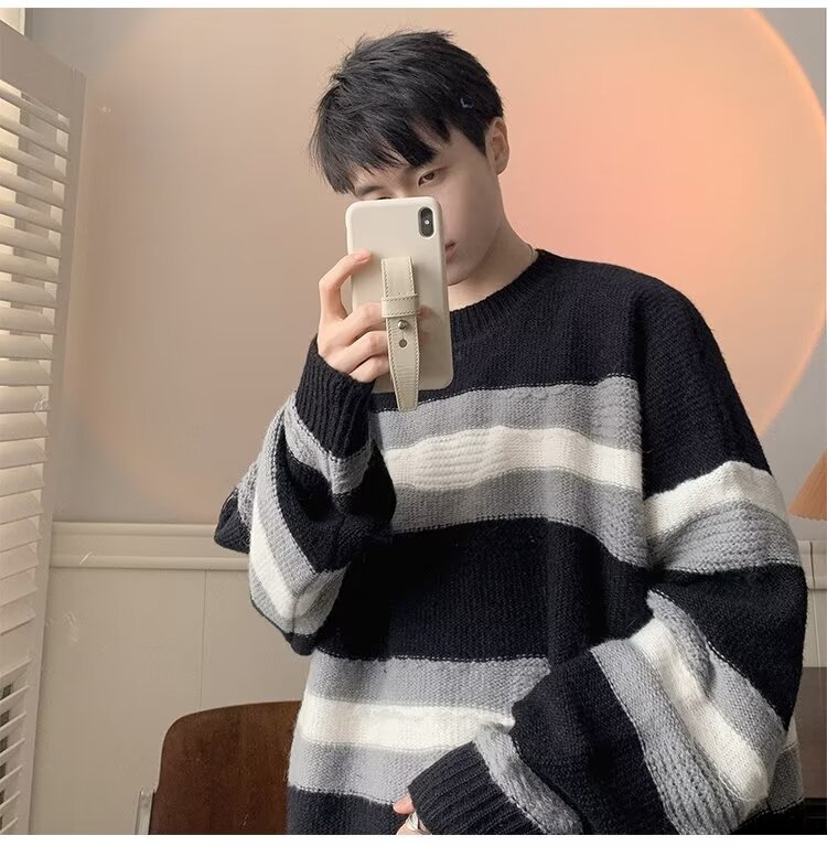 대비 색 줄무늬 스웨터 남성 겨울 유행 브랜드 느슨한 두꺼운 디자인 라운드 넥 스웨터 게으른 스타일 커플 재킷스토어 가기