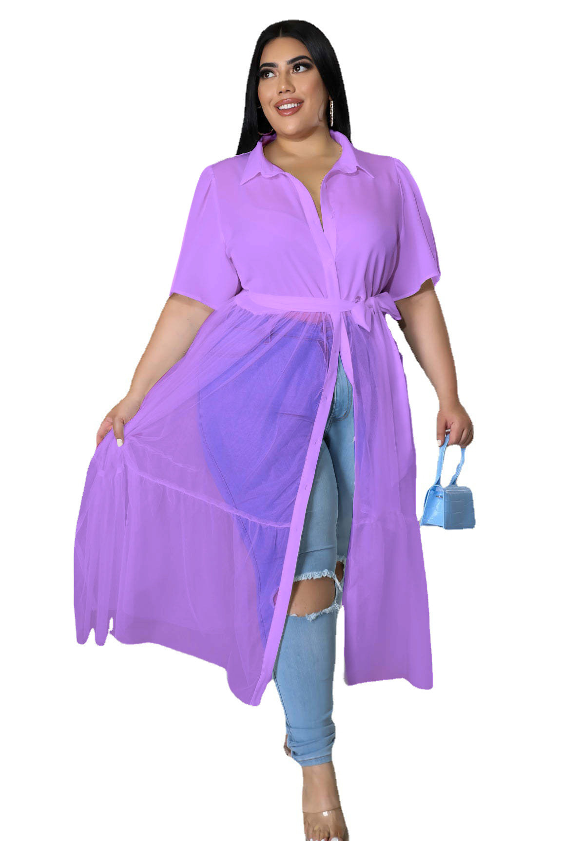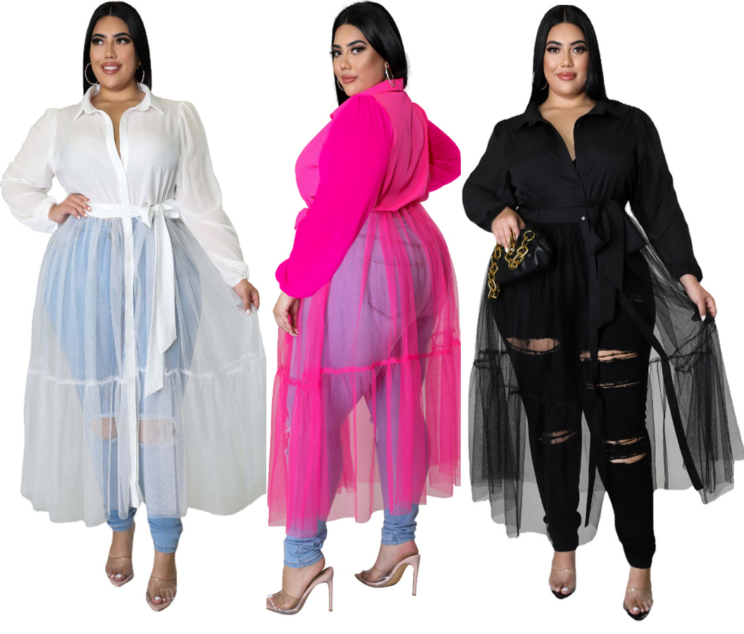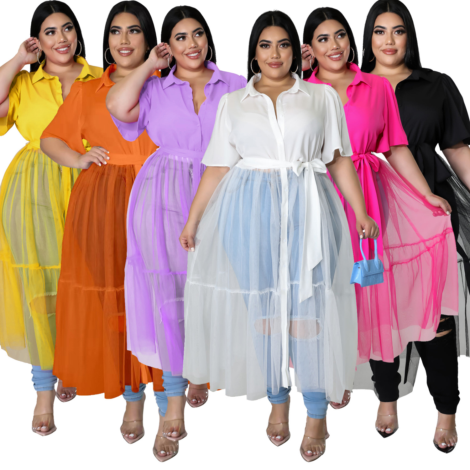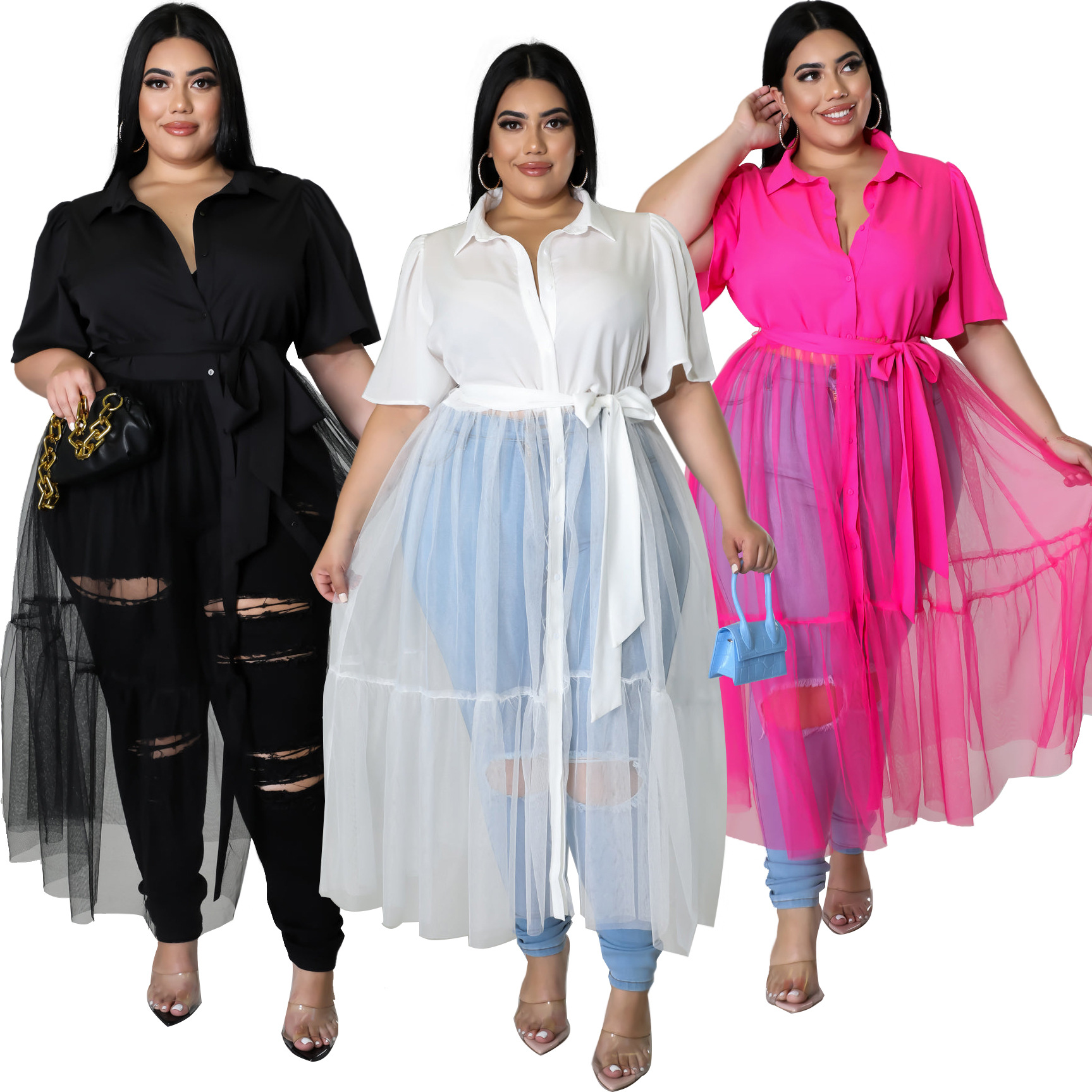 QJ5298 유럽과 미국의 국경 간 뚱뚱한 여성 플러스 사이즈 여성 쉬폰 메쉬 주름 탑 캐주얼 원피스스토어 가기