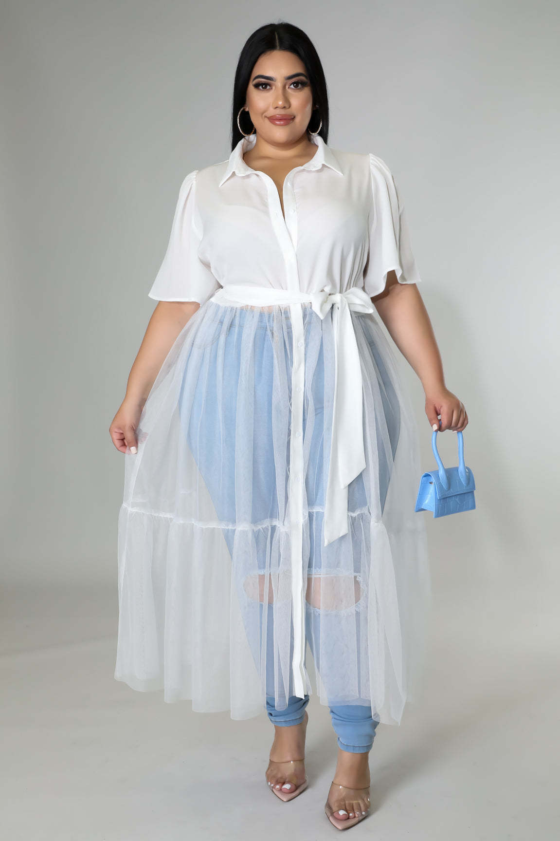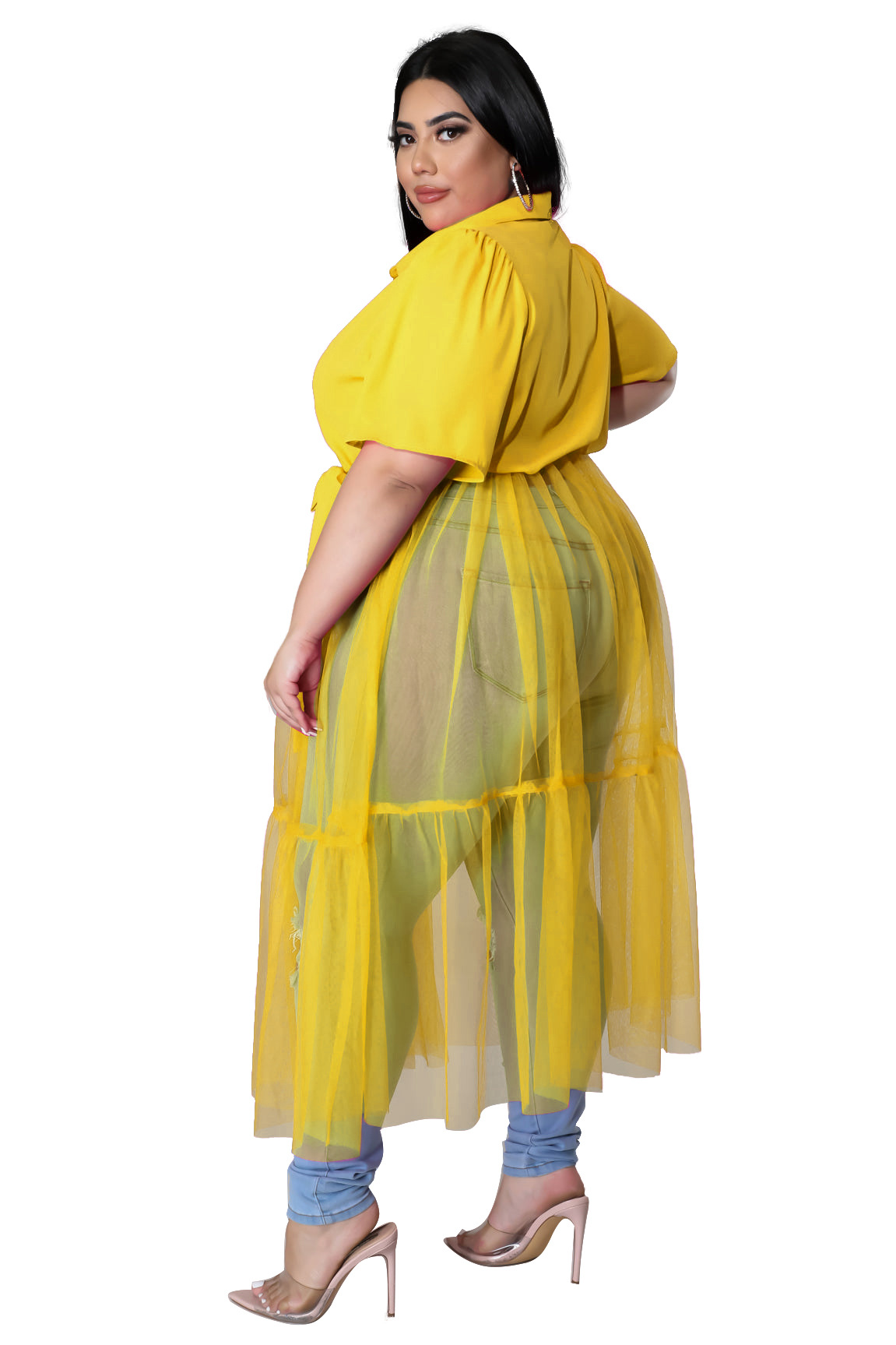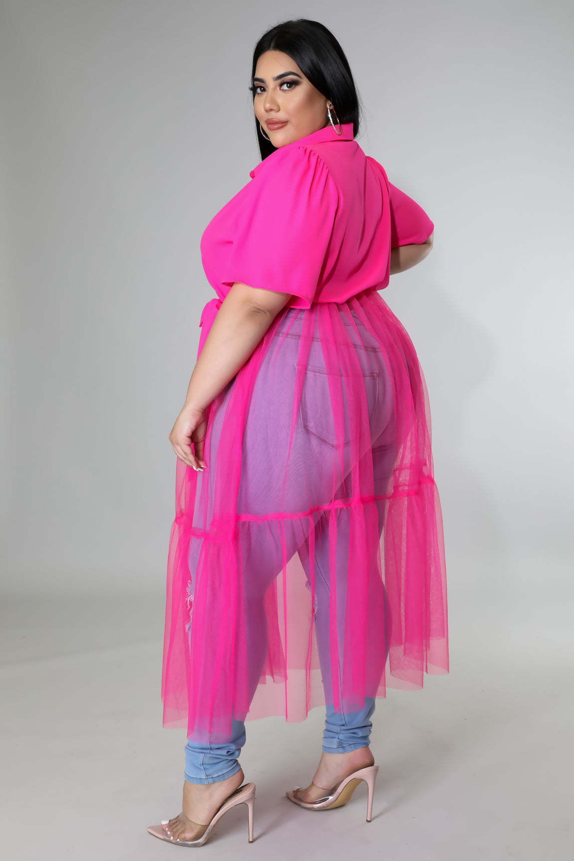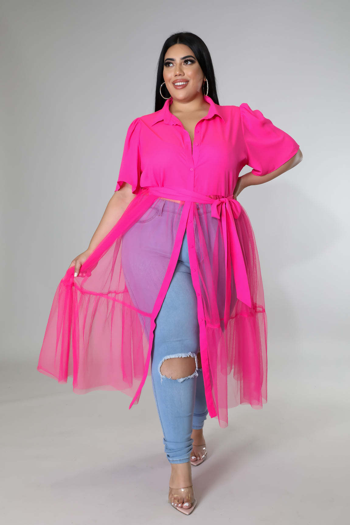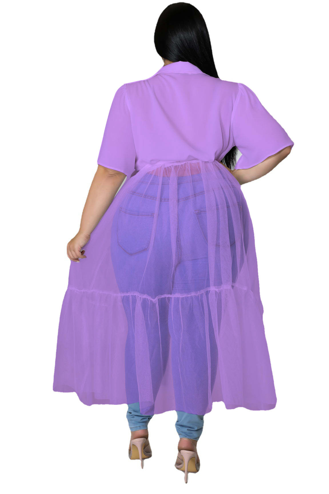 QJ5298 유럽과 미국의 국경 간 뚱뚱한 여성 플러스 사이즈 여성 쉬폰 메쉬 주름 탑 캐주얼 원피스스토어 가기
