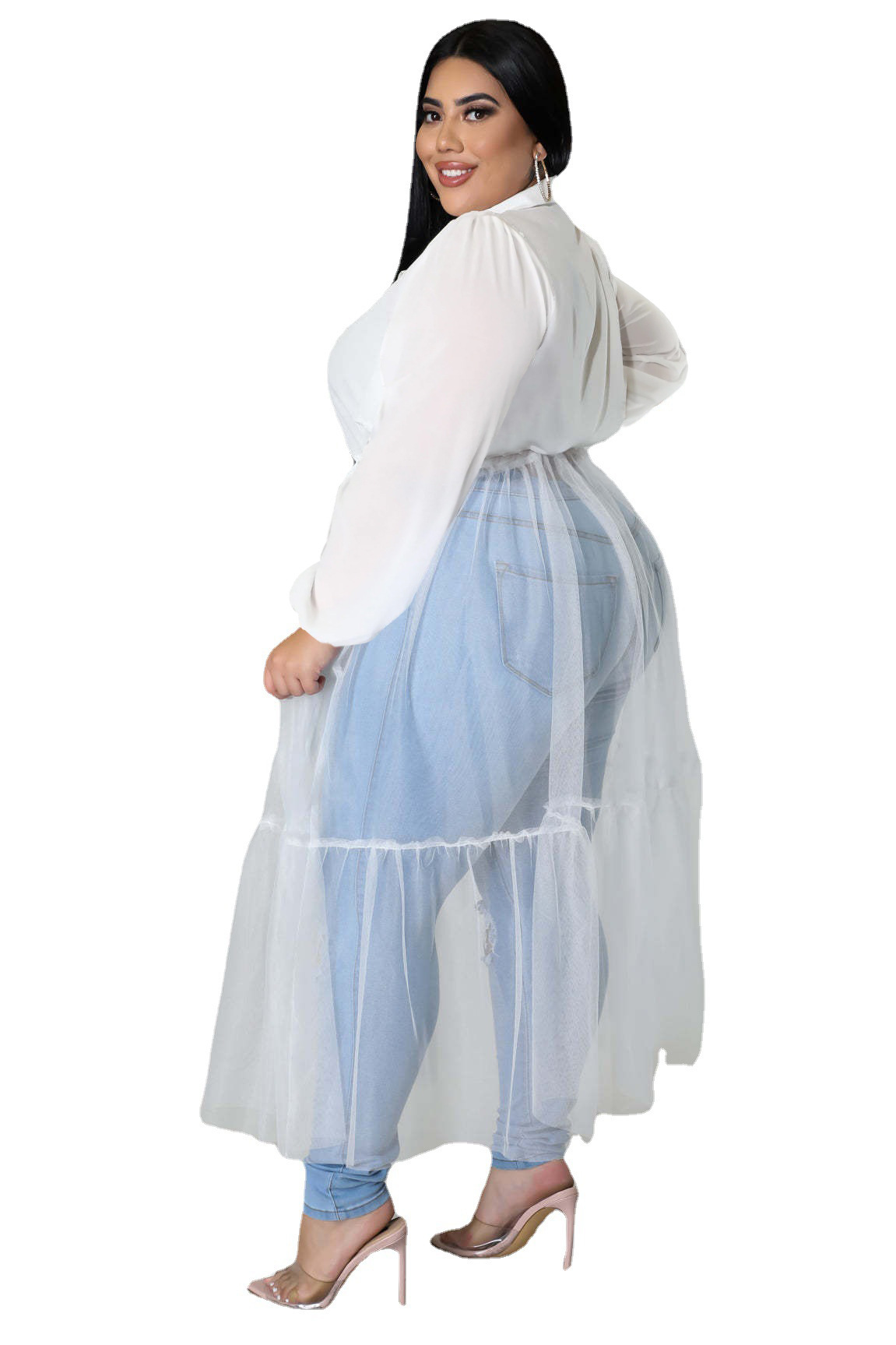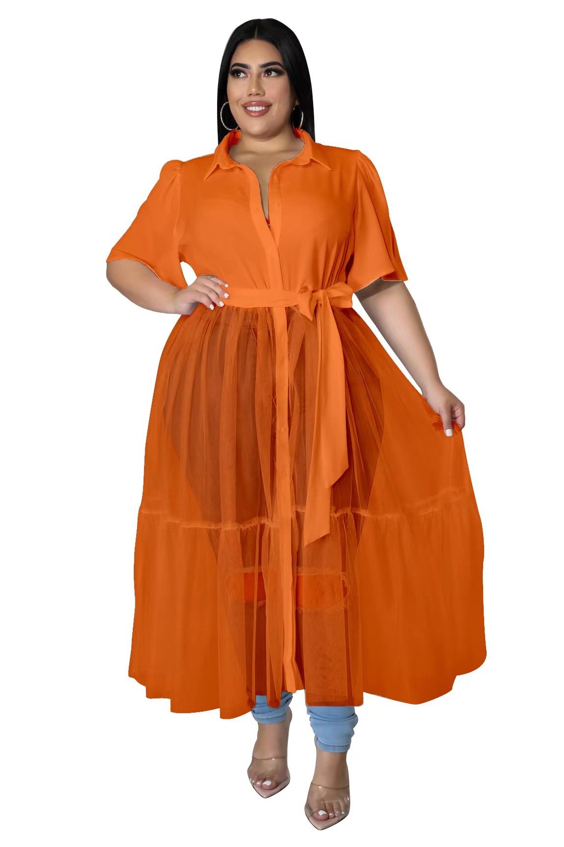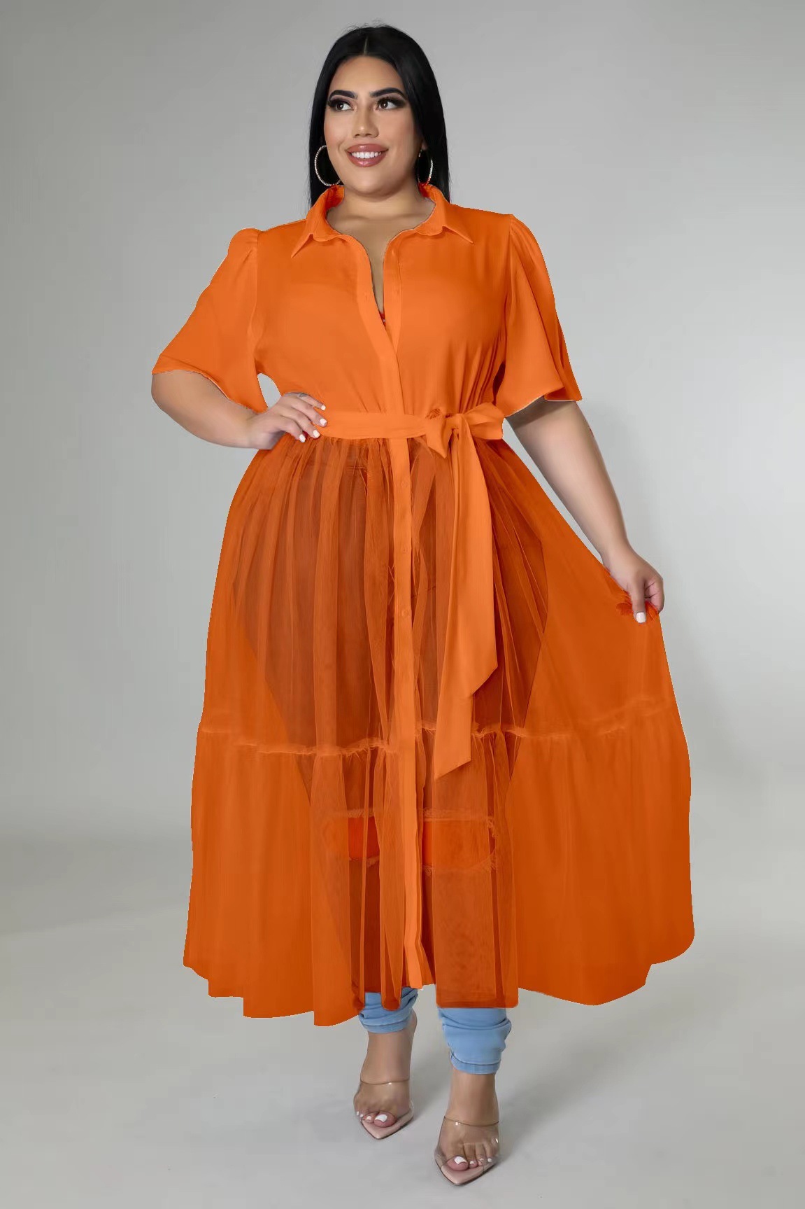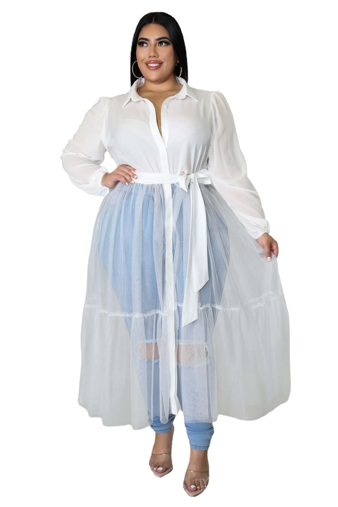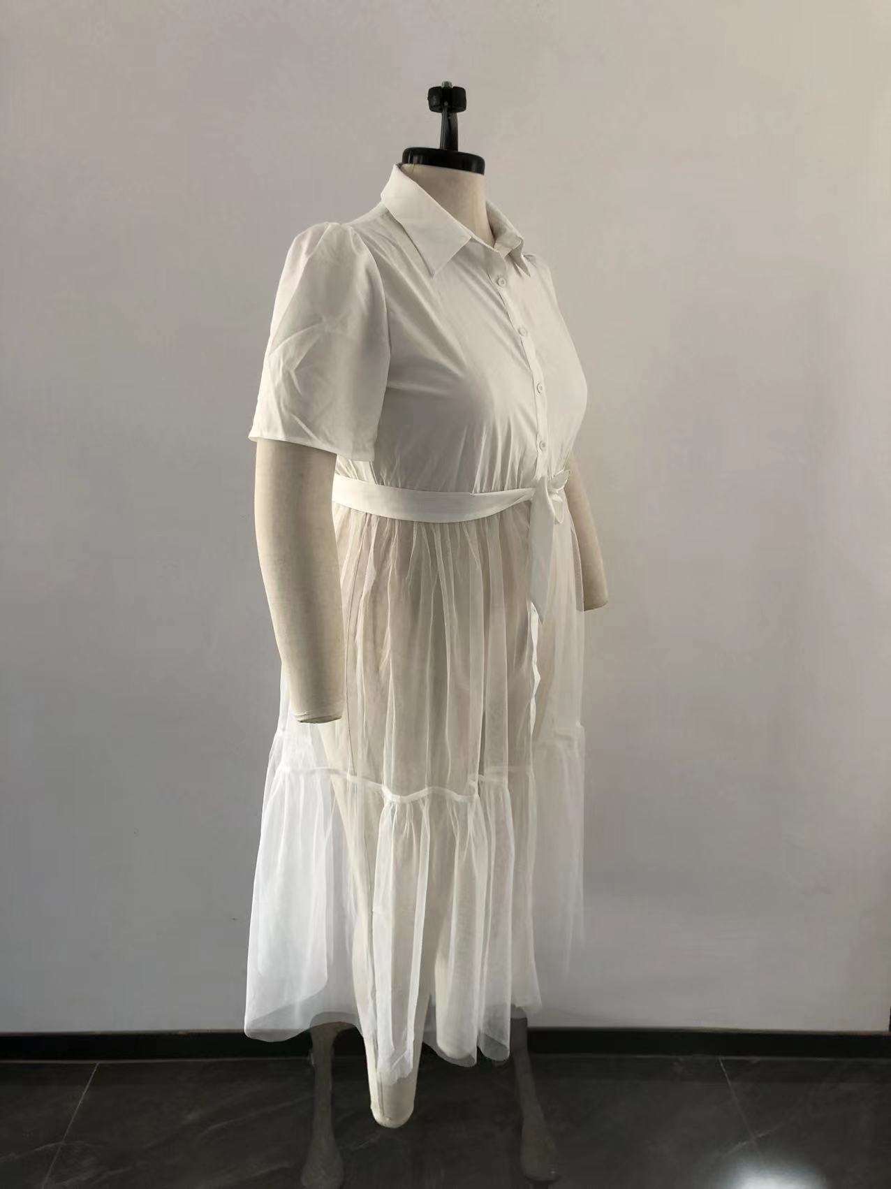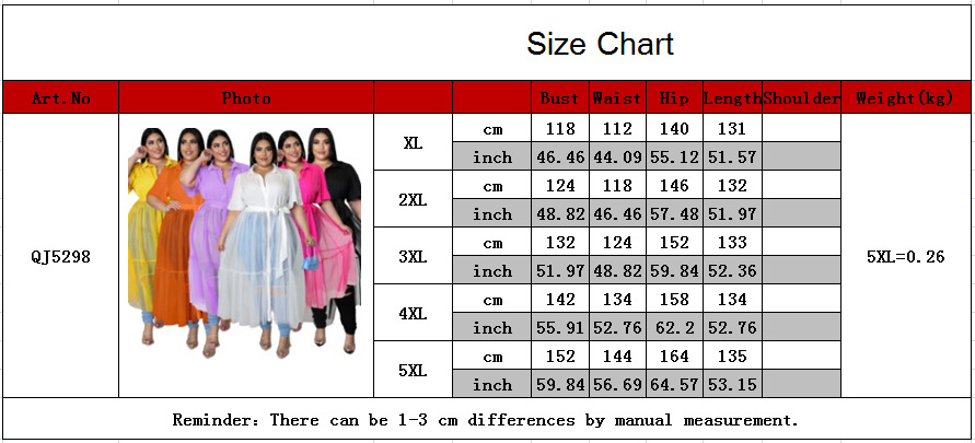 QJ5298 유럽과 미국의 국경 간 뚱뚱한 여성 플러스 사이즈 여성 쉬폰 메쉬 주름 탑 캐주얼 원피스