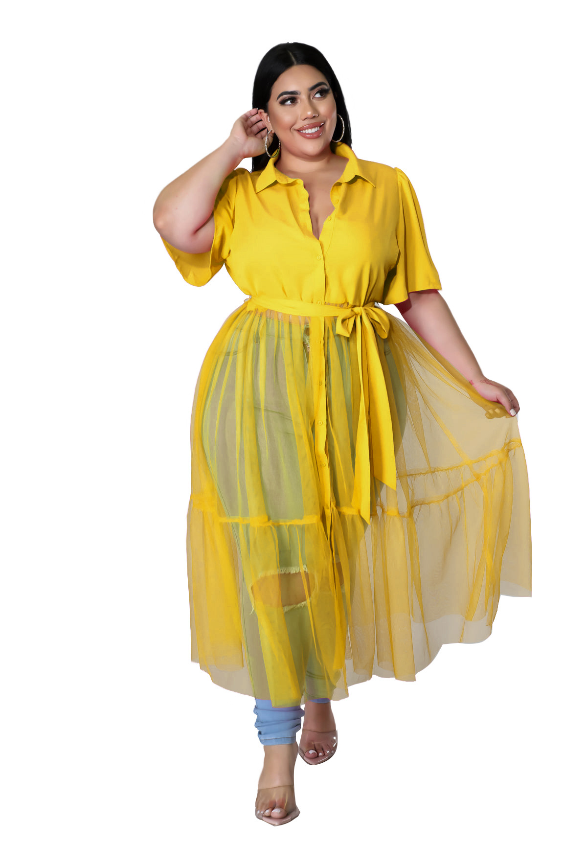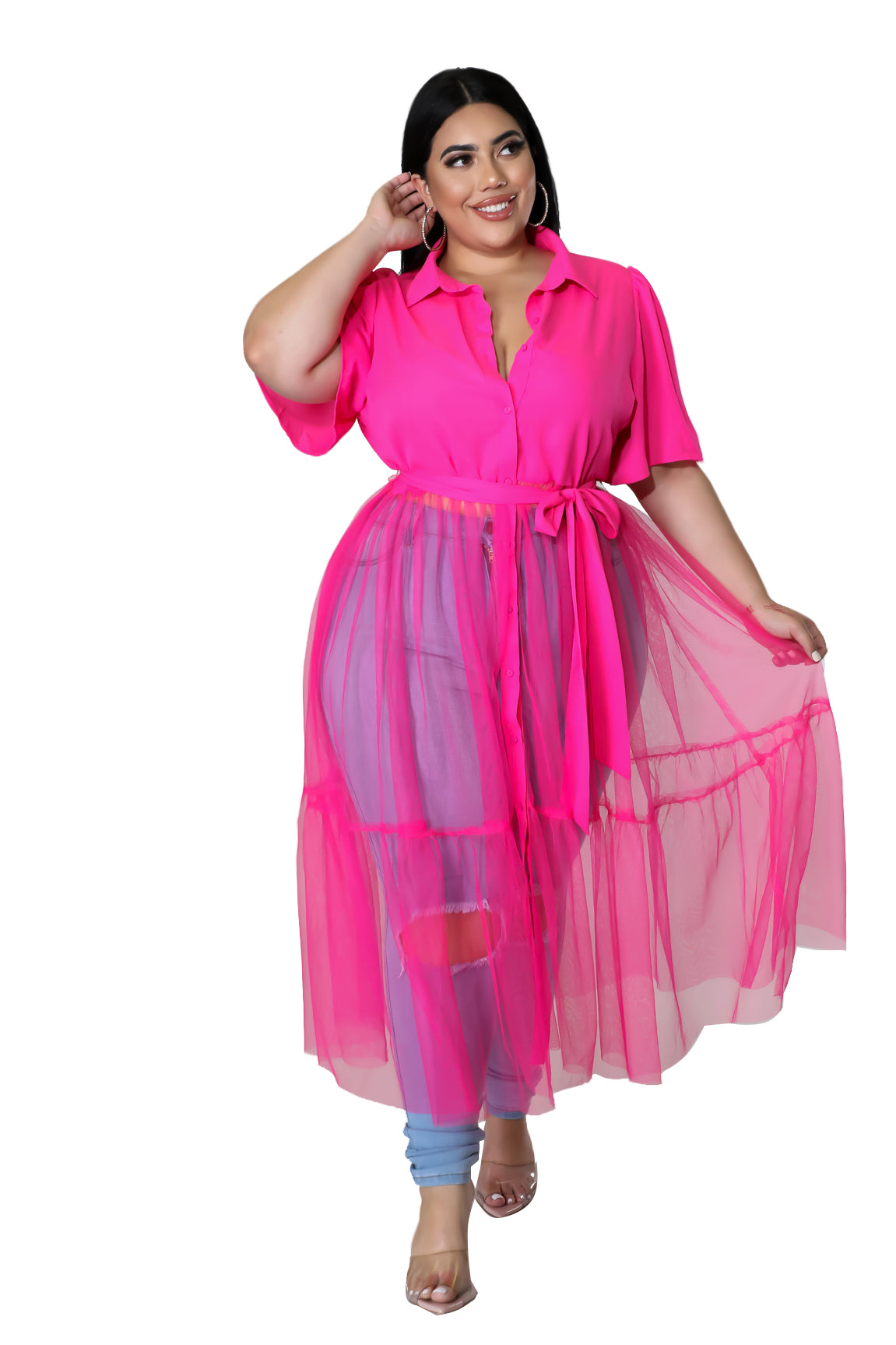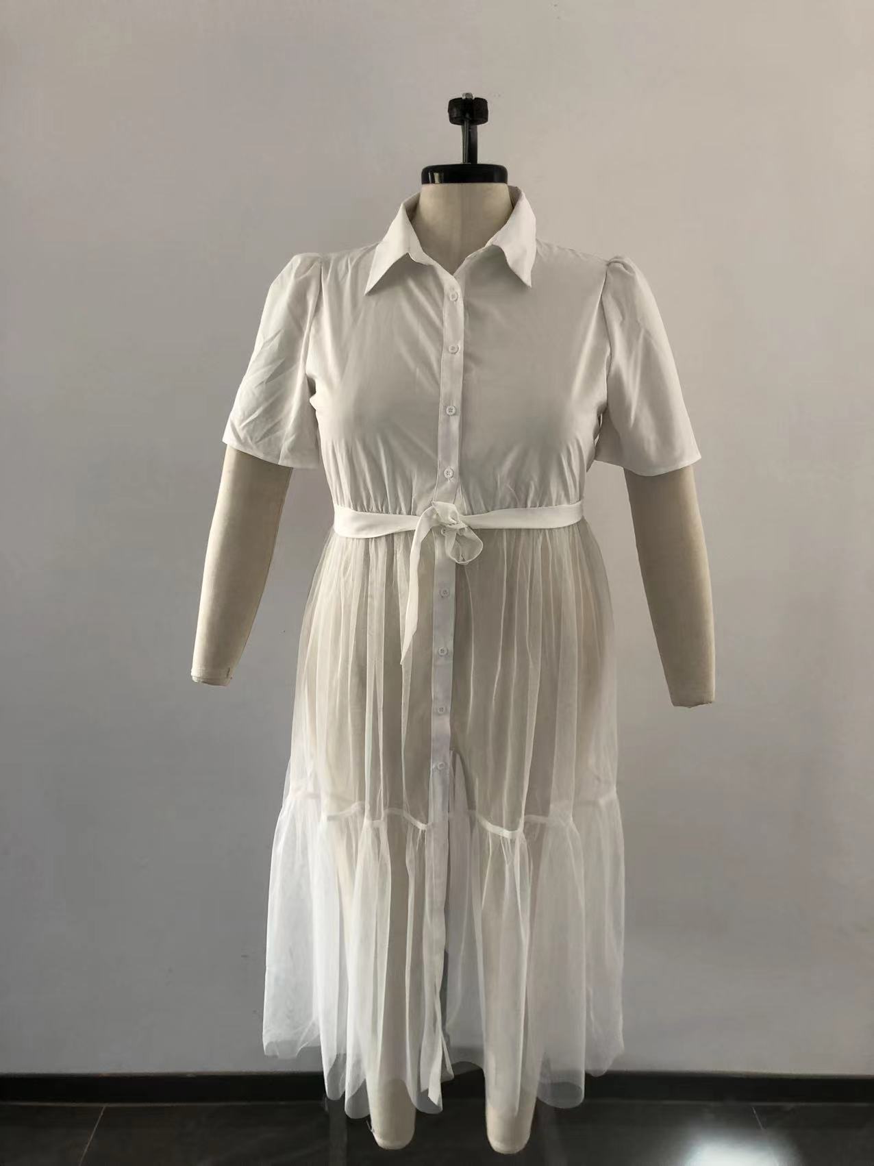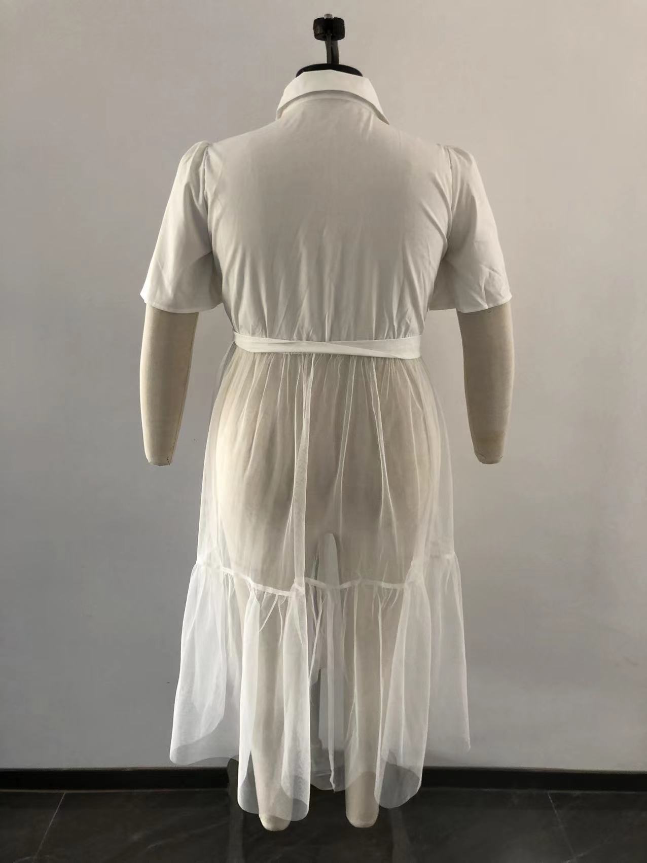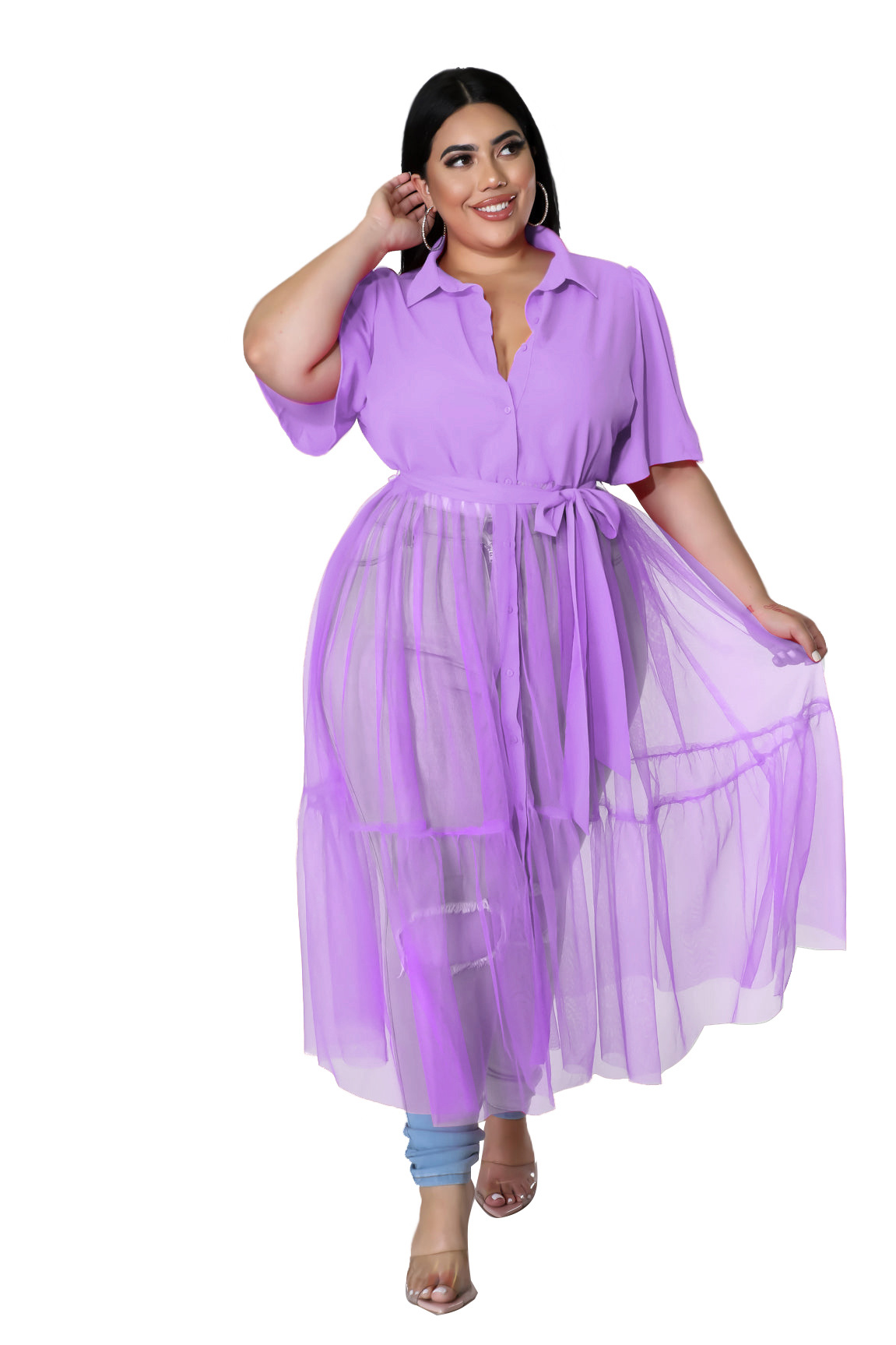 QJ5298 유럽과 미국의 국경 간 뚱뚱한 여성 플러스 사이즈 여성 쉬폰 메쉬 주름 탑 캐주얼 원피스