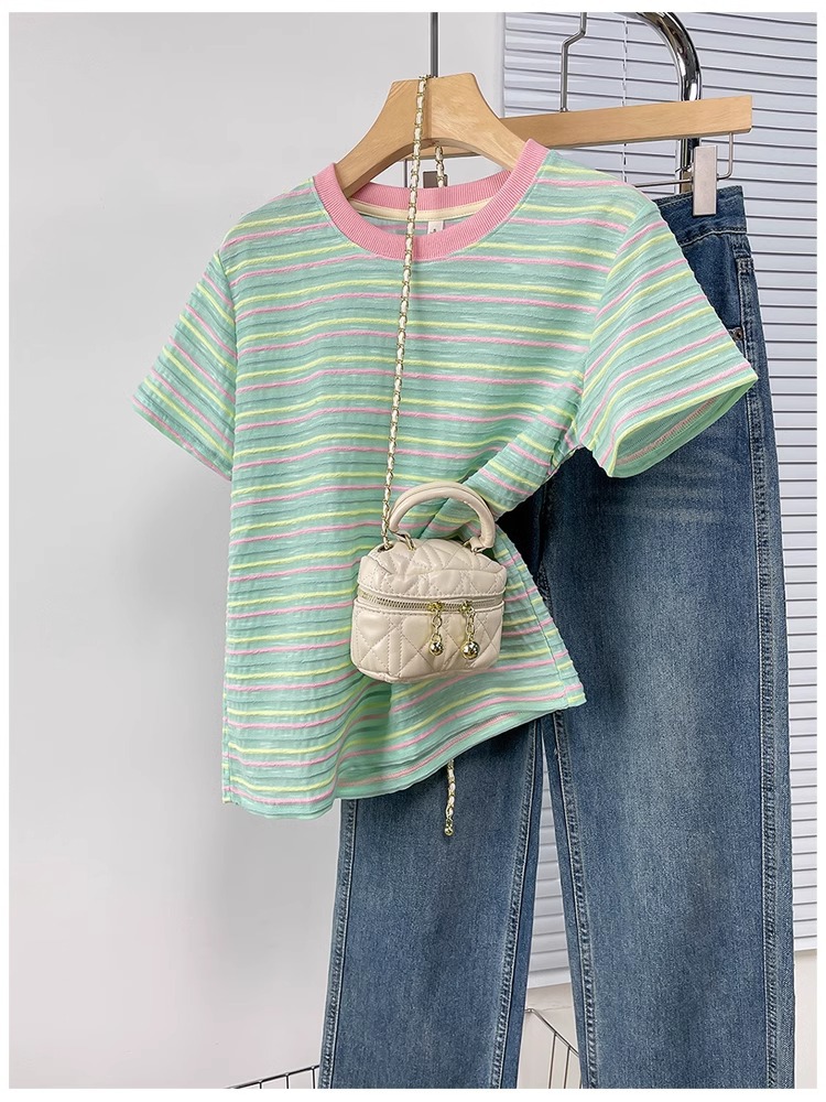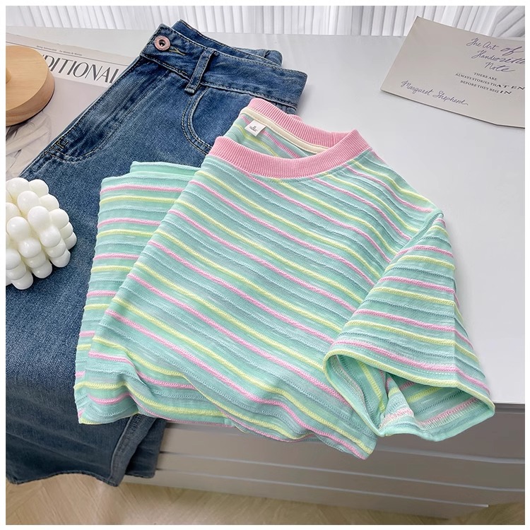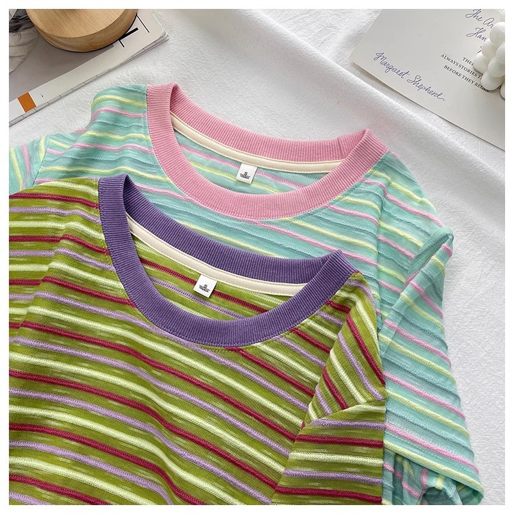 여름 새로운 디자인 센스 컬러 스트라이프 반팔 티셔츠 여성의 여름 새로운 느슨한 슬리밍 플러스 사이즈 세련된 탑스토어 가기