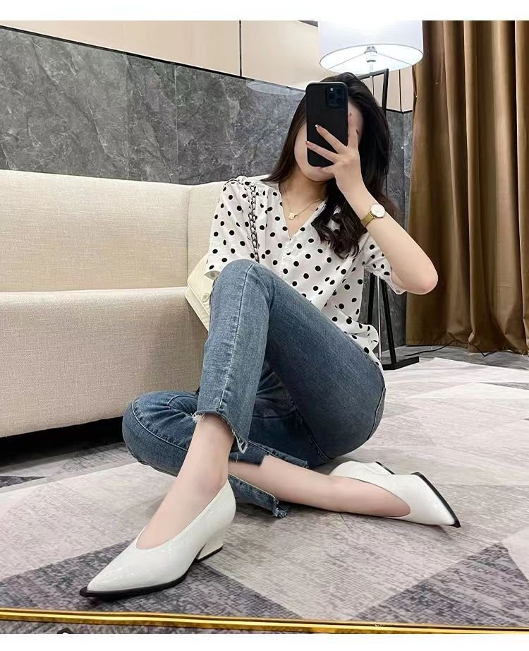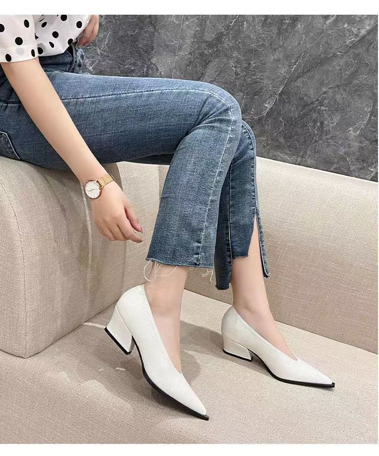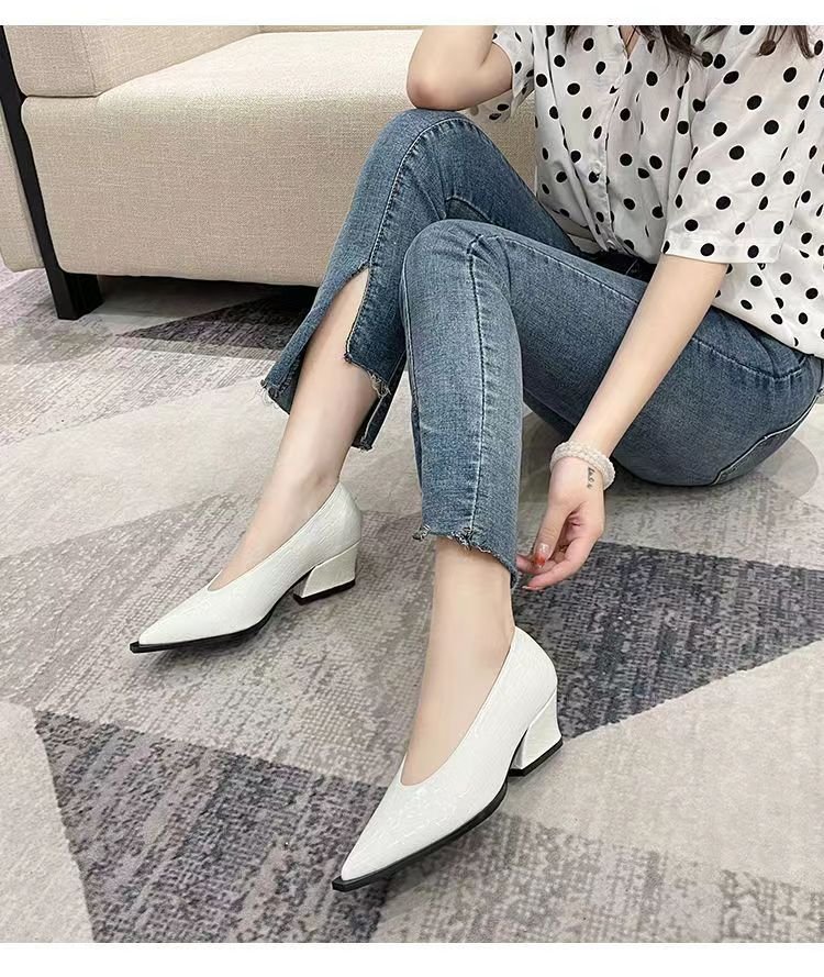 2025 봄/가을 신상 블랙 포인티드 토 V컷 두꺼운 굽 여성용 패션 레이커스 가죽 미들힐 할머니 스타일 신발 여성 정장화스토어 가기