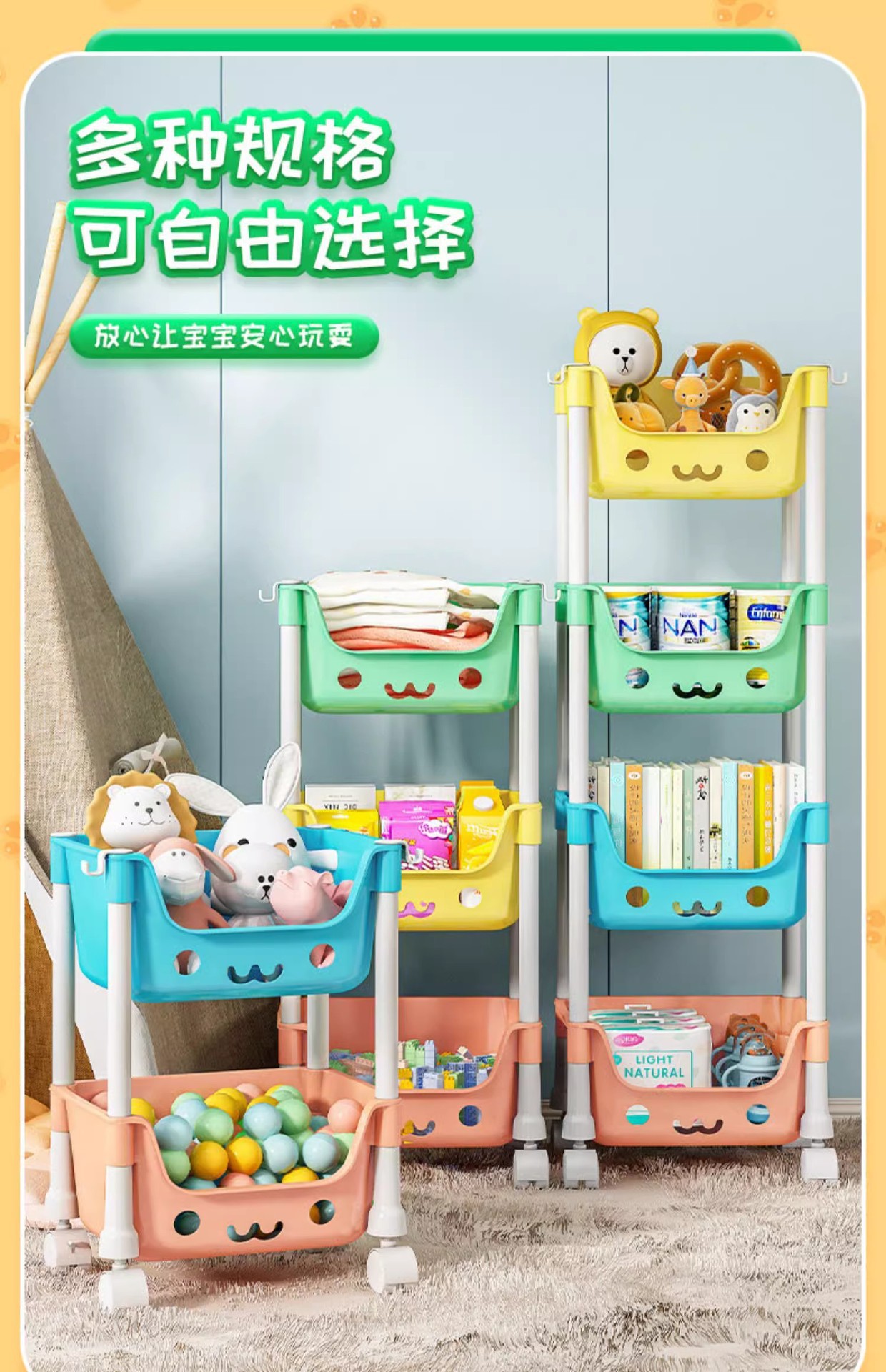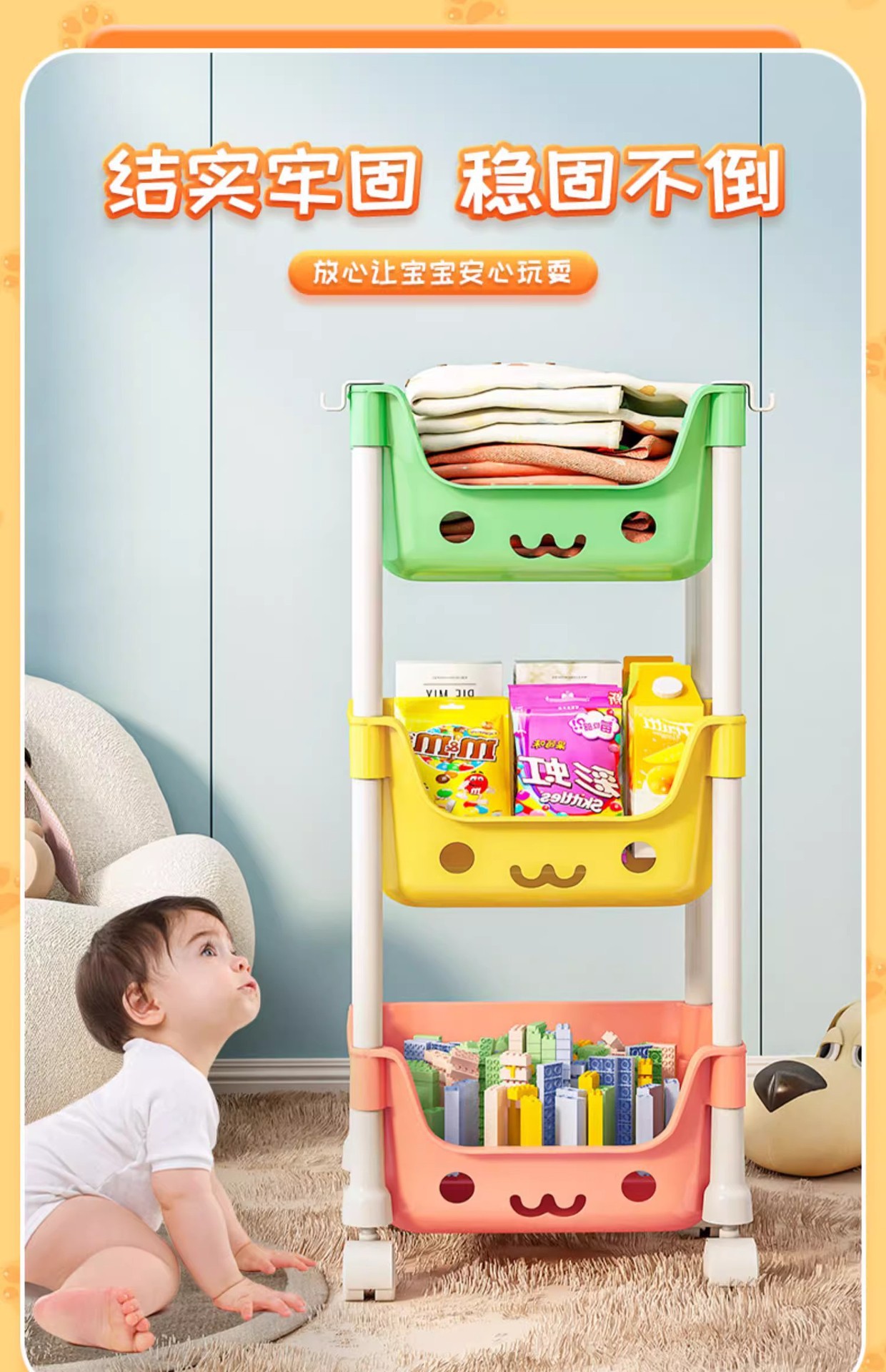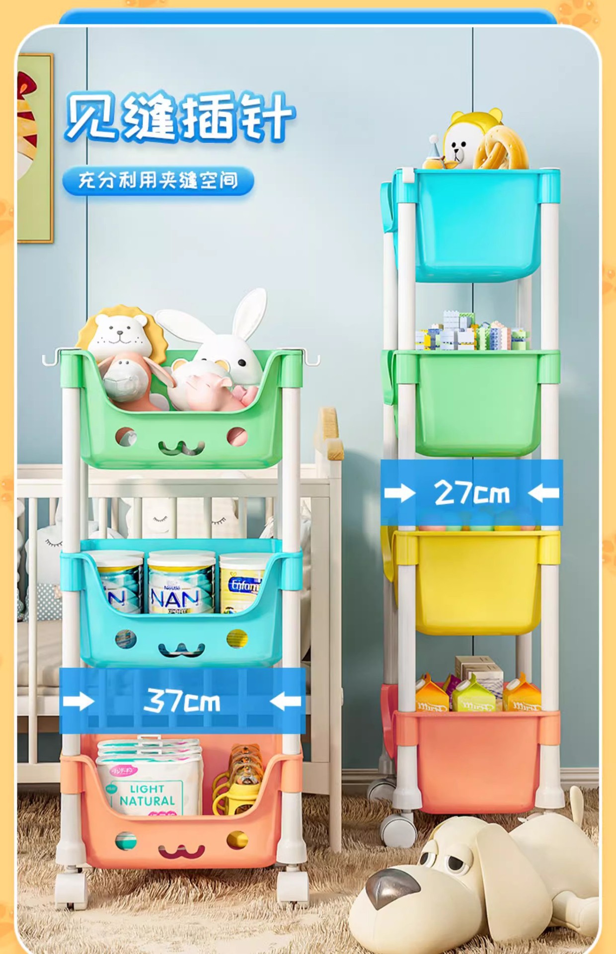 어린이 스낵 장난감 보관 랙 모바일 책꽂이 휠 스토리지 랙 가정용 다층 거실 주방 침실 마무리