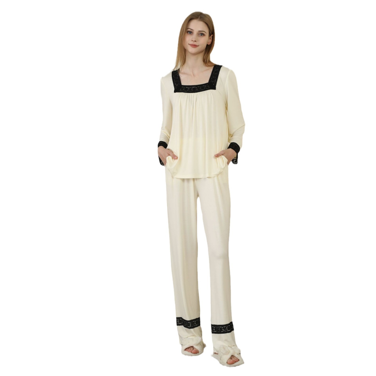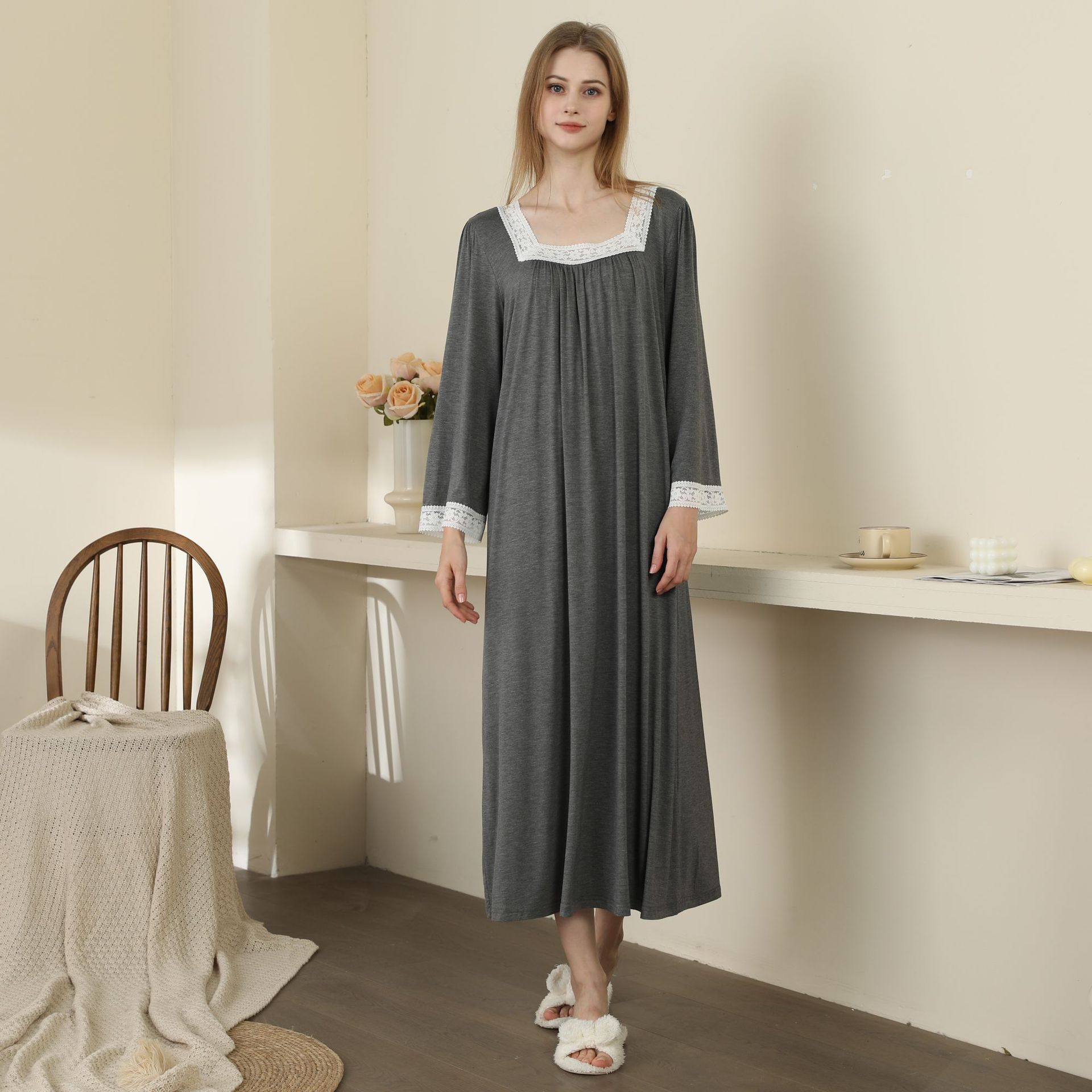 봄과 여름 새로운 스타일 잠옷 여성의 단색 간단한 스타일 레이스 칼라 긴 소매 나이트 드레스 모달 섹시한 홈 옷스토어 가기