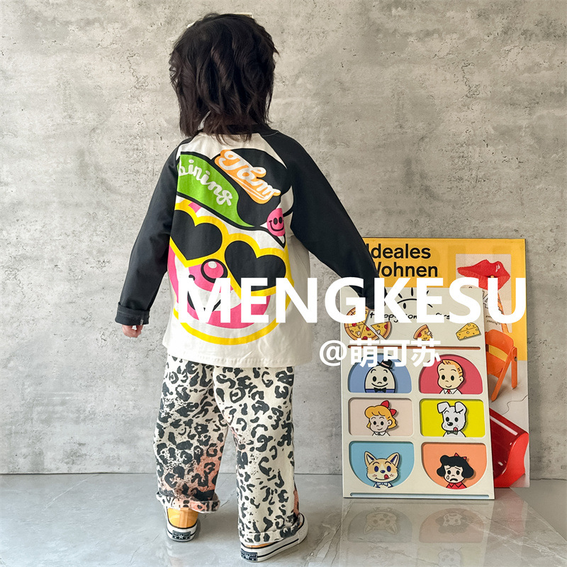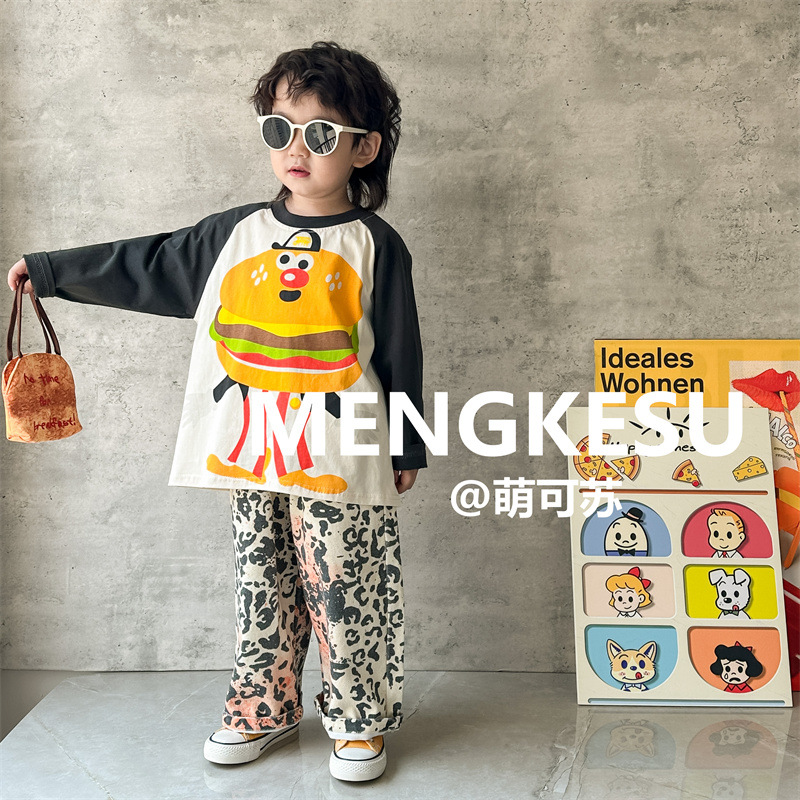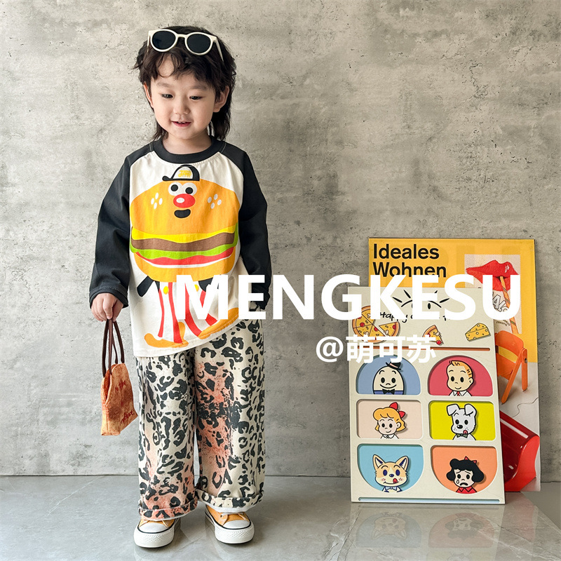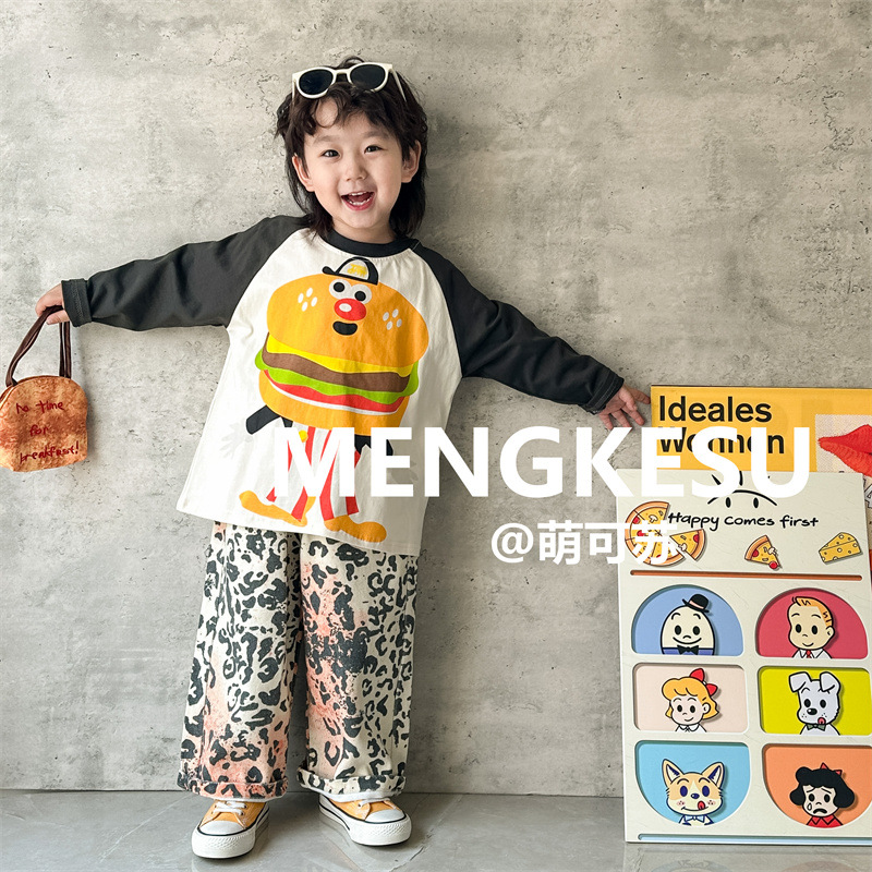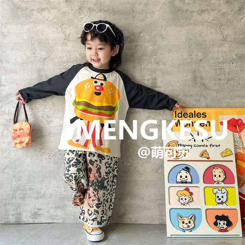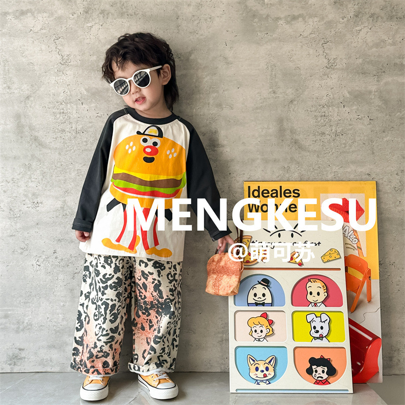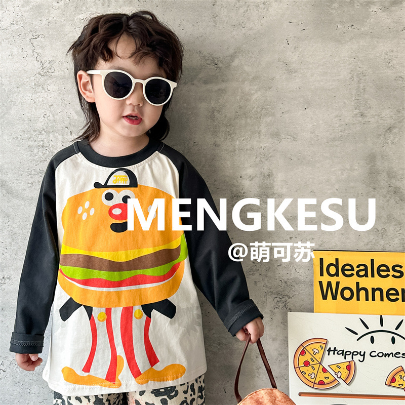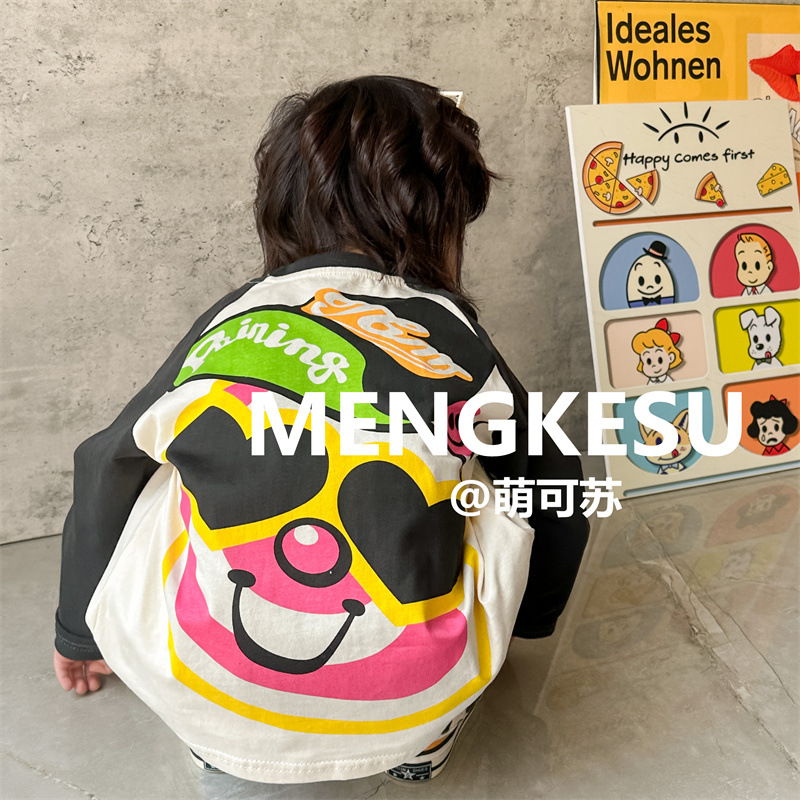 Meng Su 아동복 어린이 긴팔 티셔츠 2024 가을 패션 브랜드 아기 만화 긴팔 소년베이스 셔츠 중소 어린이 탑스토어 가기