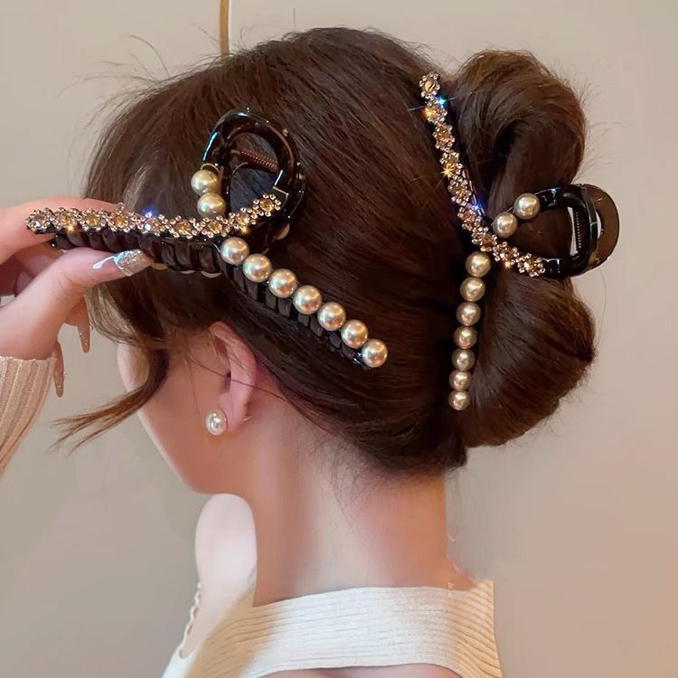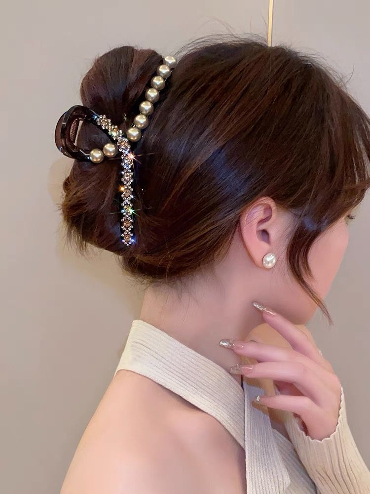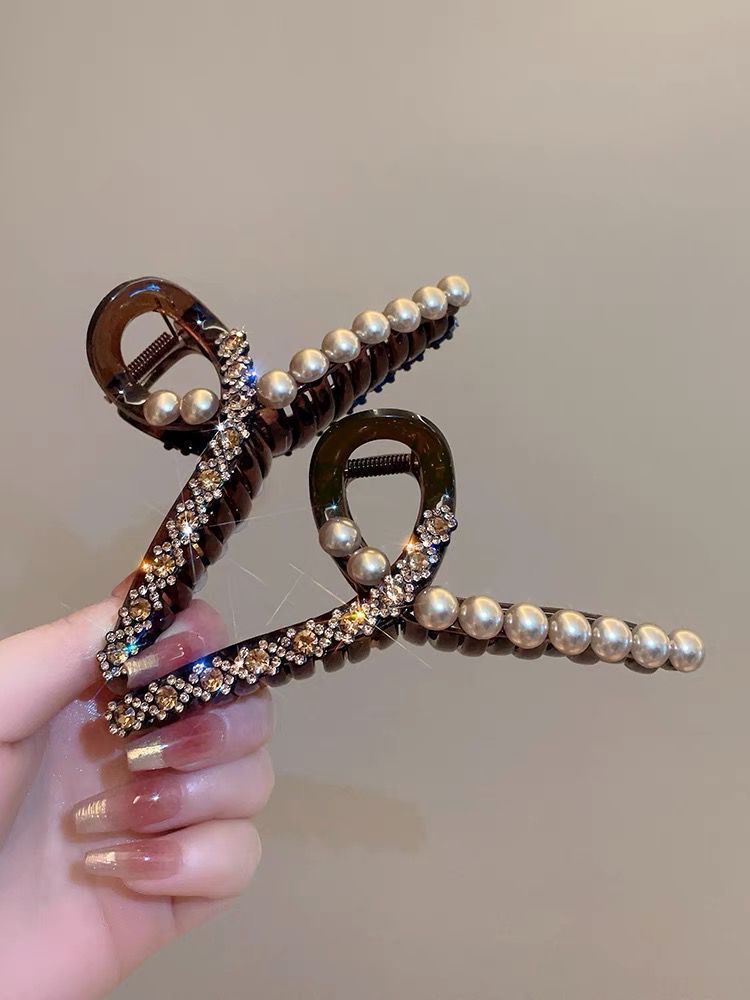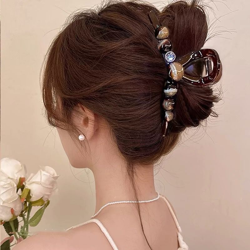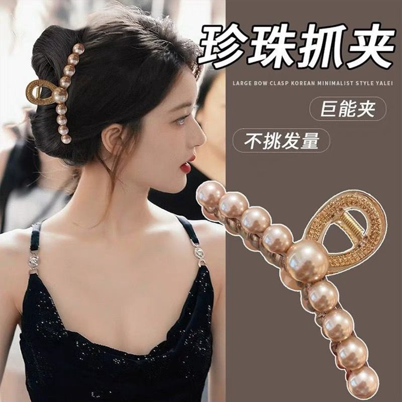 轻奢高级感咖色珍珠水钻抓夹女后脑勺盘发鲨鱼夹大号发夹头饰发卡