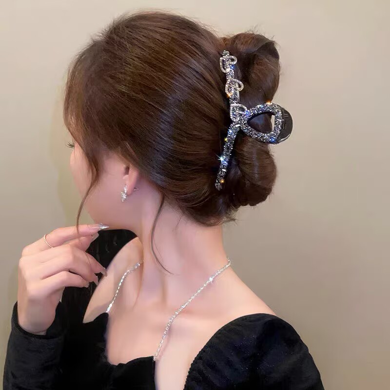高级感缎面大号黑色蝴蝶结鲨鱼夹头饰方形钻后脑勺发夹抓夹女发卡