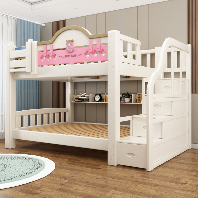 • 핑크 흰색 이중 사다리 책장 서랍 매트리스 설치