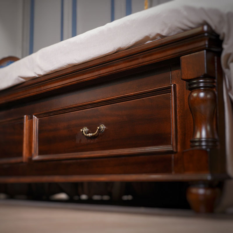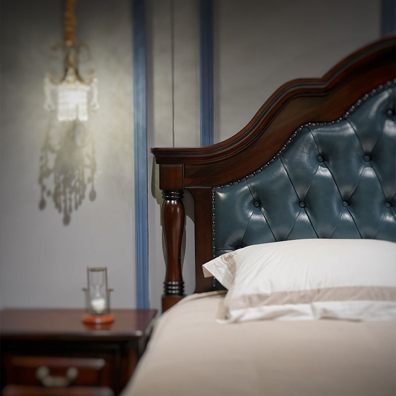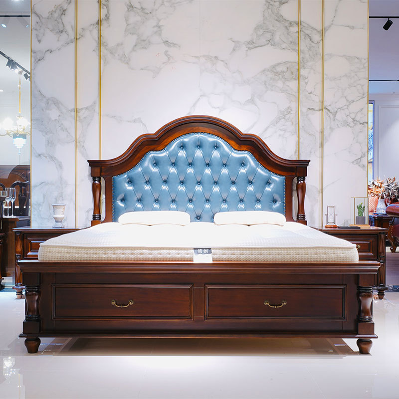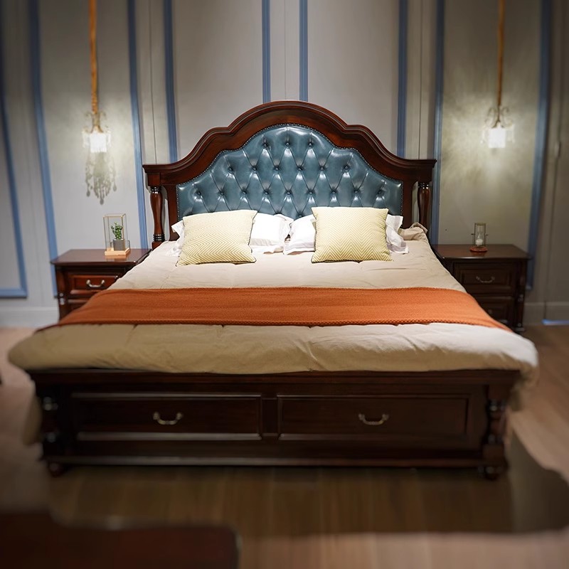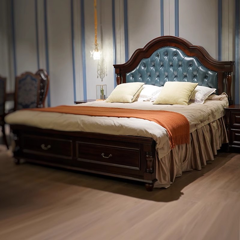 빌라 아메리칸 스타일 정품 가죽 레트로 솔리드 우드 블라썸 코어 우드 더블 침대 마스터 침실 소프트 백 아메리칸 스타일 라이트 럭셔리 침대스토어 가기
