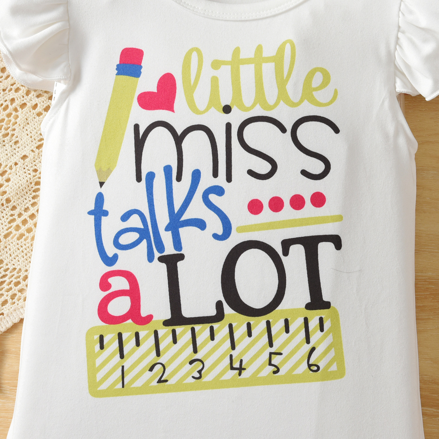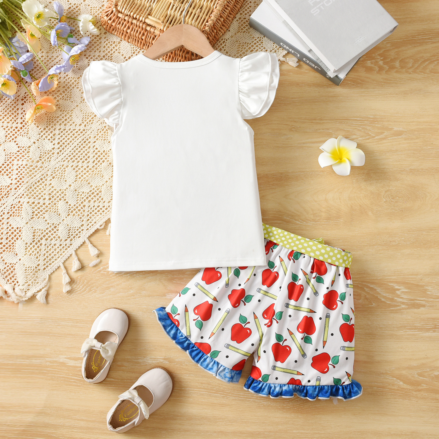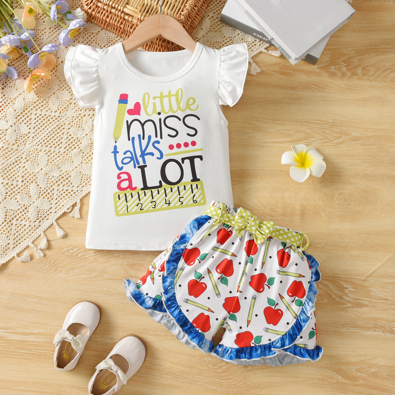 학교 시즌 캐주얼 서양식 소녀의 편지 인쇄 비행 소매 반팔 티셔츠 러플 반바지 벨트 세트