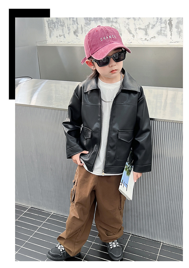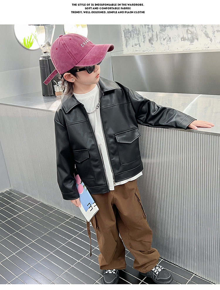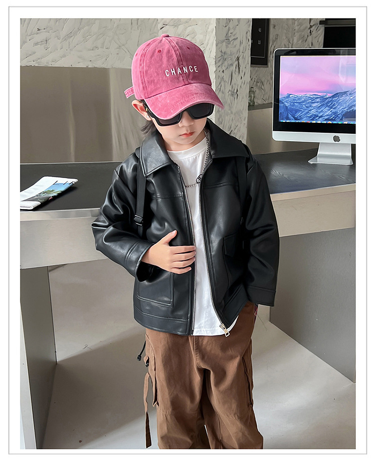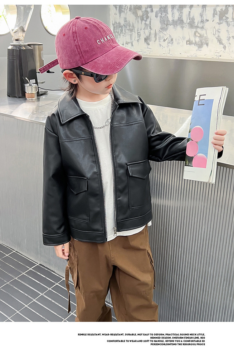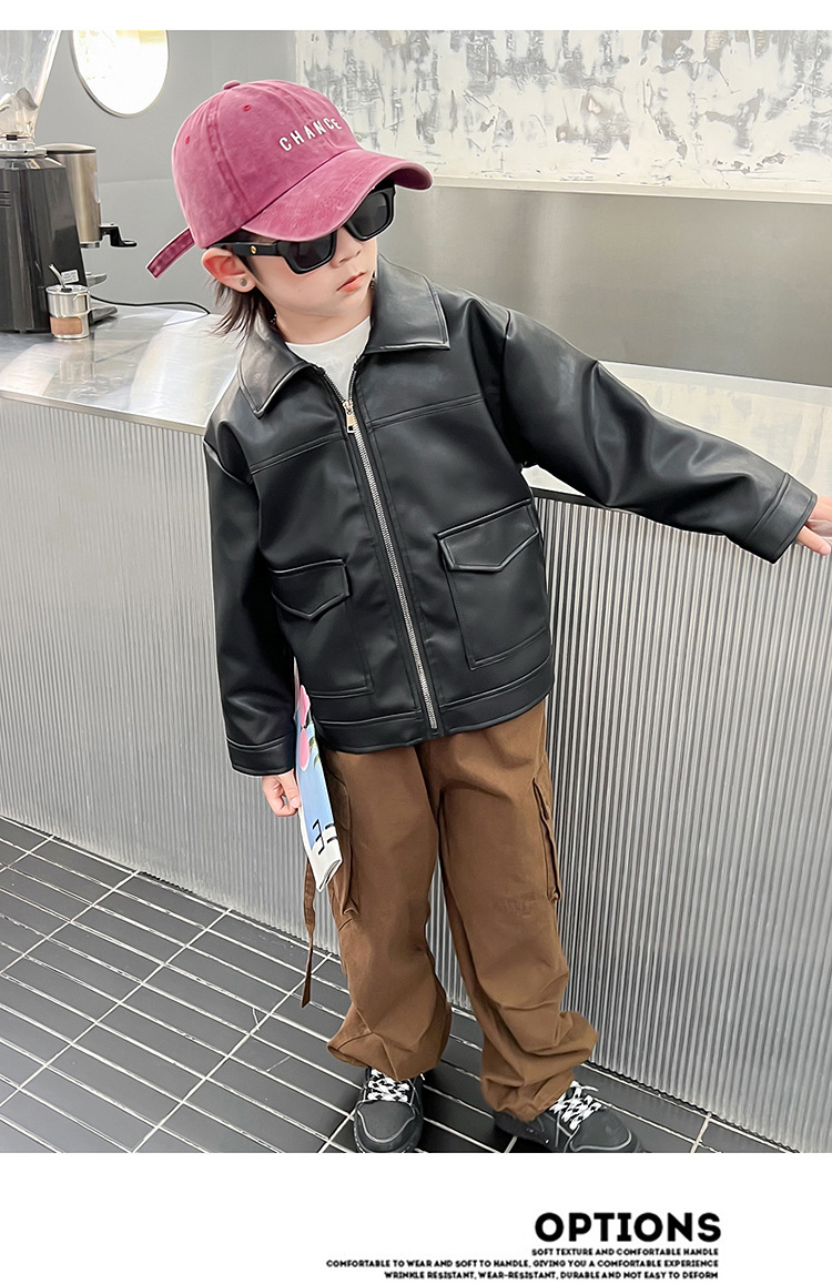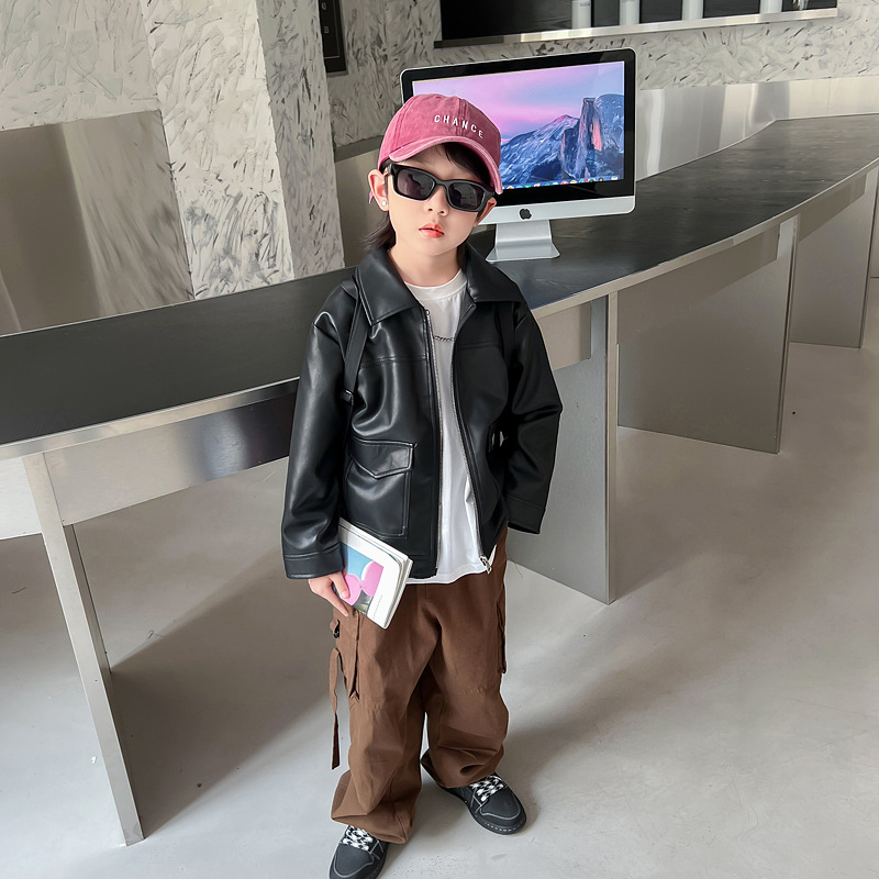 소년의 가을 가죽 자켓 2024 봄과 가을 새로운 어린이 오토바이 스타일 가죽 자켓 아기의 옷깃 최고 유행스토어 가기