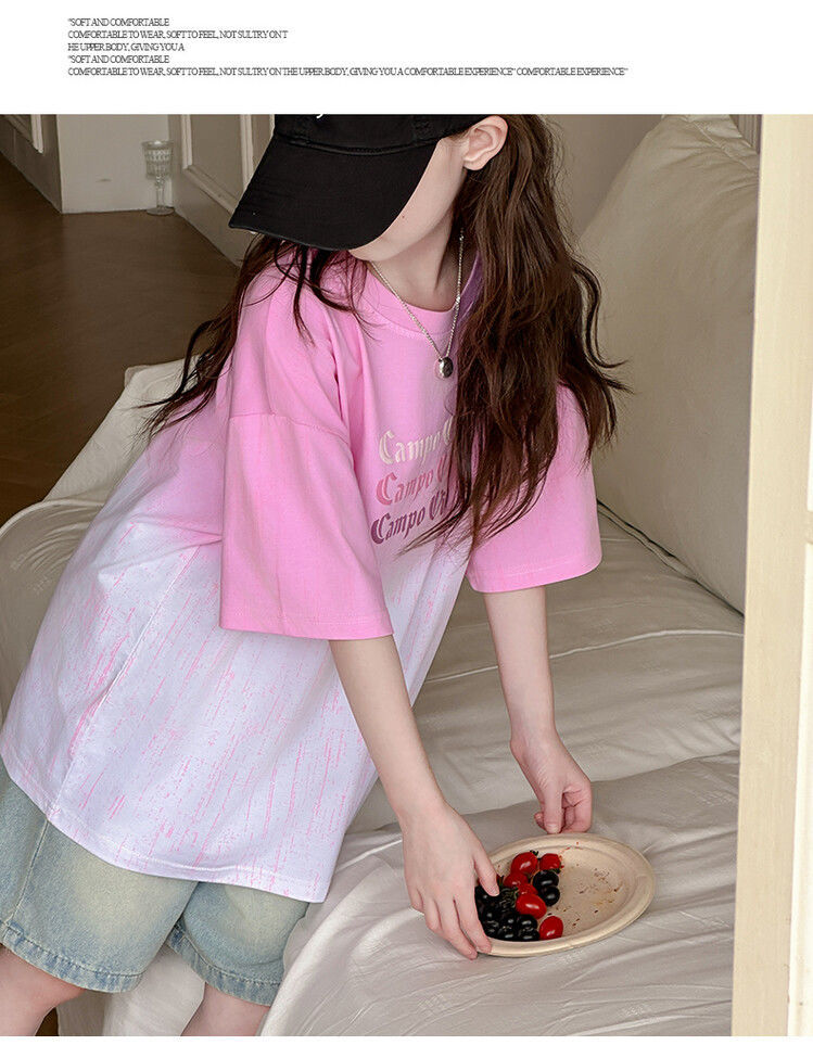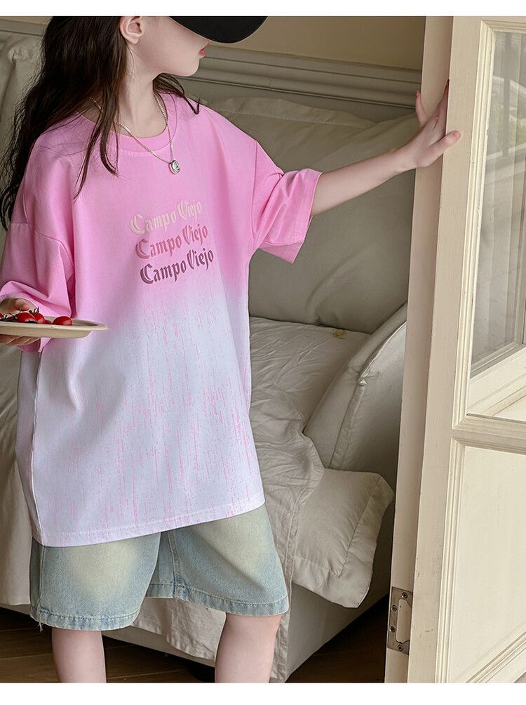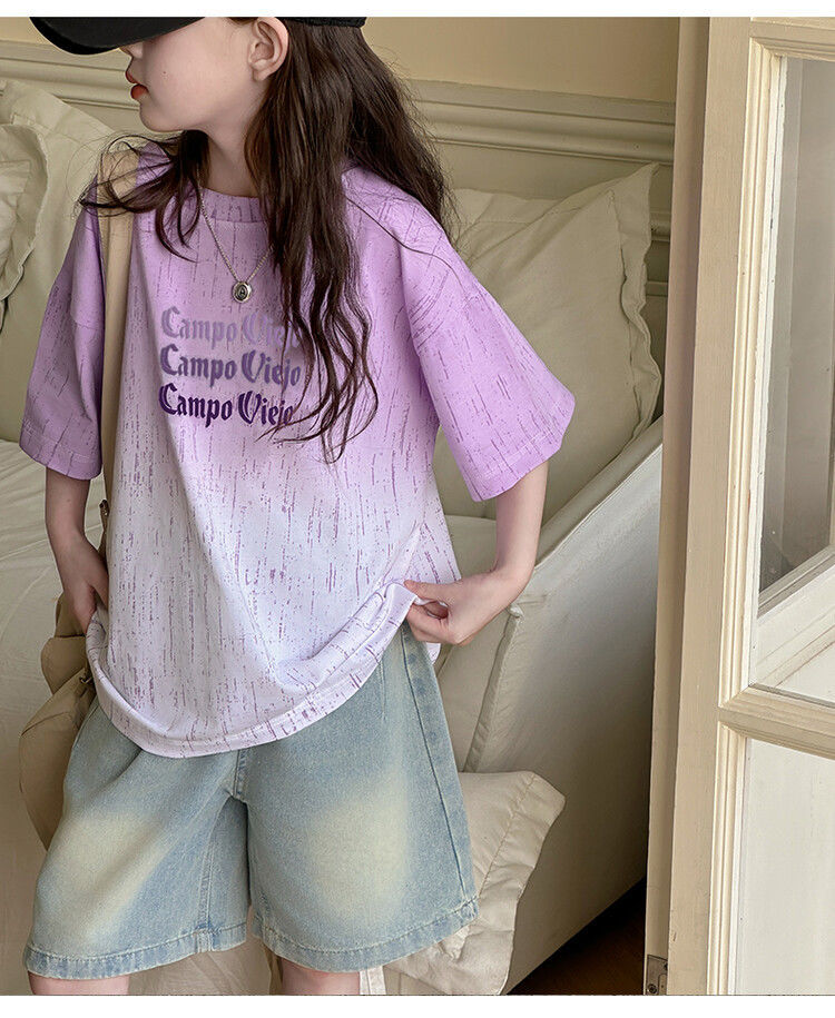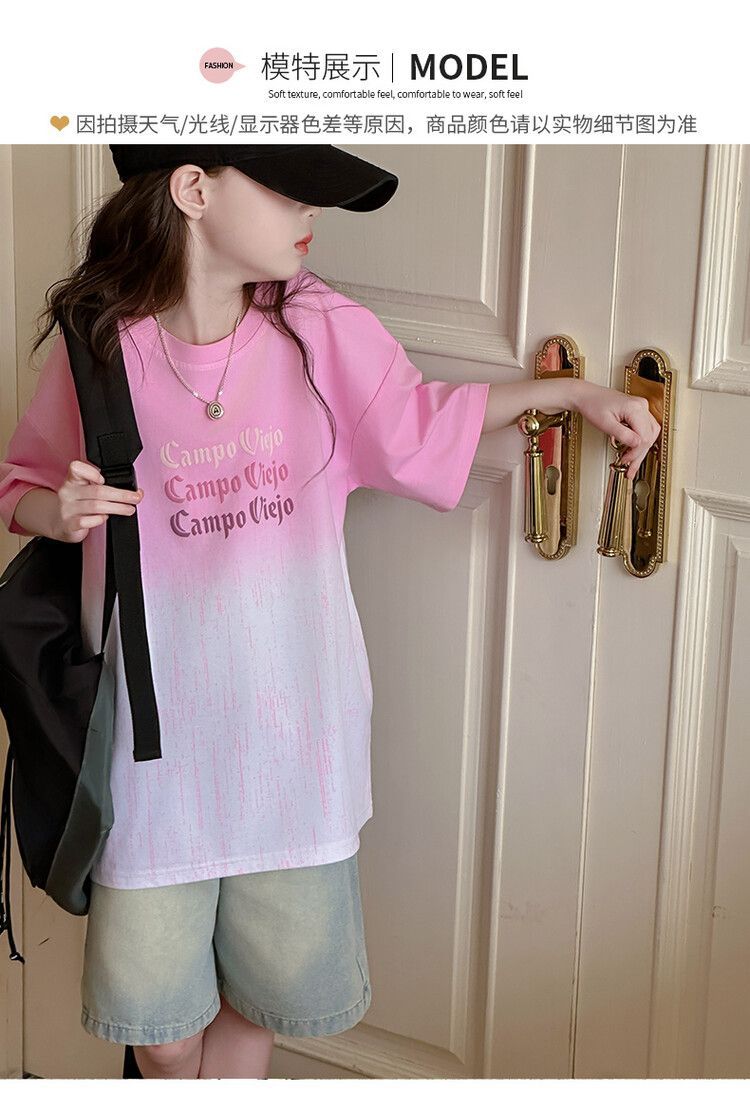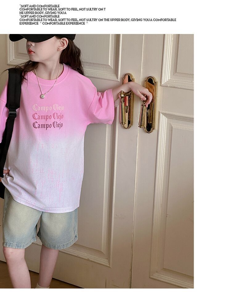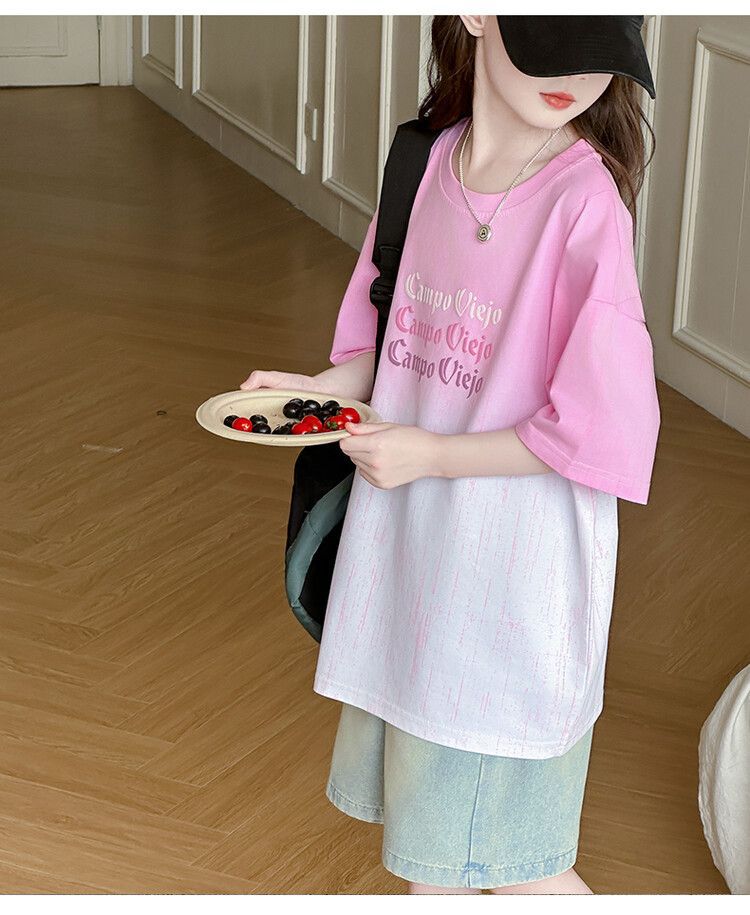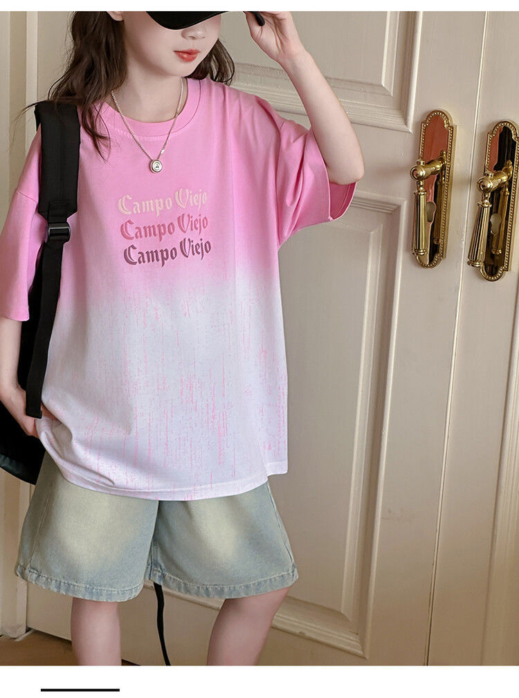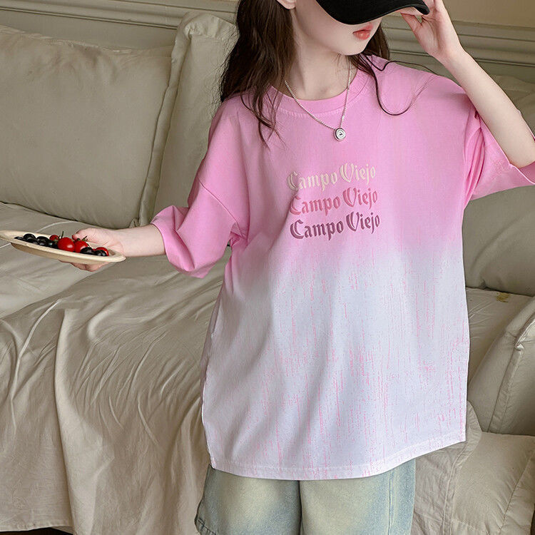 여자 반팔 티셔츠 2025 새로운 스타일 여자 여름 옷 어린이 인터넷 연예인 유행 탑 여름 그라데이션 반팔 티셔츠스토어 가기