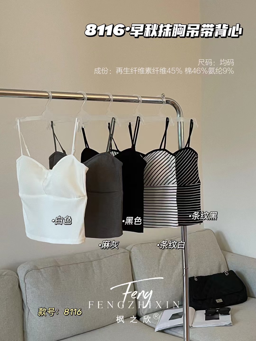 8116 줄무늬 Camisole 여성의 새로운 섹시한 아름다운 뒷면 외부 착용 내베이스 탑 스레드 고정 컵 조정스토어 가기