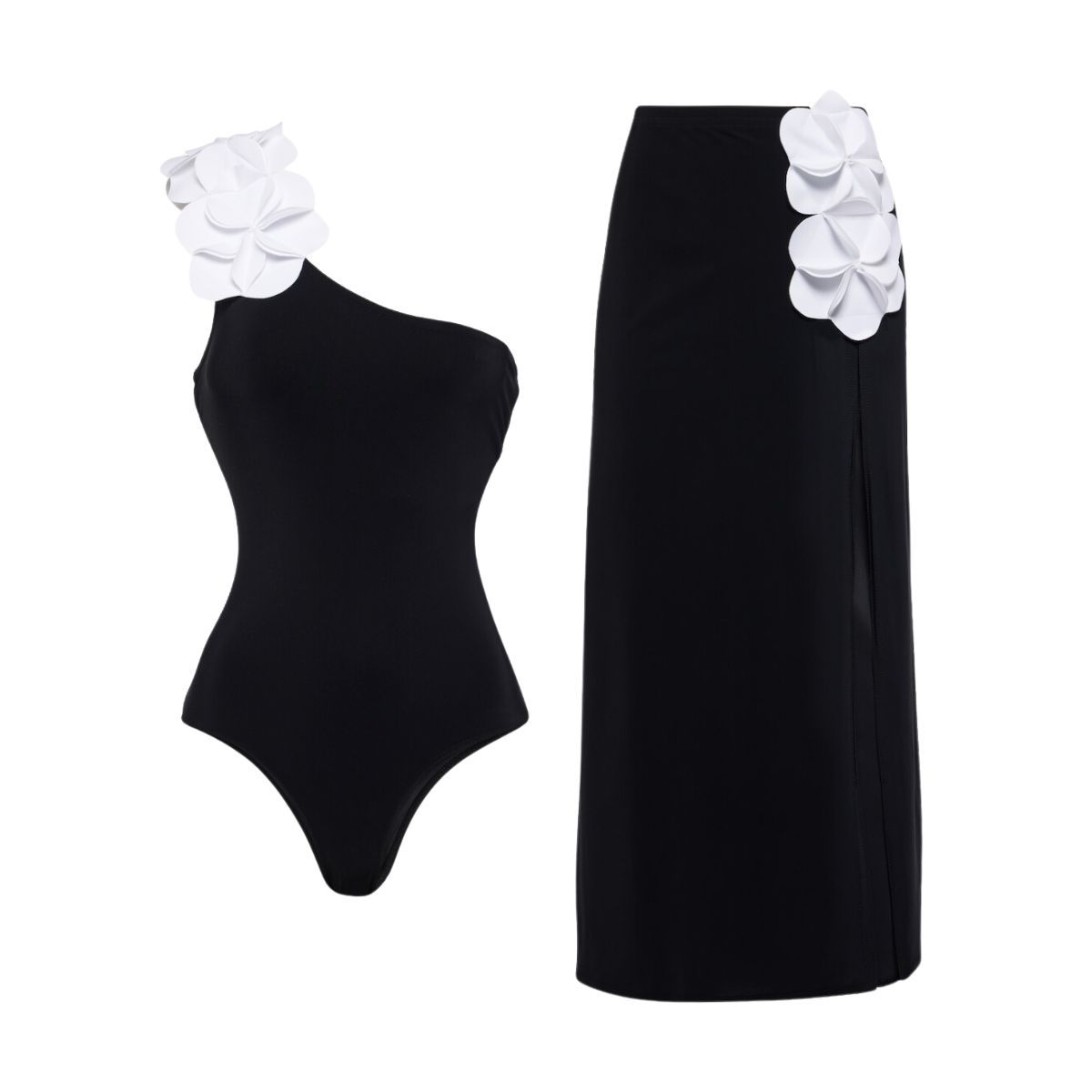 2024 유럽과 미국의 새로운 아마존 AliExpress 흑백 대조 컬러 간단한 꽃 장식 비스듬한 어깨 수영복 여성 의류