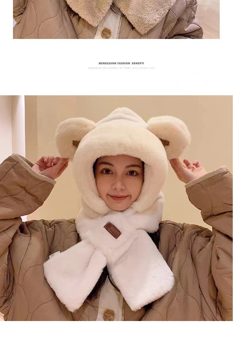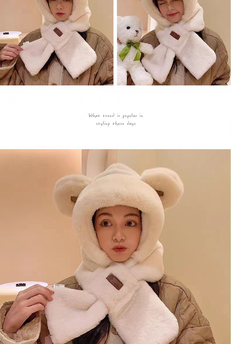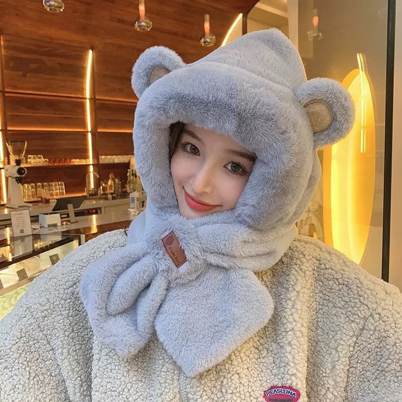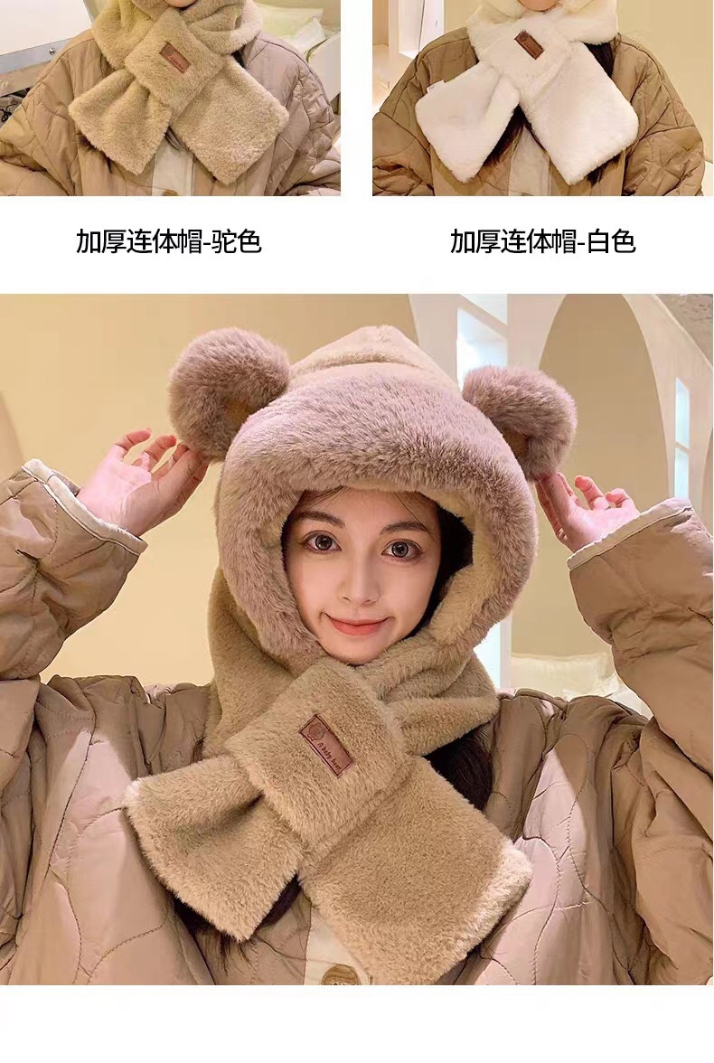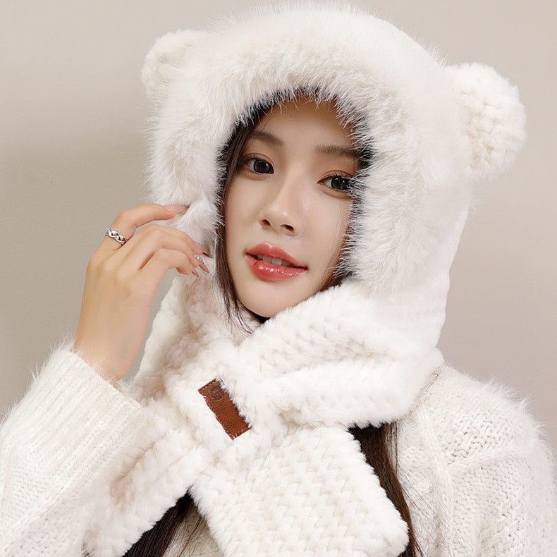 작은 여우 모양 모자 스카프 일체형 여성용 털모자 마스크 후드 넥워머 겨울 보온 트렌디 한국 스타일 털복숭이