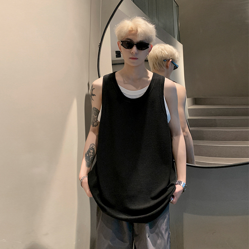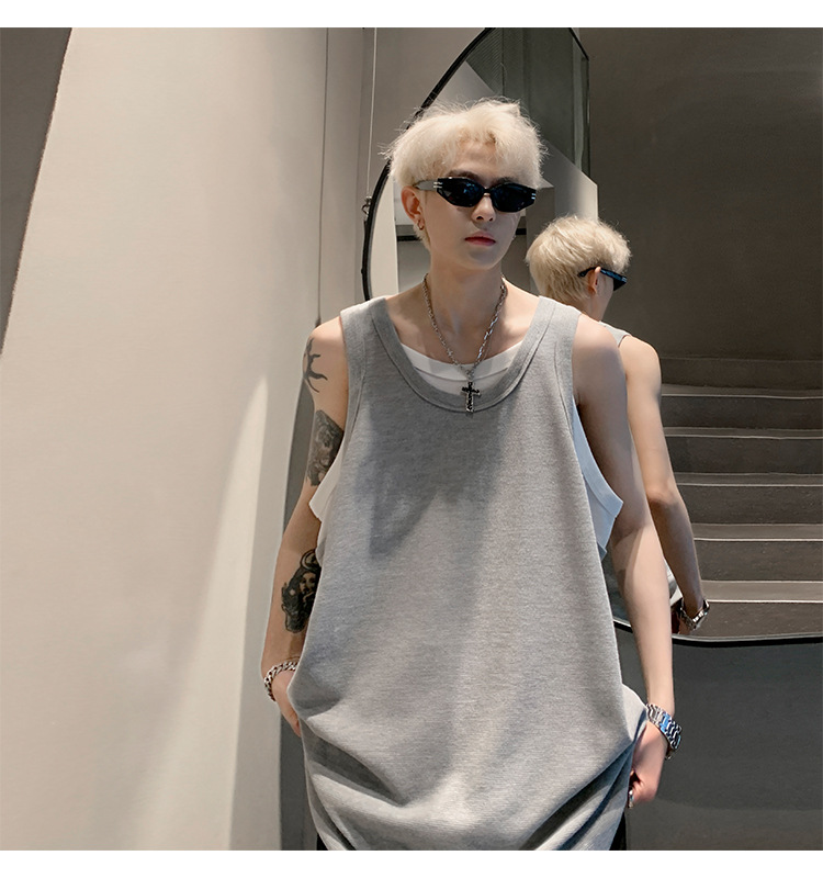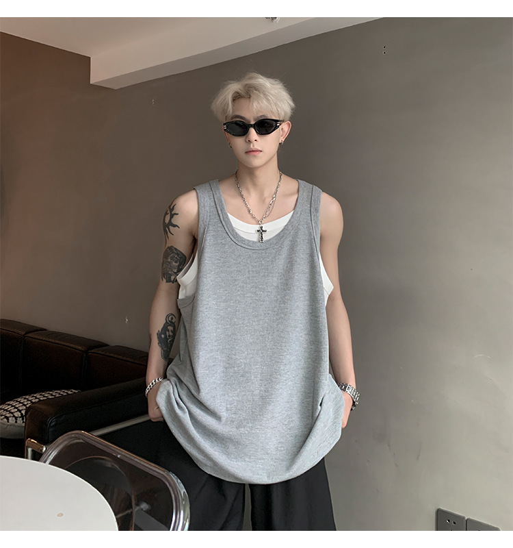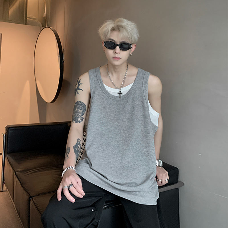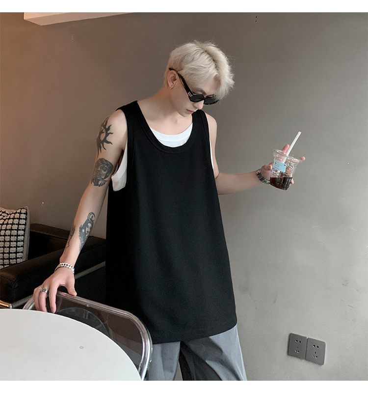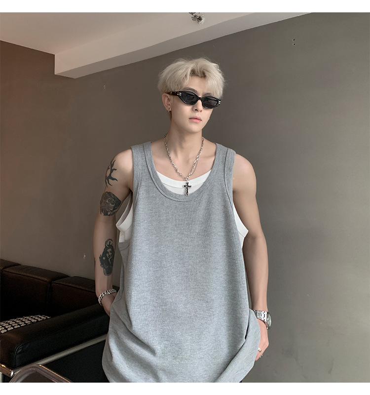미국식 가짜 투피스 조끼 남자 패셔너블 여름 중량형 솔리드 컬러 민소매 티셔츠 느슨하고 잘 생긴 스포츠 왁스 코트